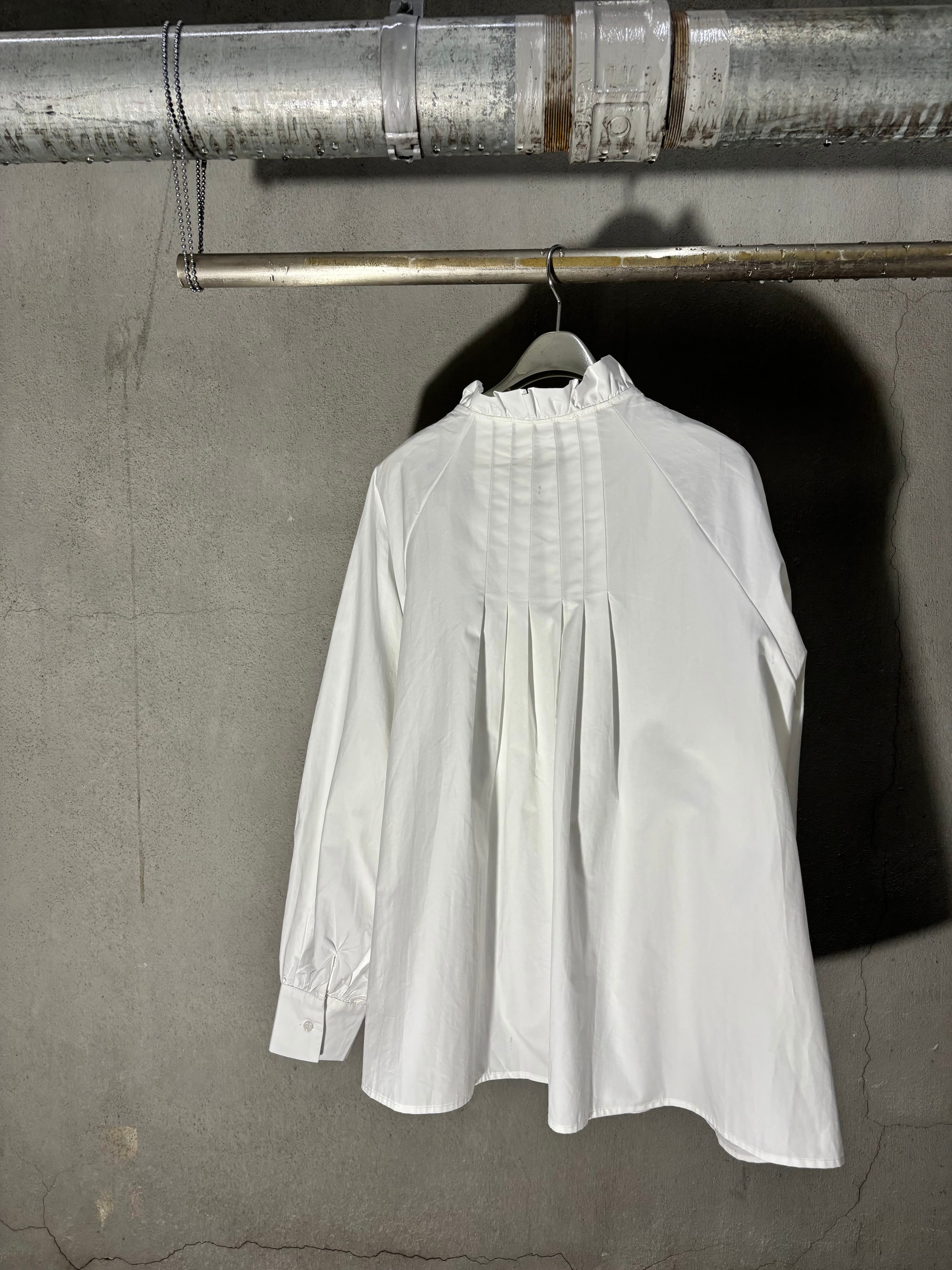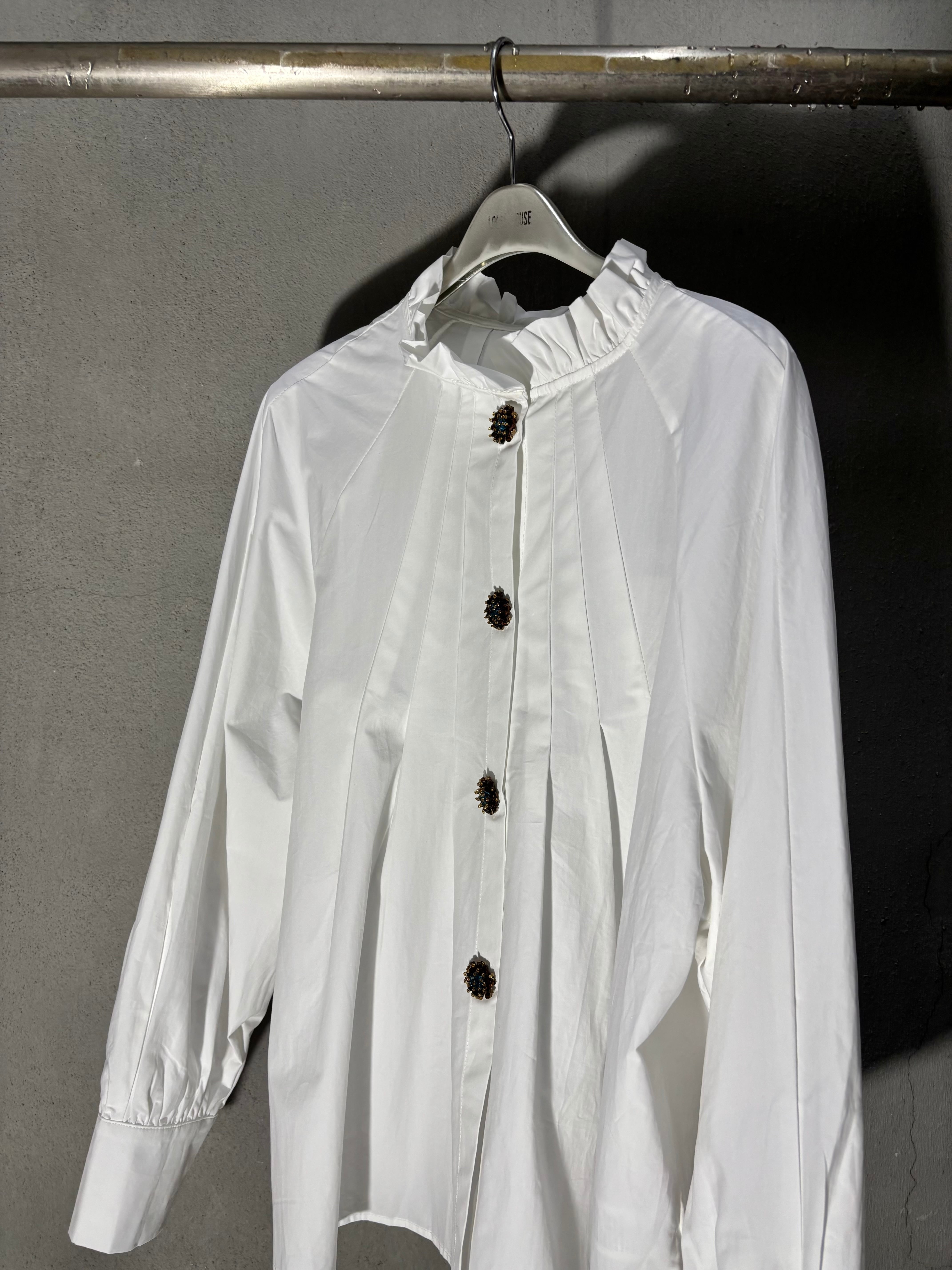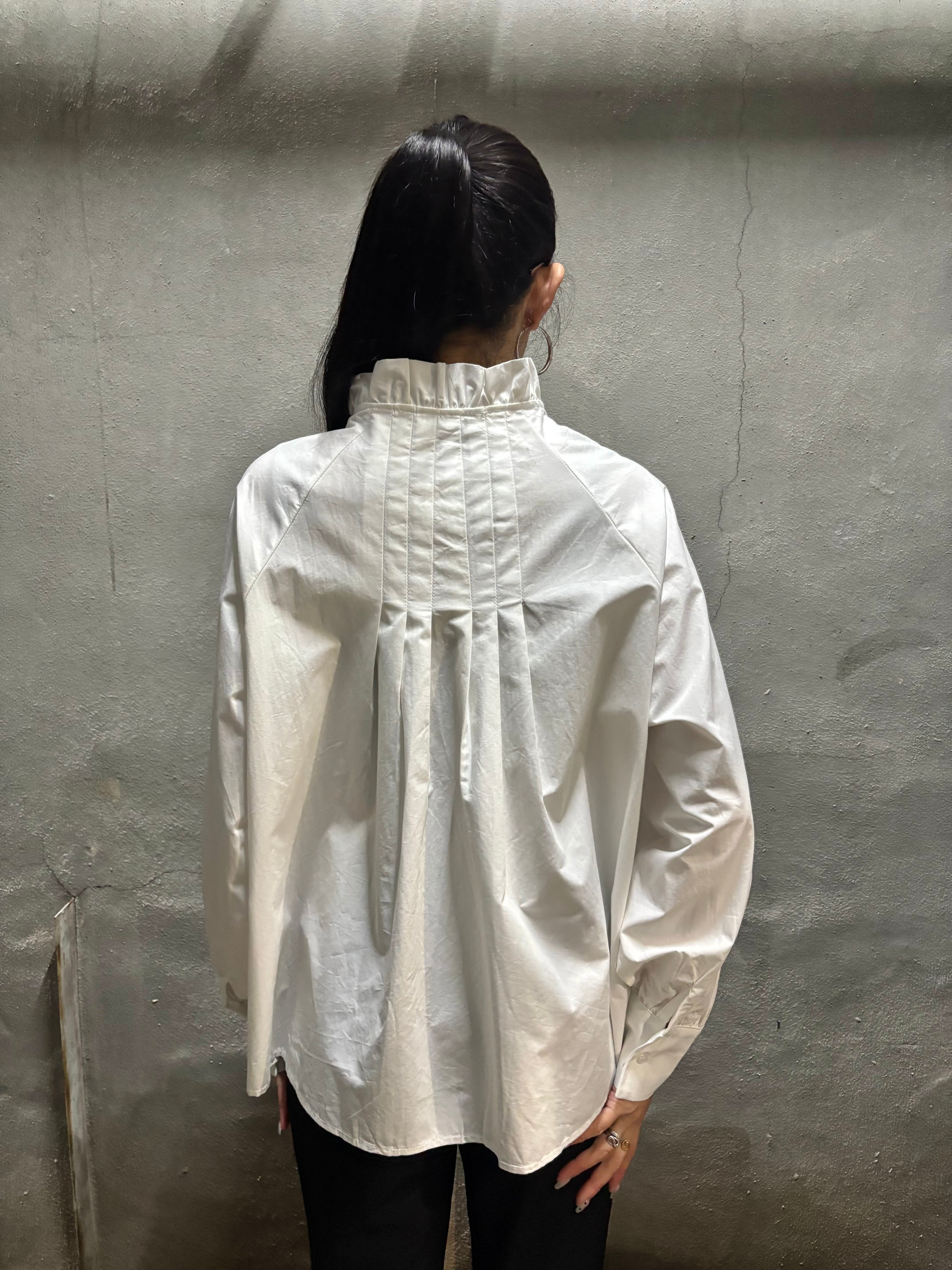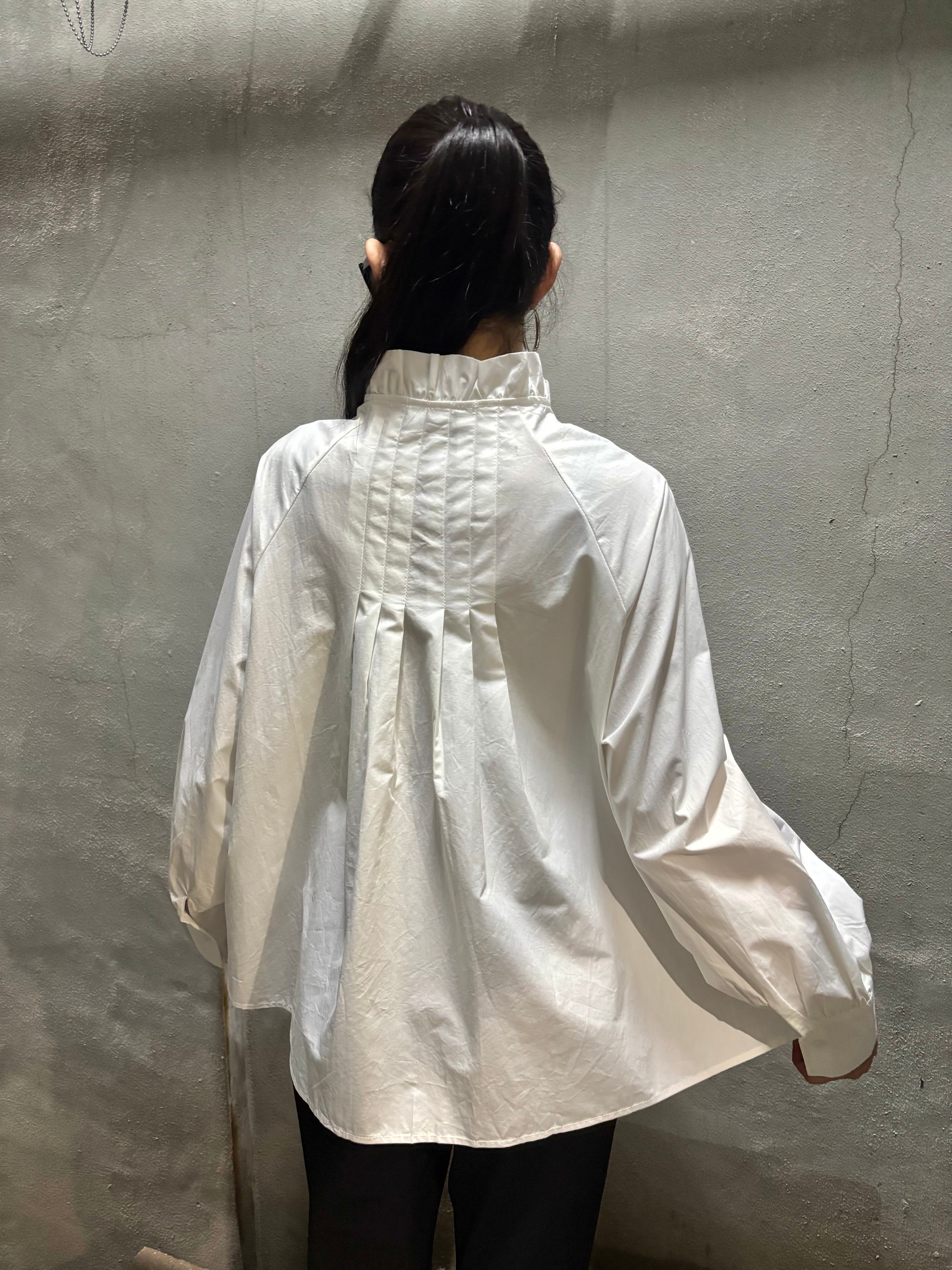 tuck stitch flare × stand frill neck design shirt tunic シャツ チュニック 布帛 タック フレア ボタン ホワイト