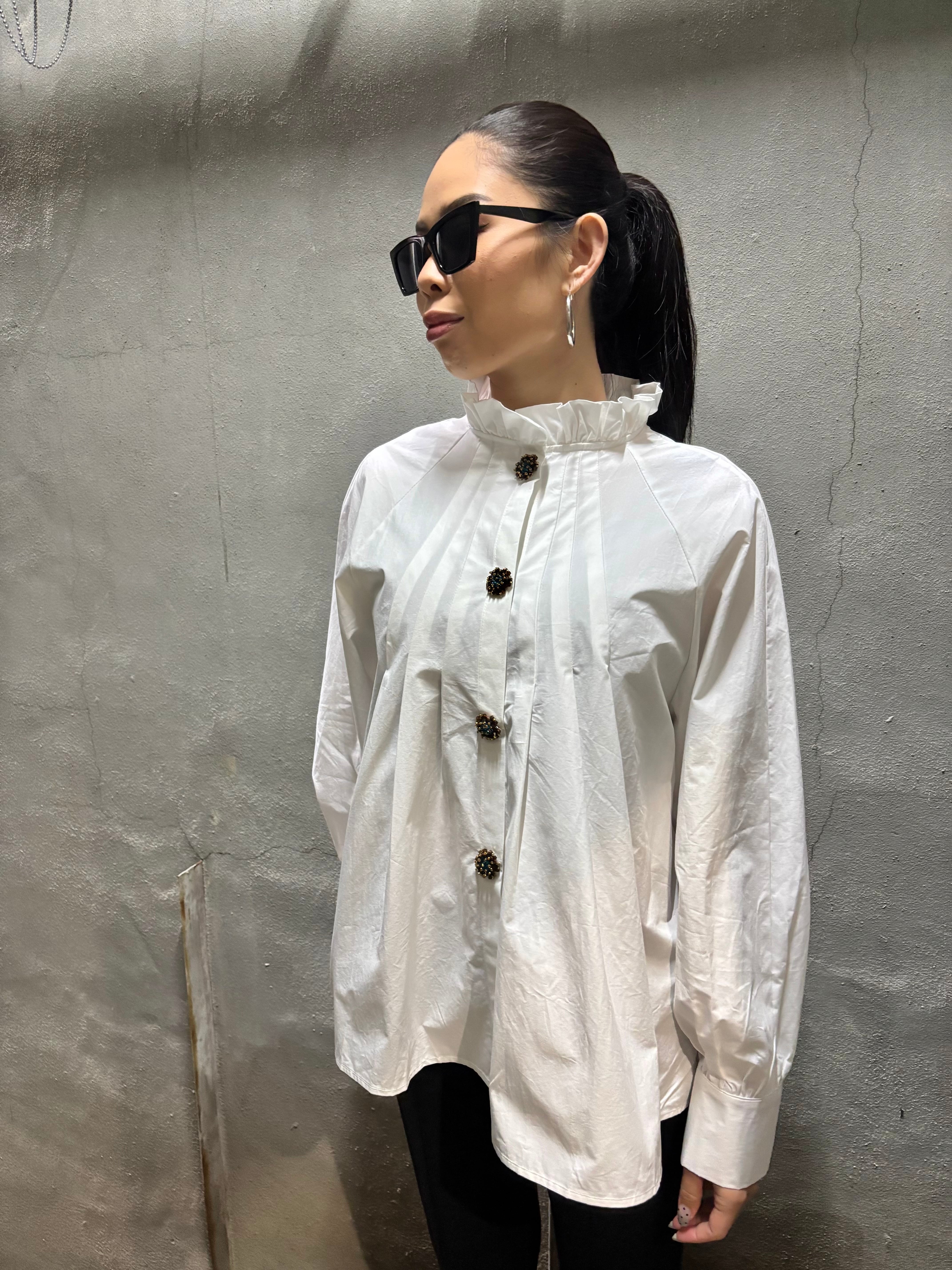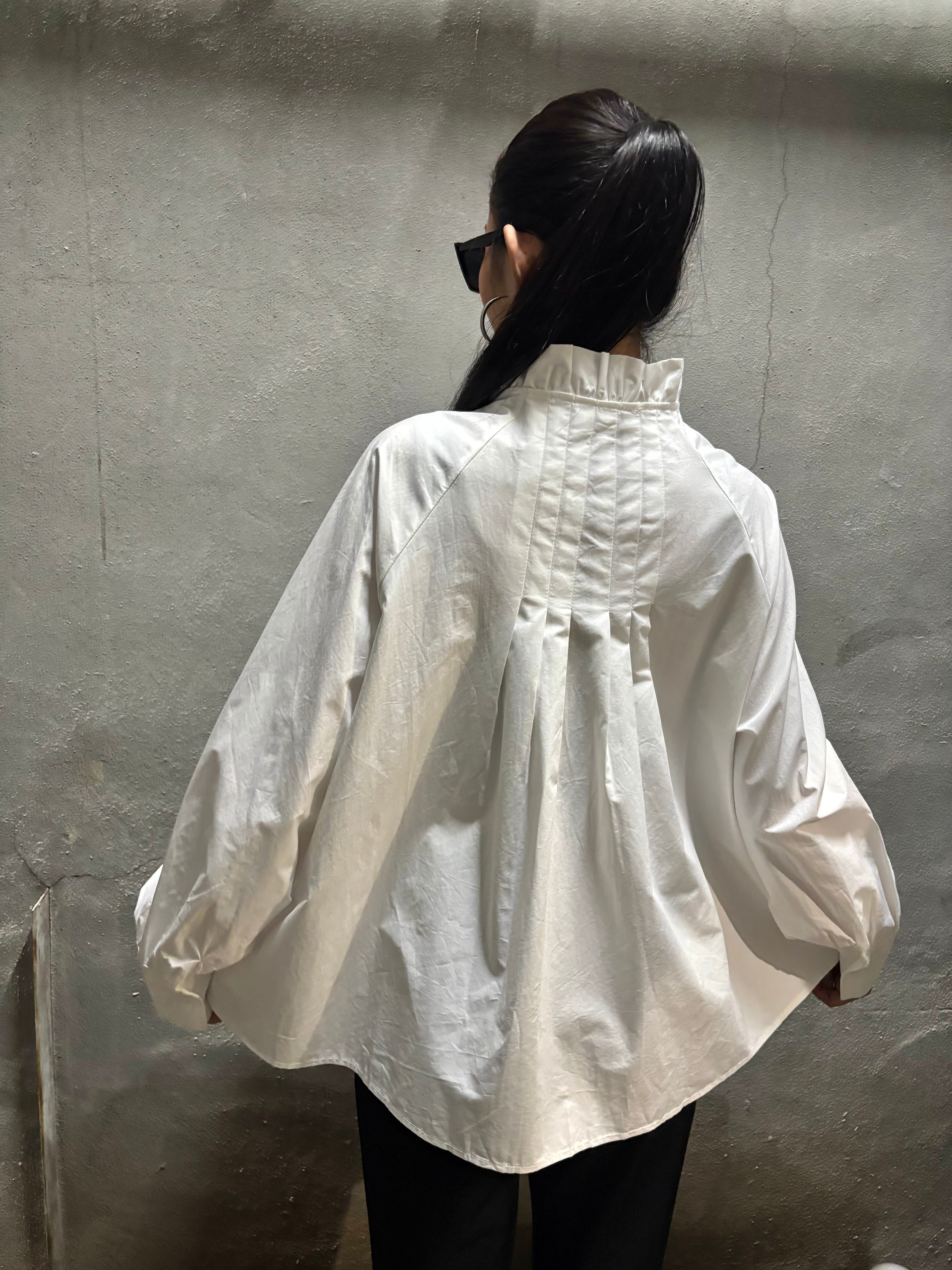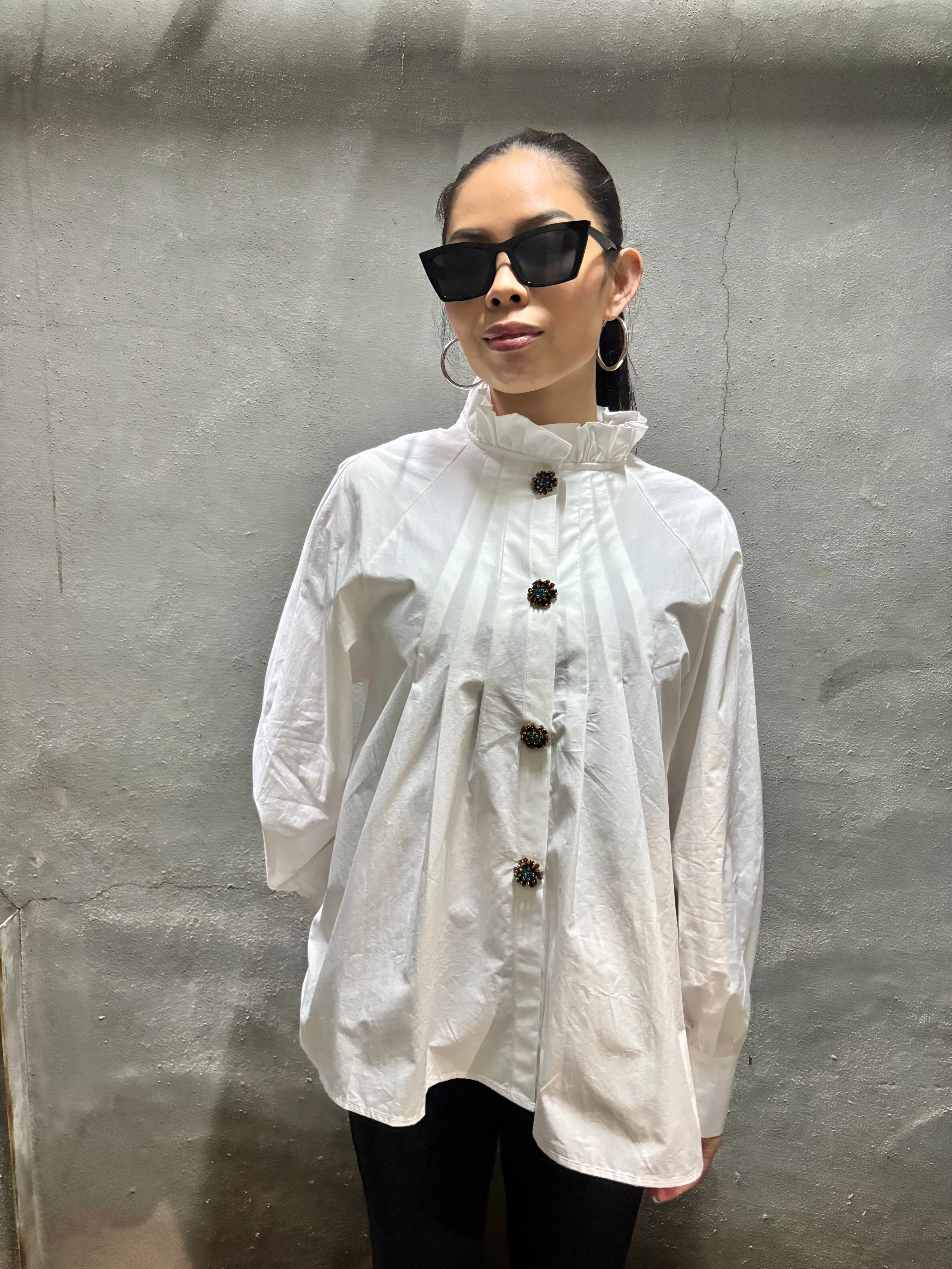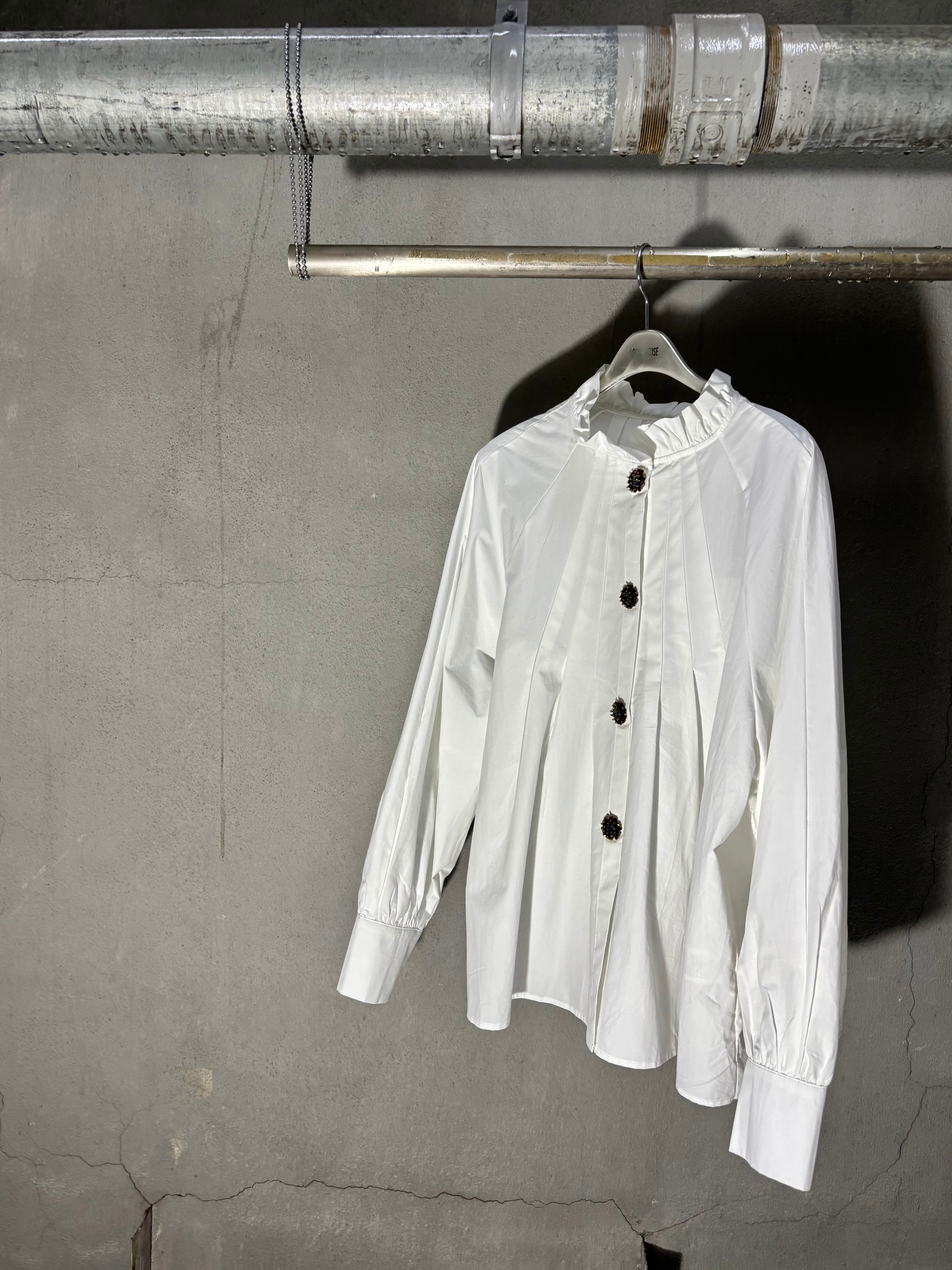 tuck stitch flare × stand frill neck design shirt tunic シャツ チュニック 布帛 タック フレア ボタン ホワイト