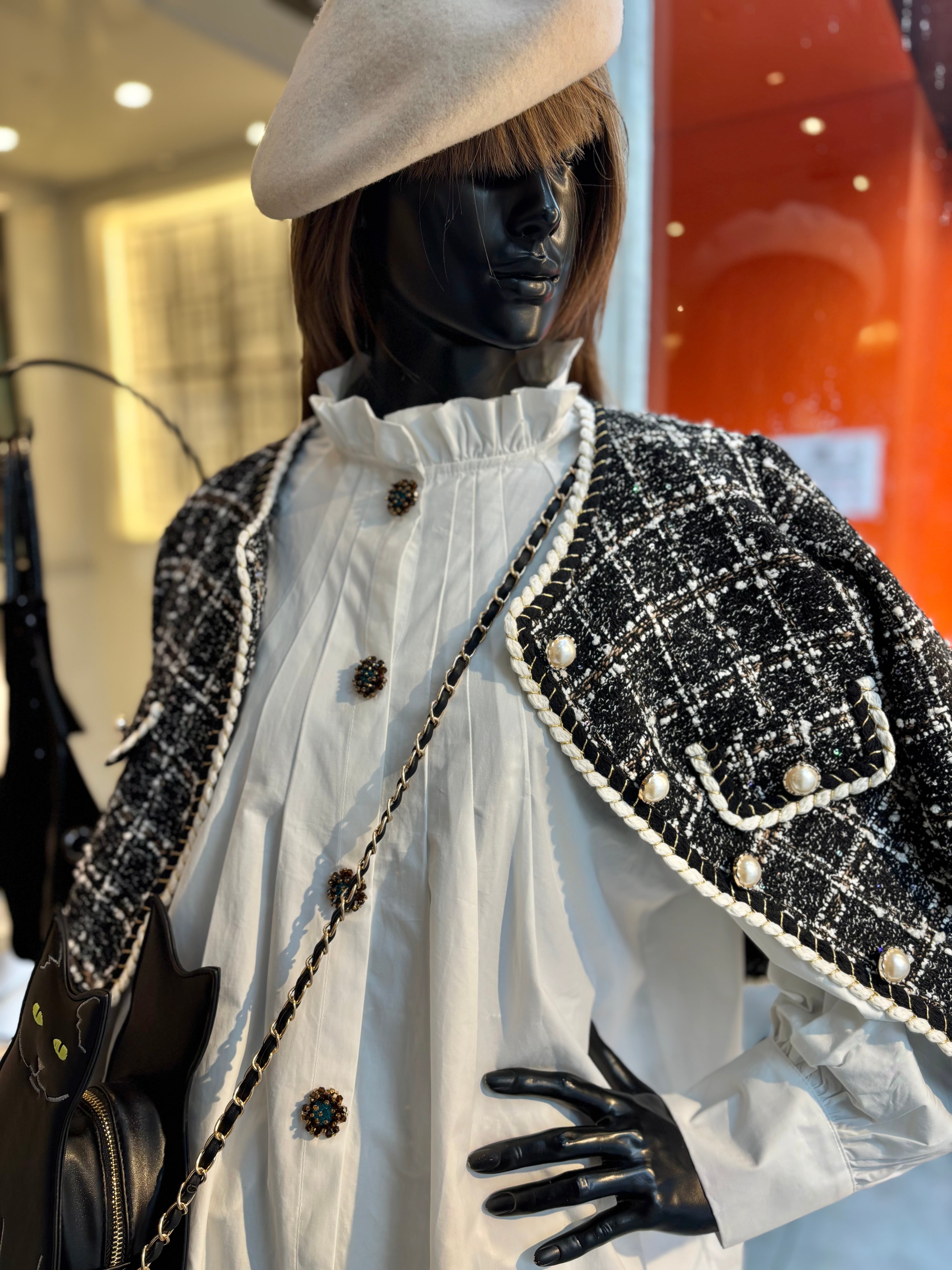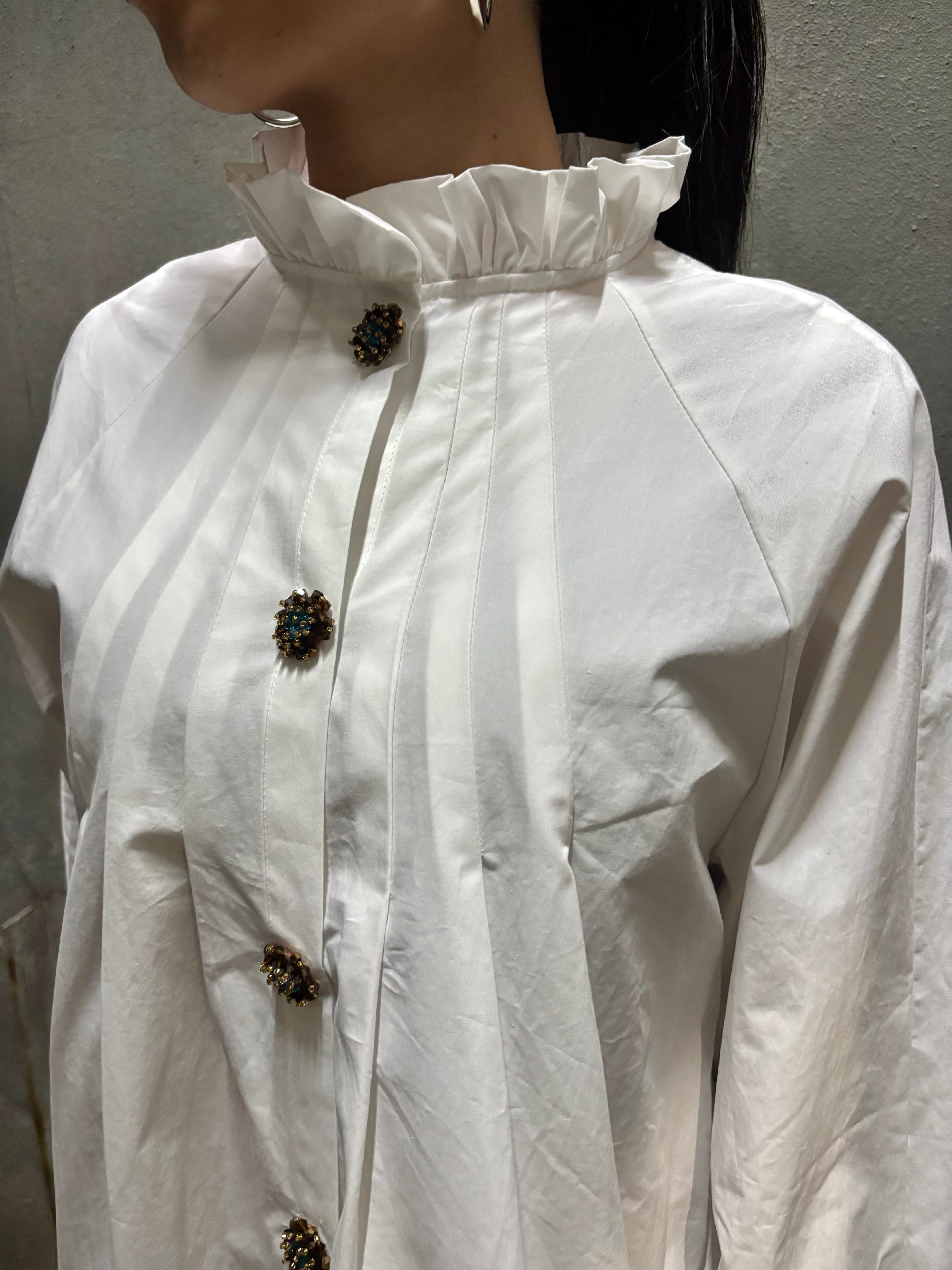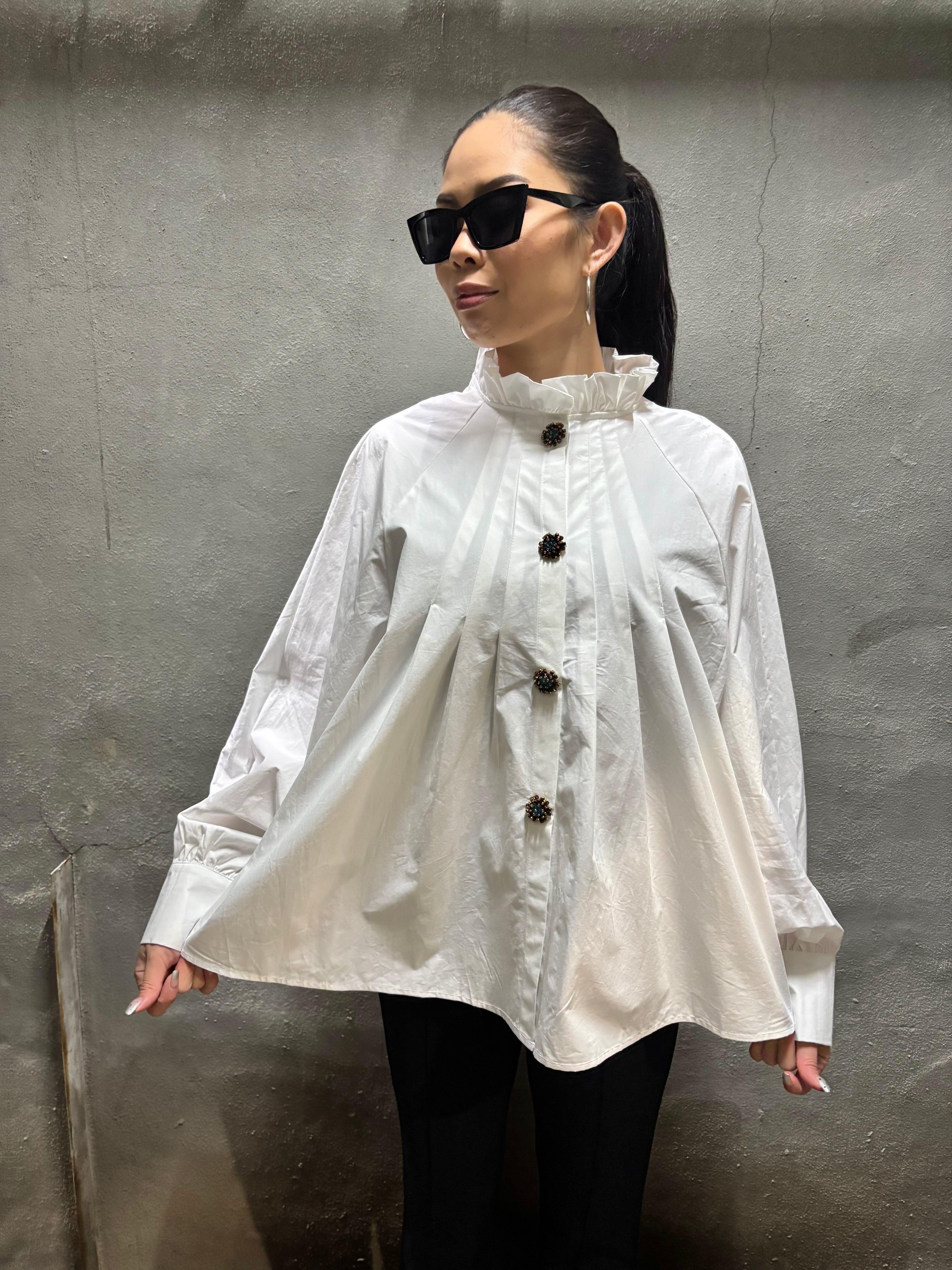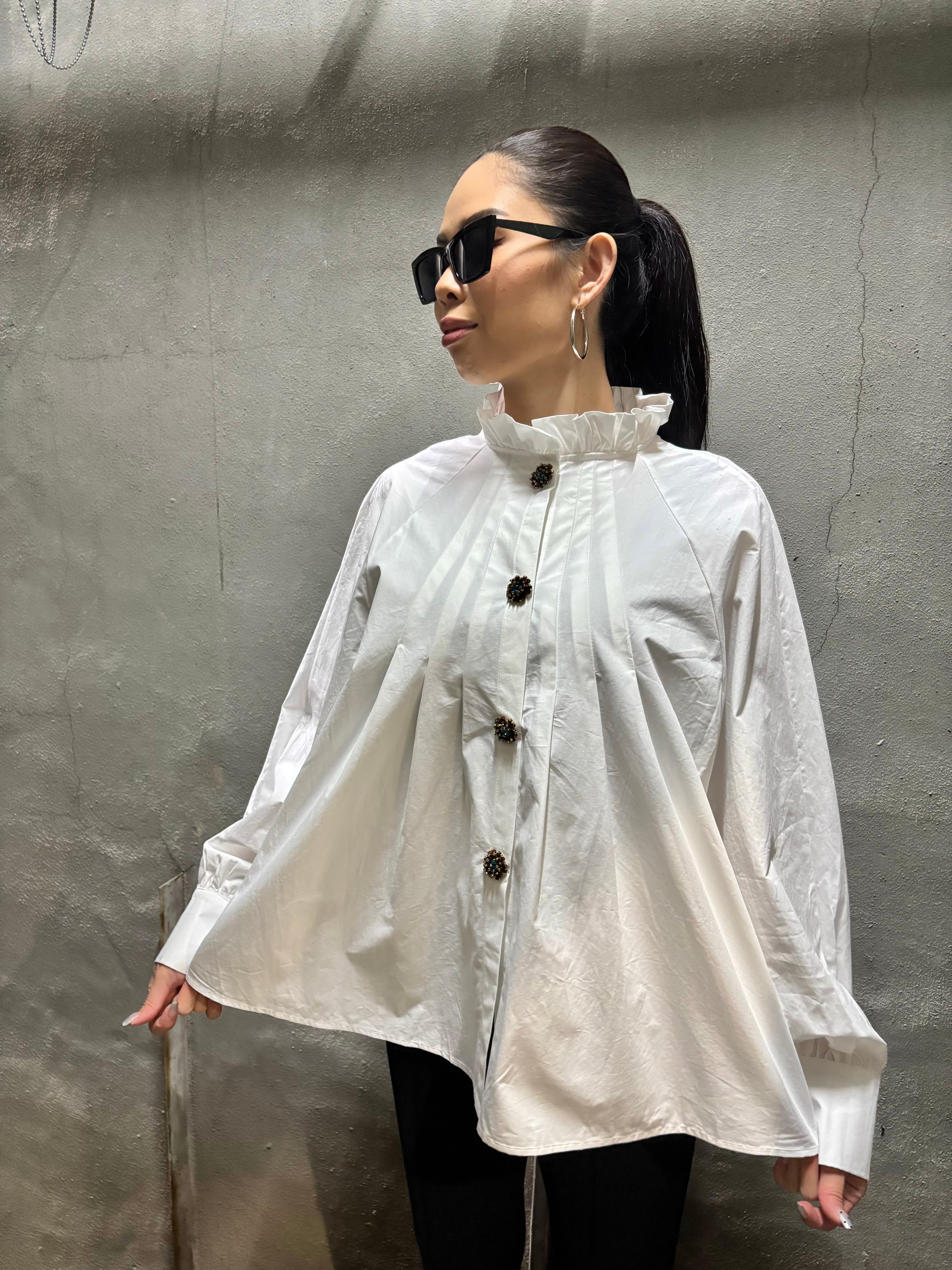 tuck stitch flare × stand frill neck design shirt tunic シャツ チュニック 布帛 タック フレア ボタン ホワイト