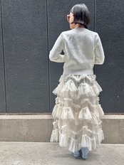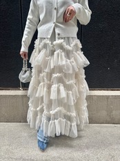 チュールとフリルの絶妙なコンビネーションが魅力のロングスカートです。軽やかなチュール素材が揺れるたびに、女性らしさを引き立て、さらにゴムウエストで快適な着心地を実現しました。カジュアルからエレガントまで、幅広いスタイルにマッチする一着です。