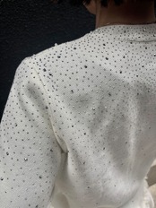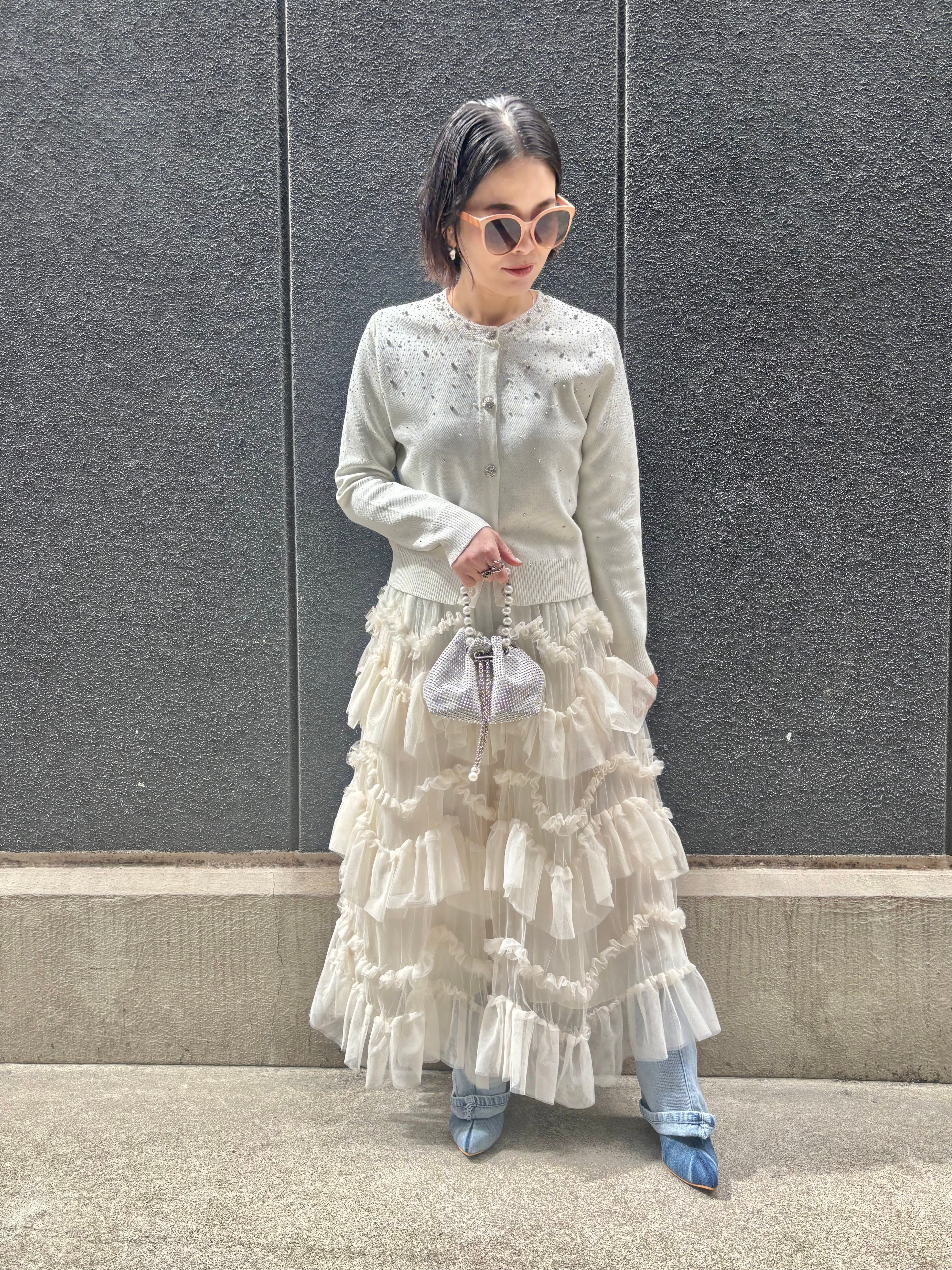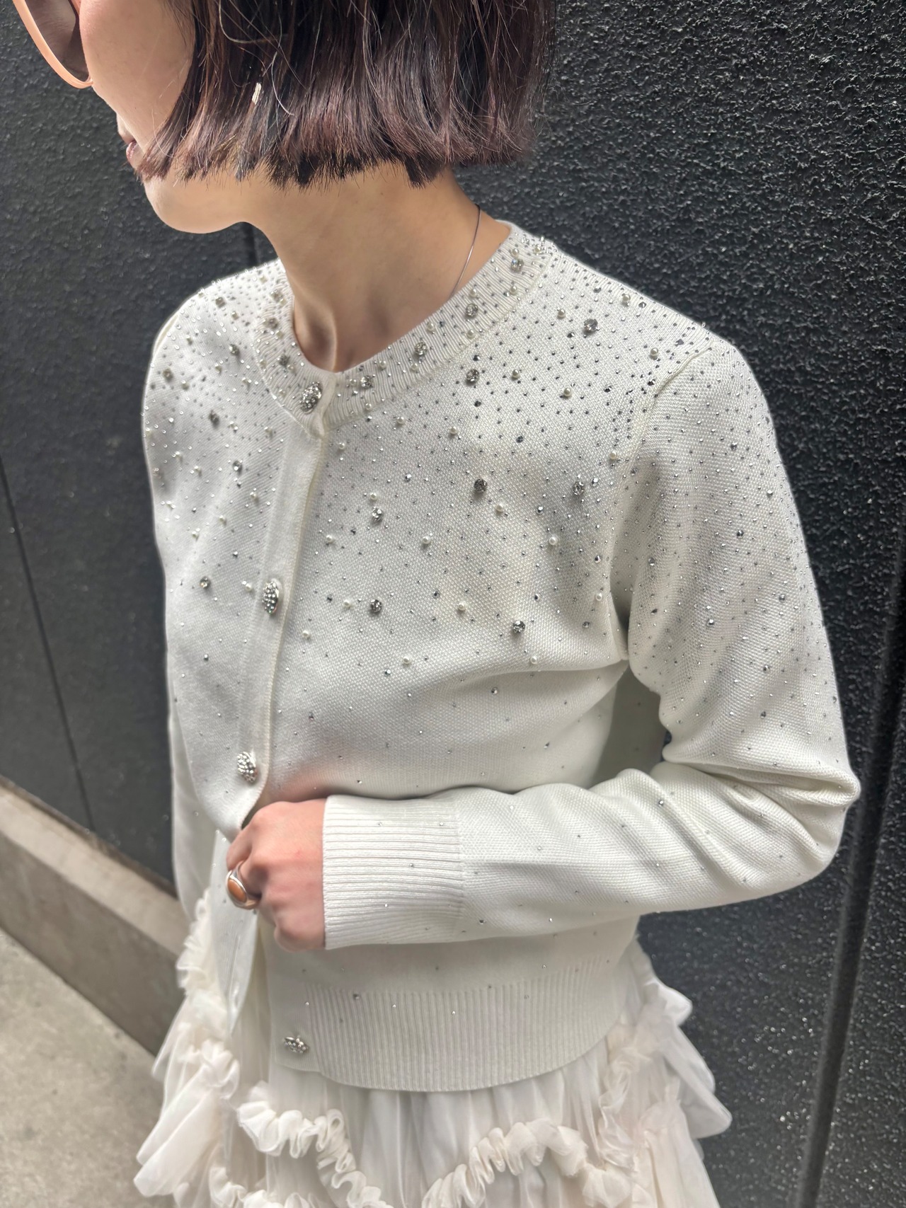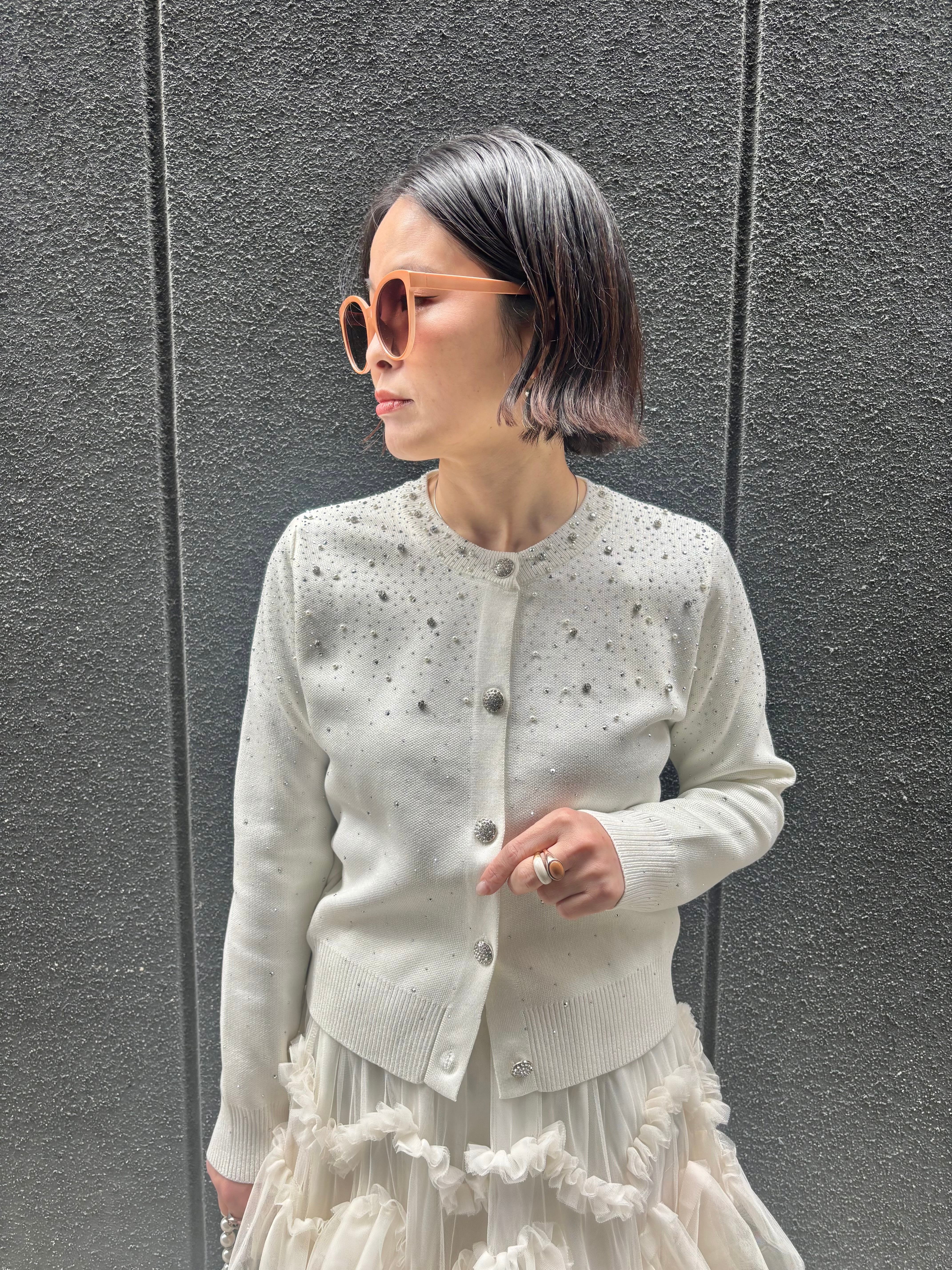 このカーディガンは、ディテールにこだわったデザインで、パールが輝き、華やかな雰囲気を演出します。