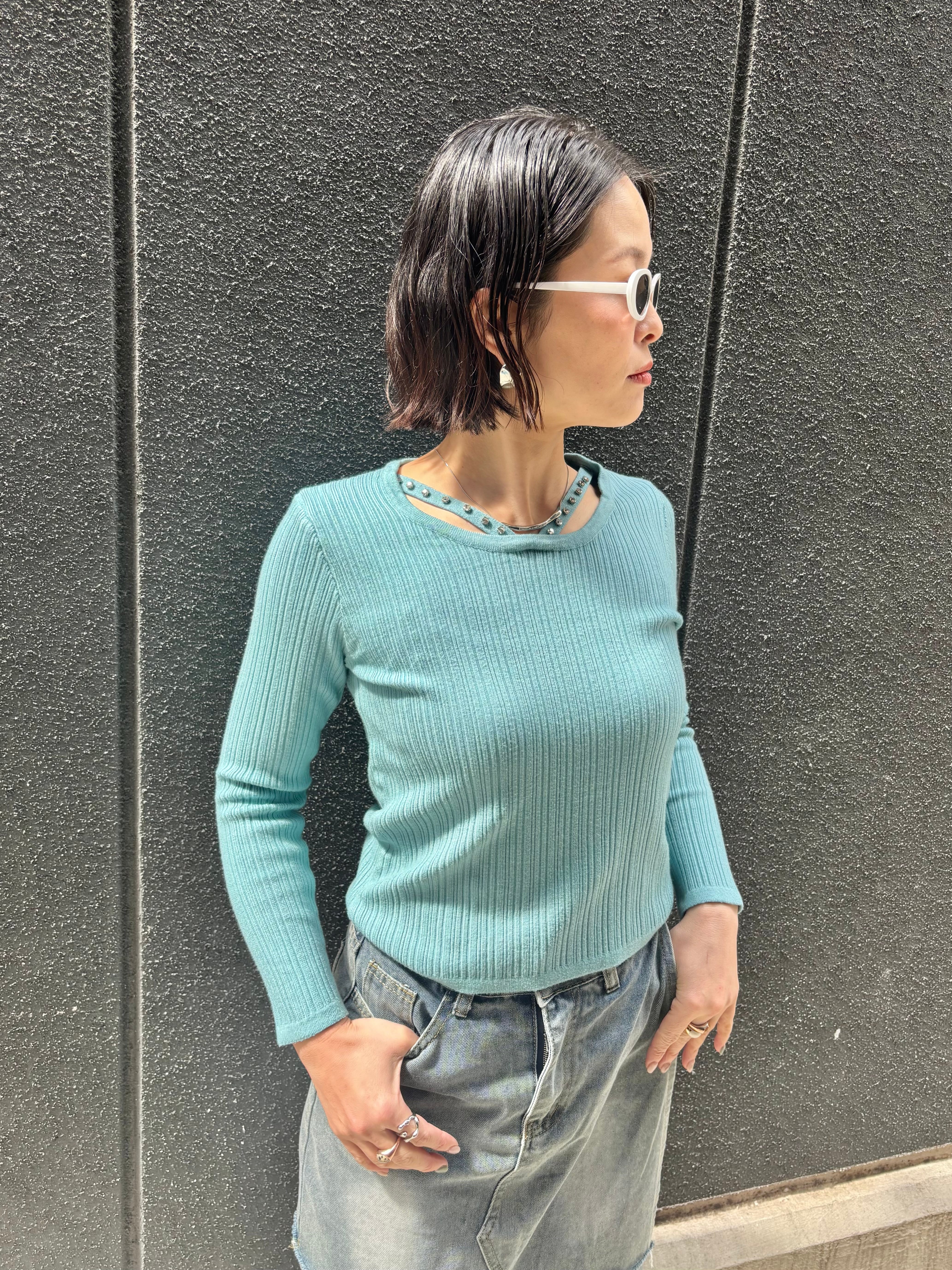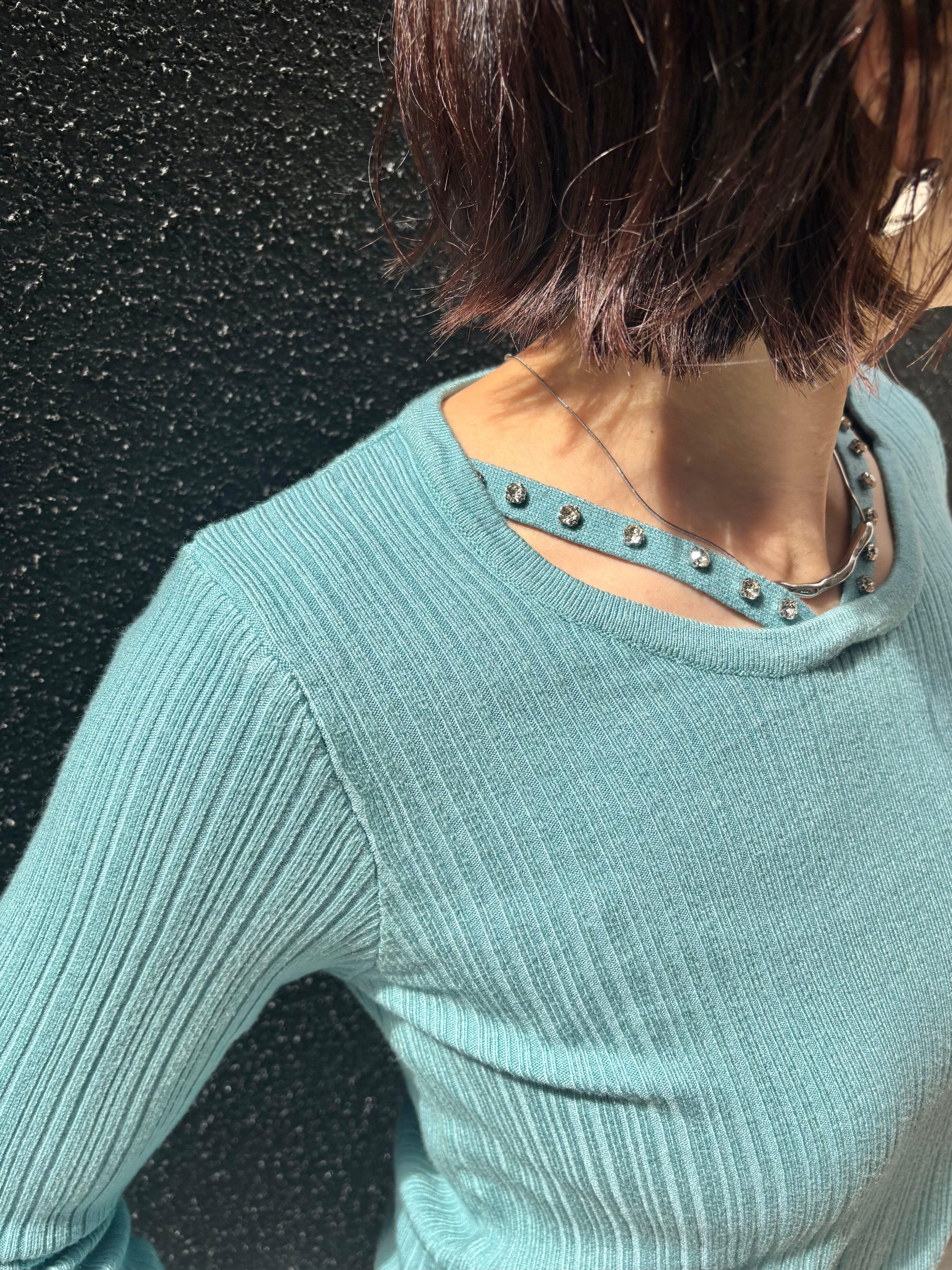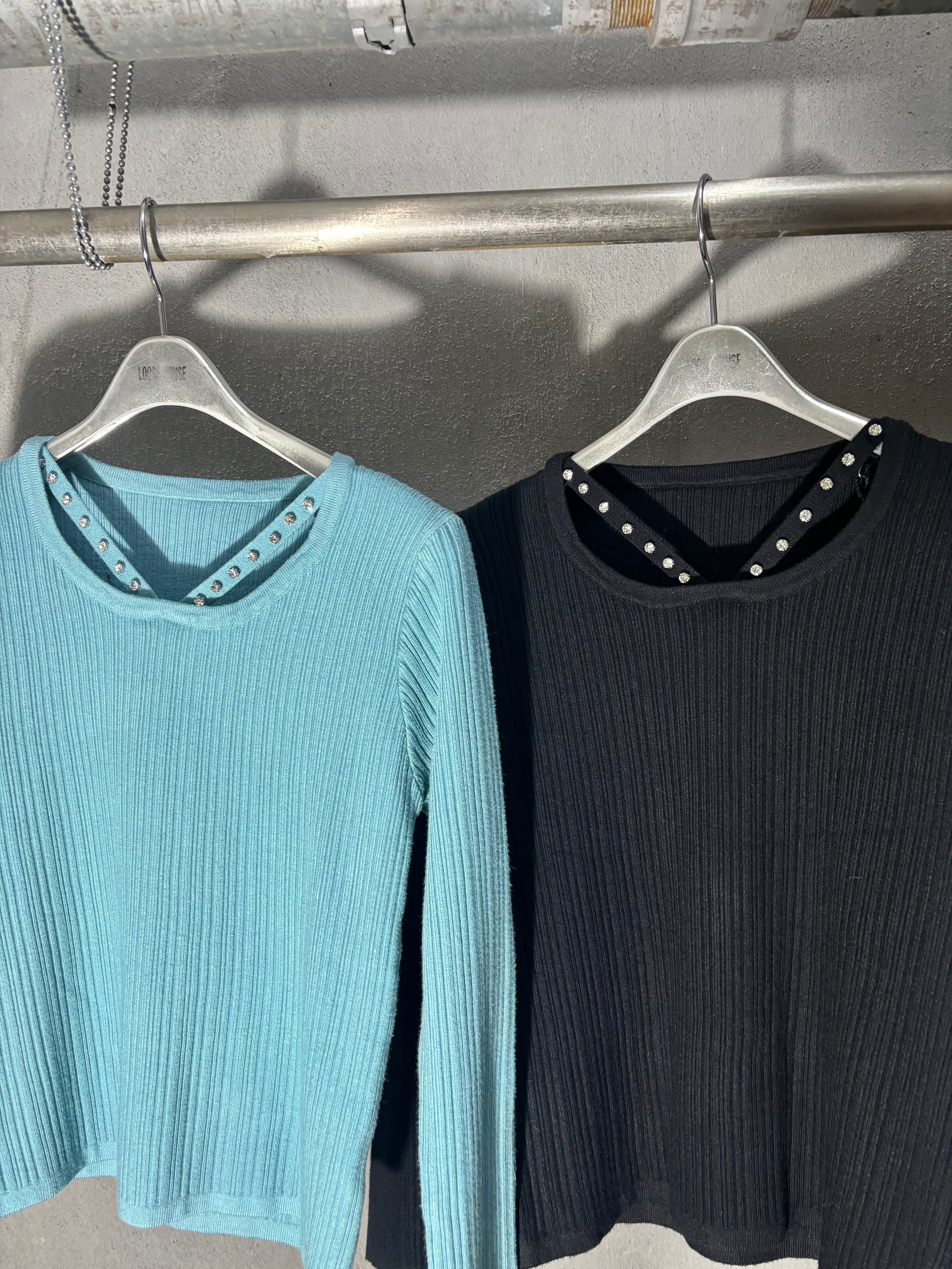 design neck rib knit tops トップス ニット デザインネック ストーン リブニット