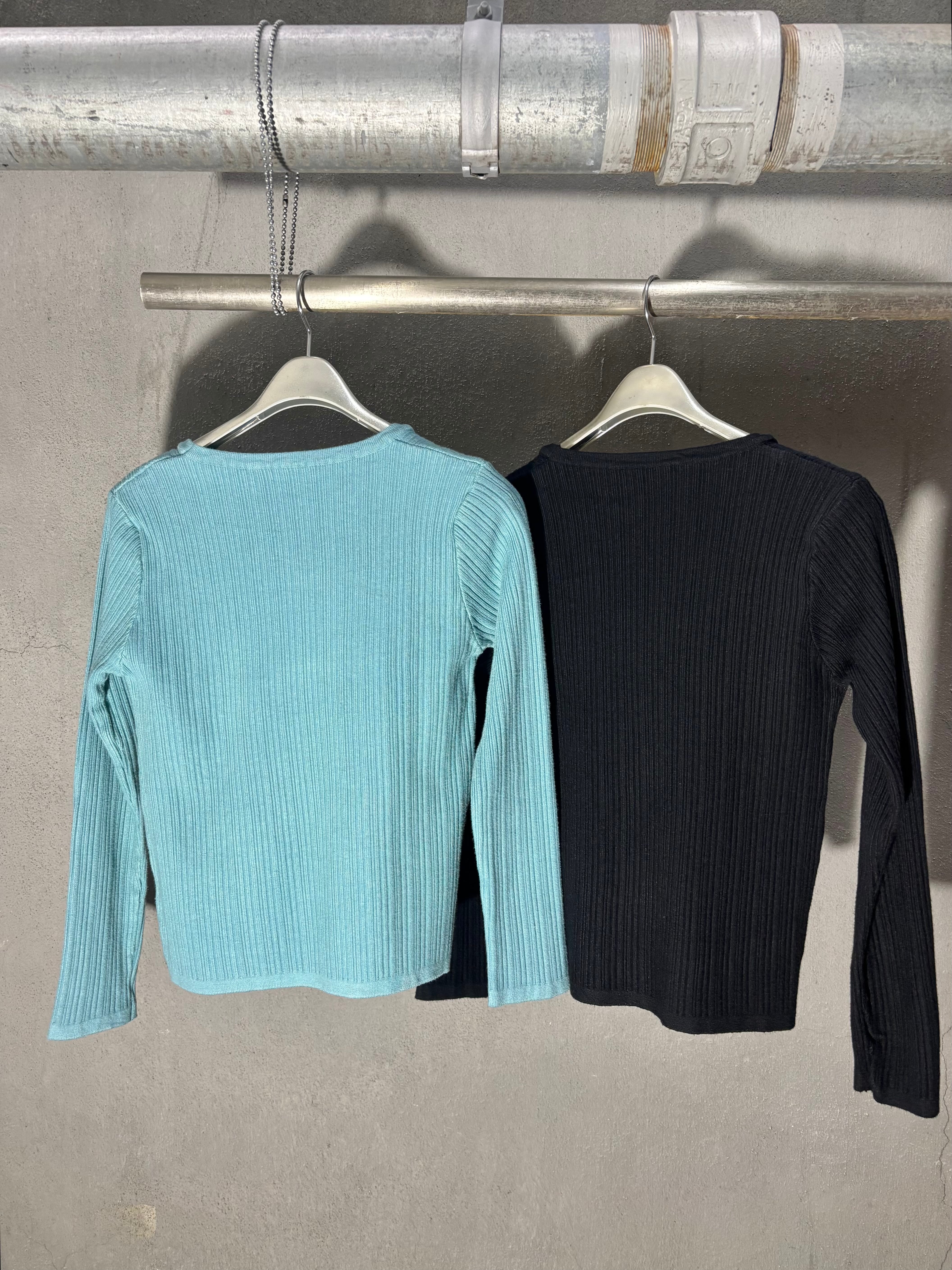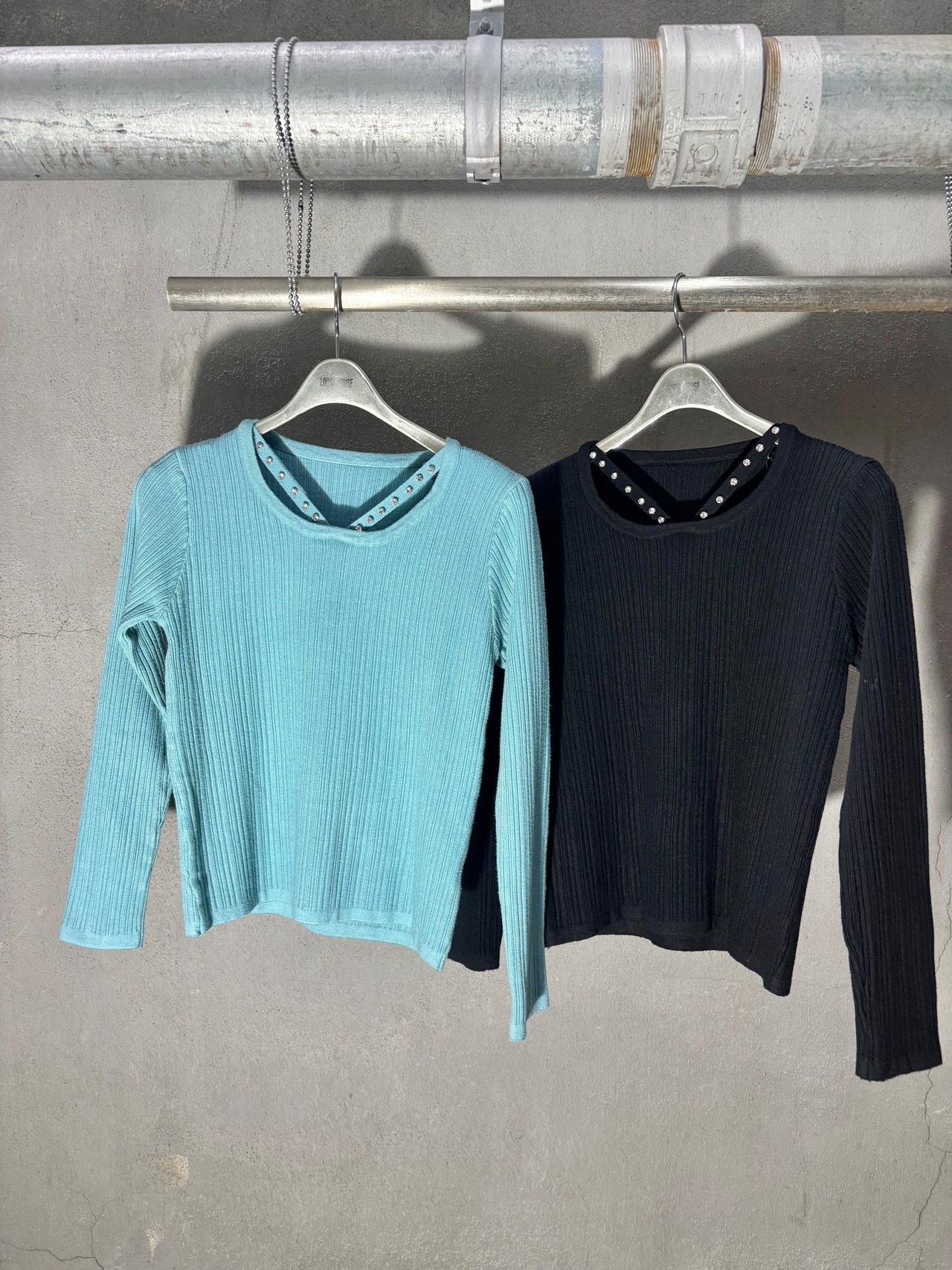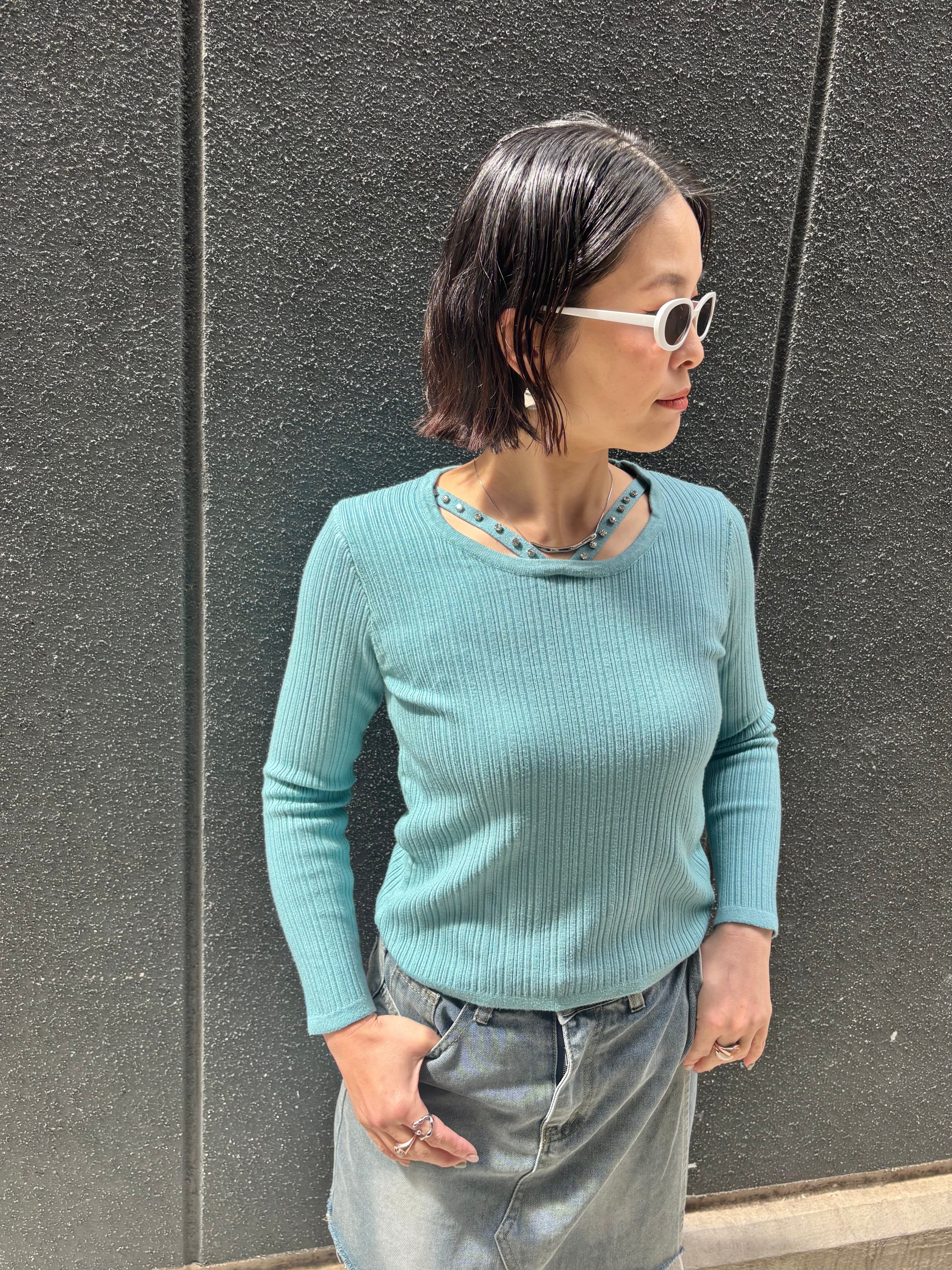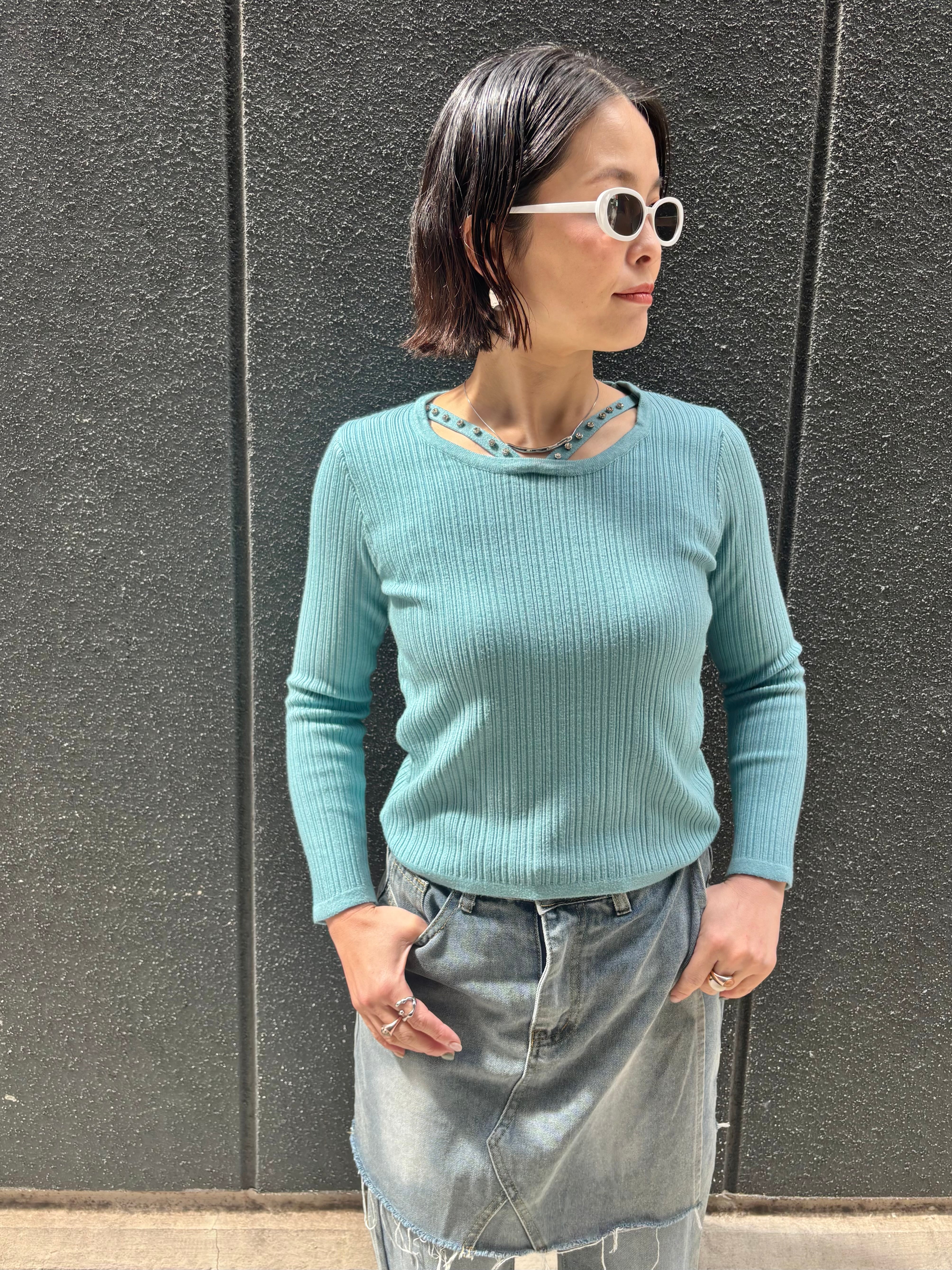 design neck rib knit tops トップス ニット デザインネック ストーン リブニット