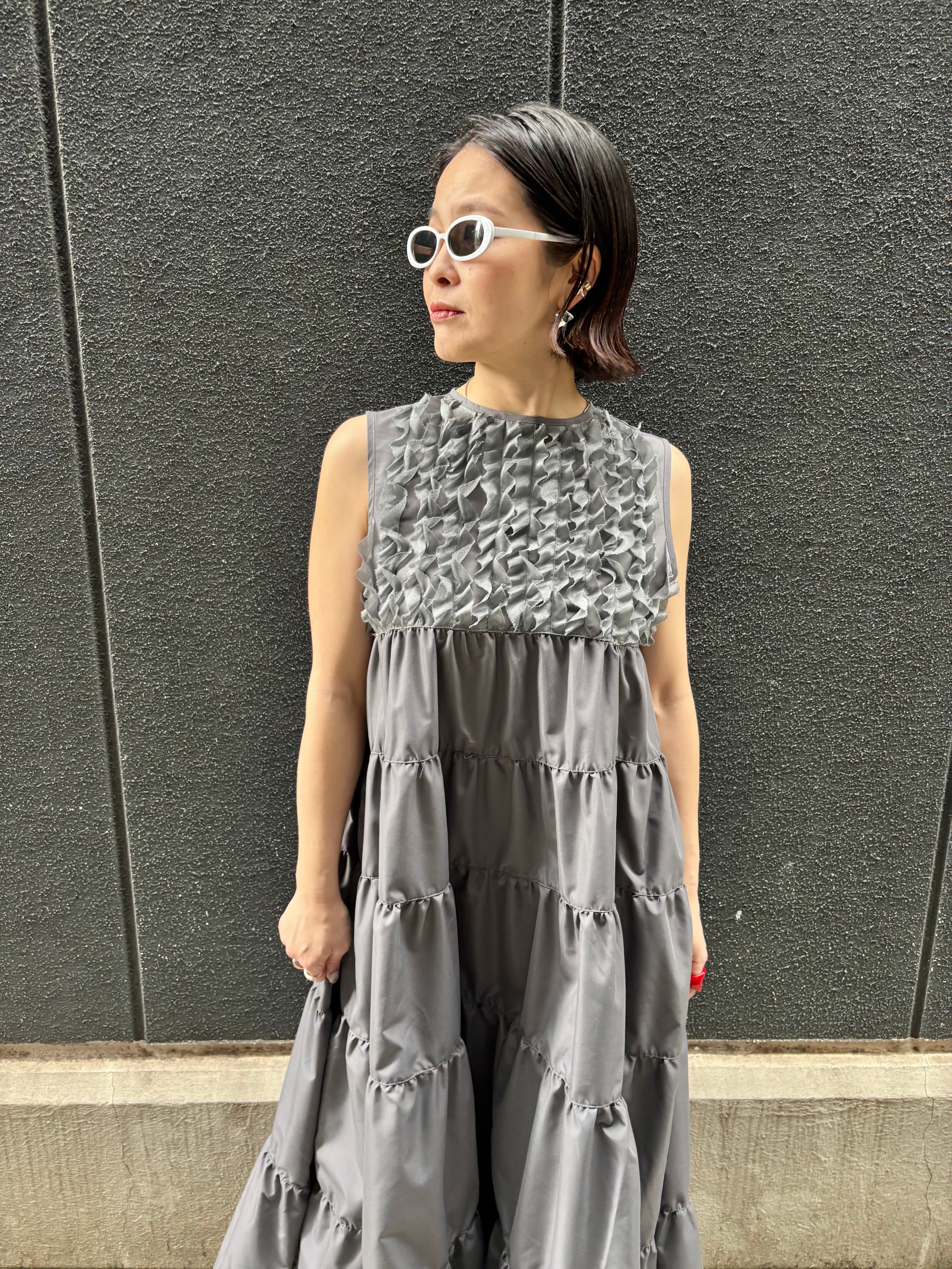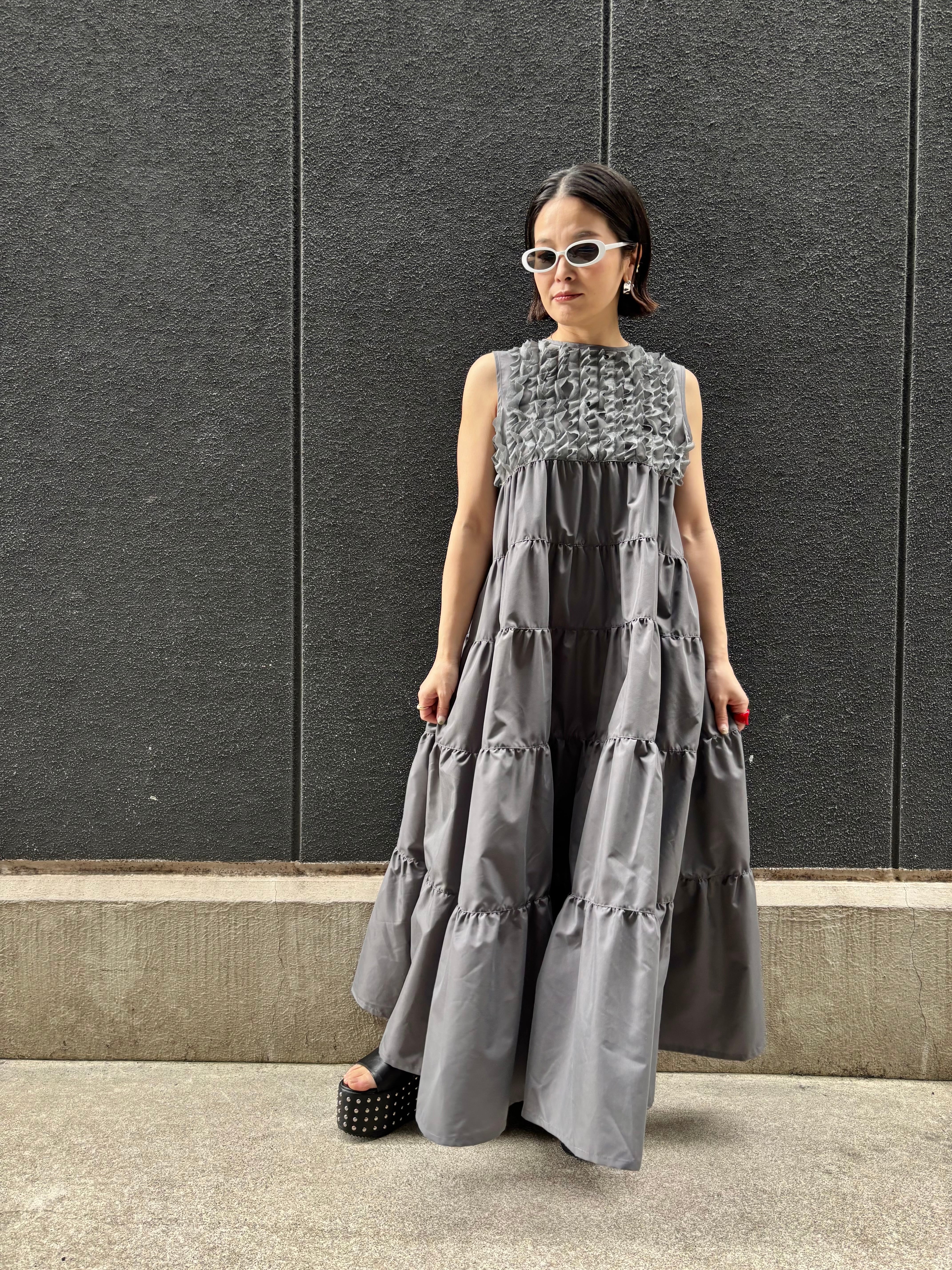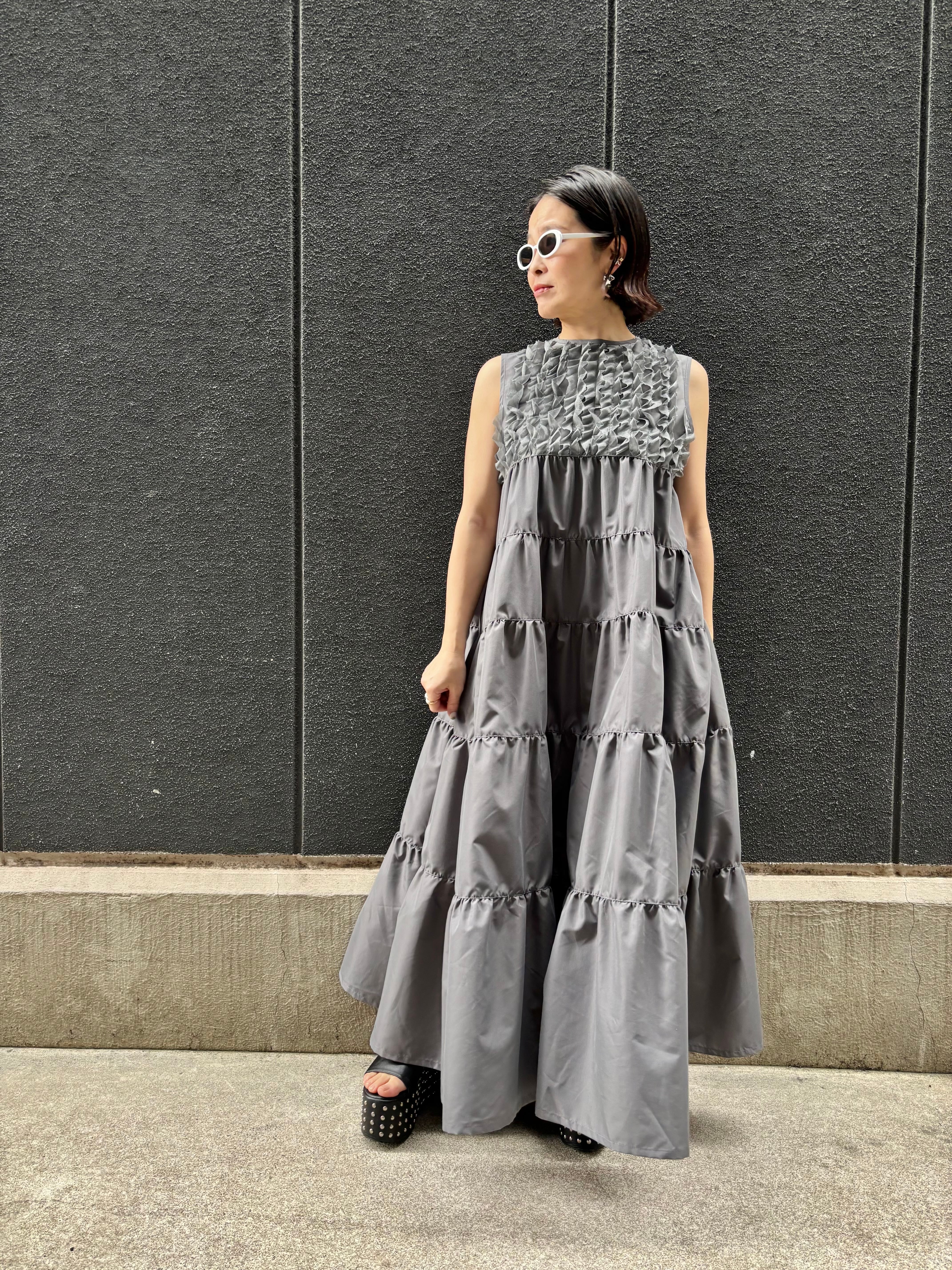ギャザーをたっぷりと施したティアードスタイルが、涼しげで軽やかな印象を与え、カジュアルにもフォーマルにも着こなせる一着となっています。