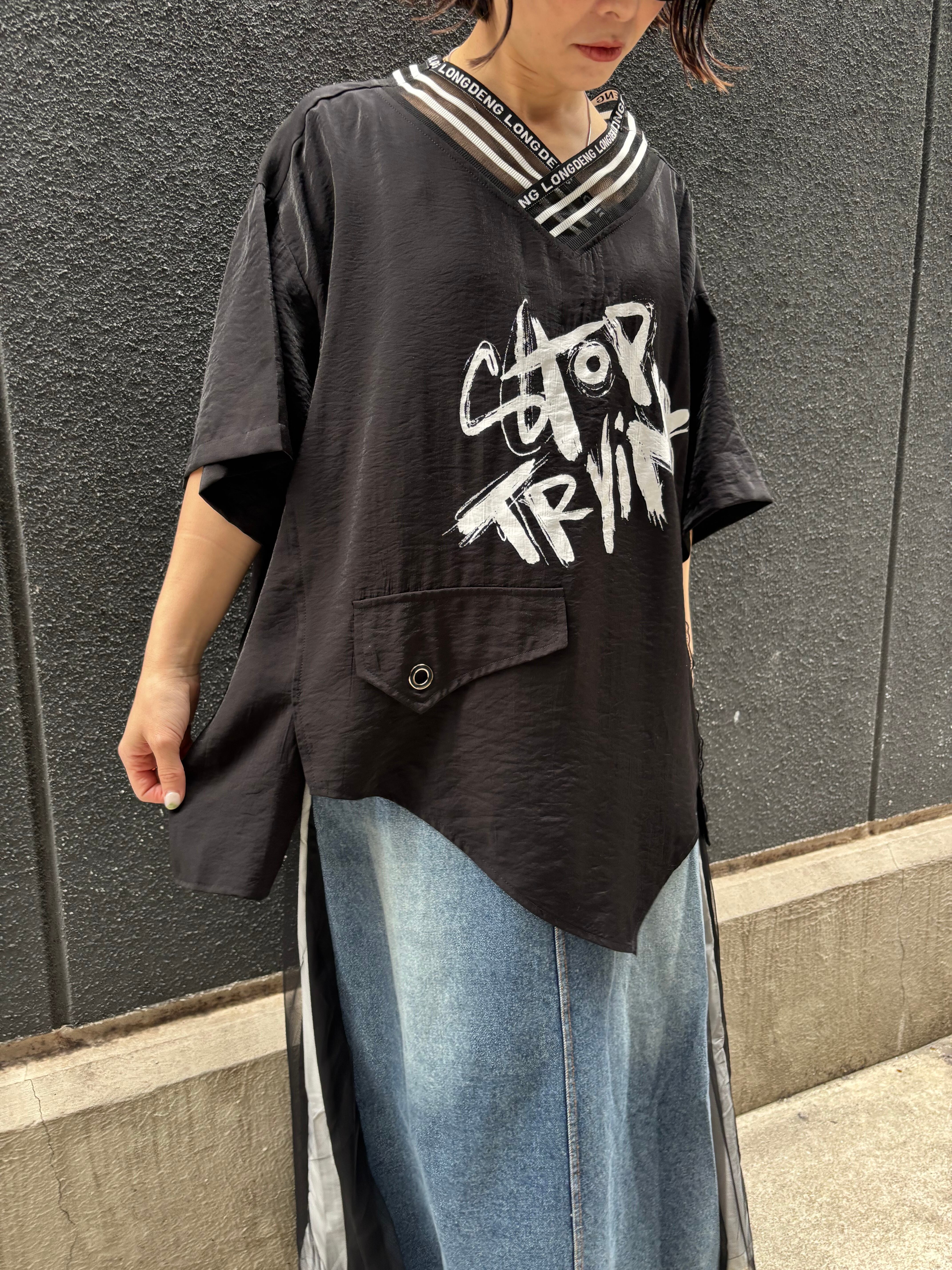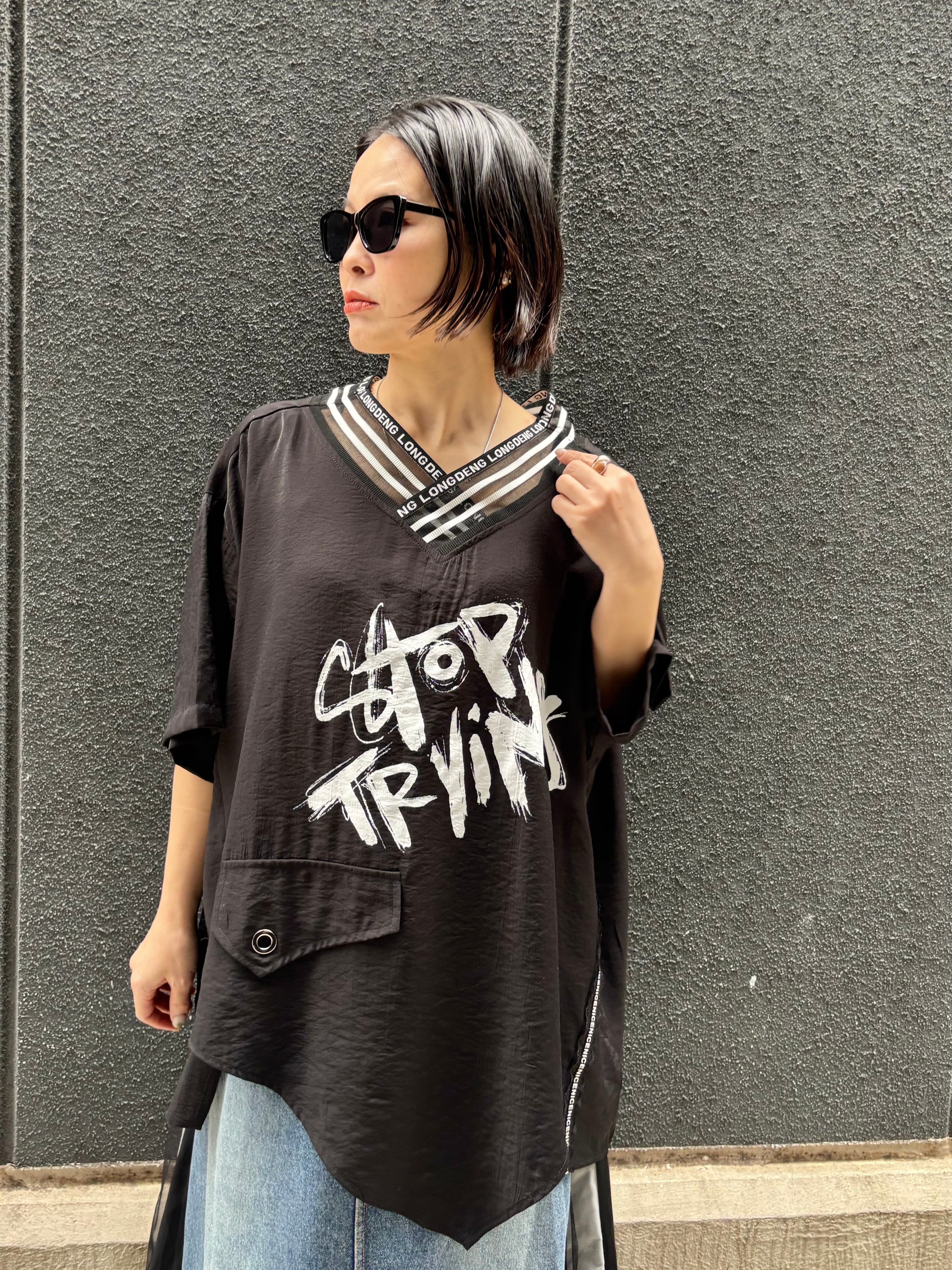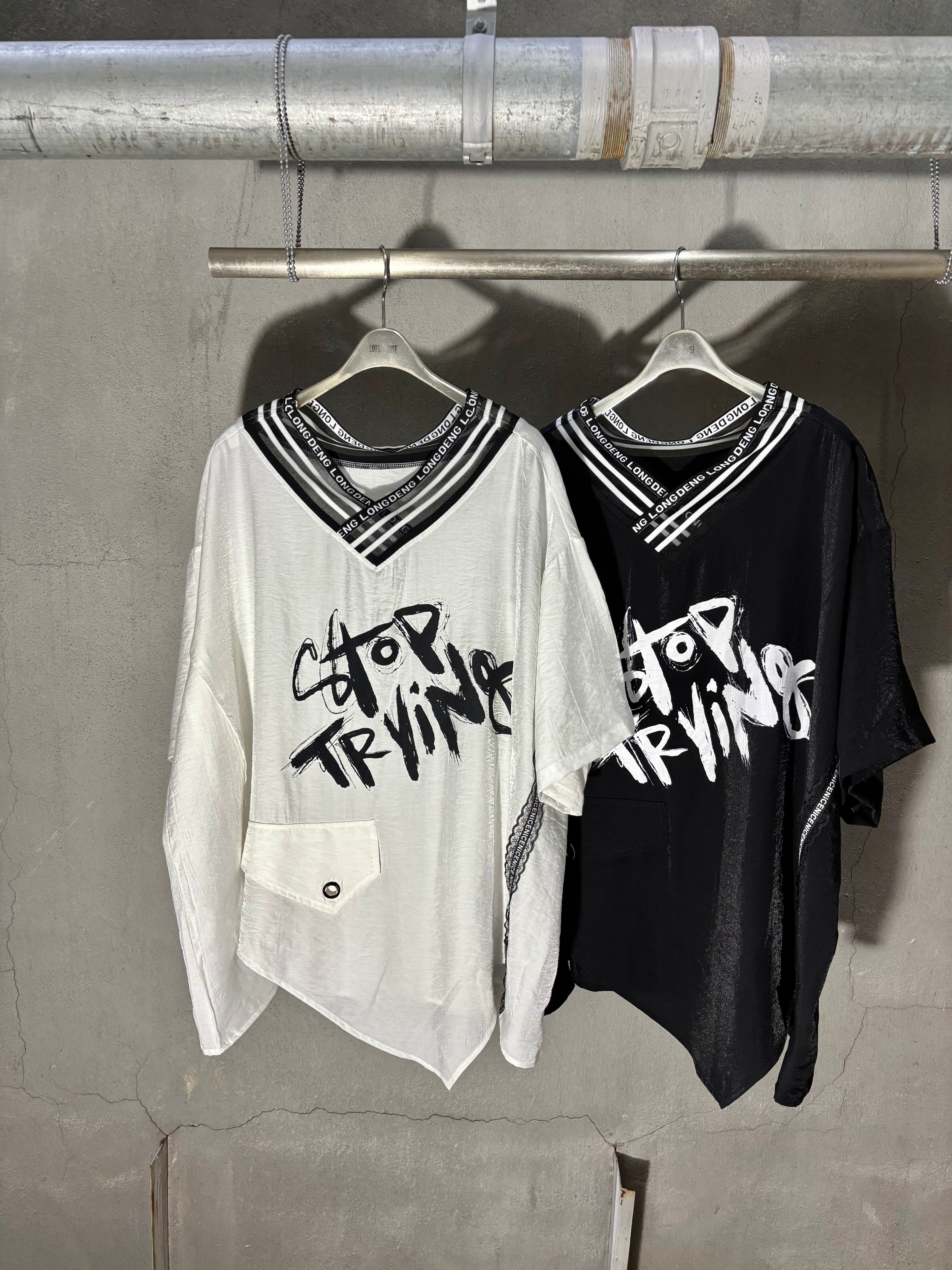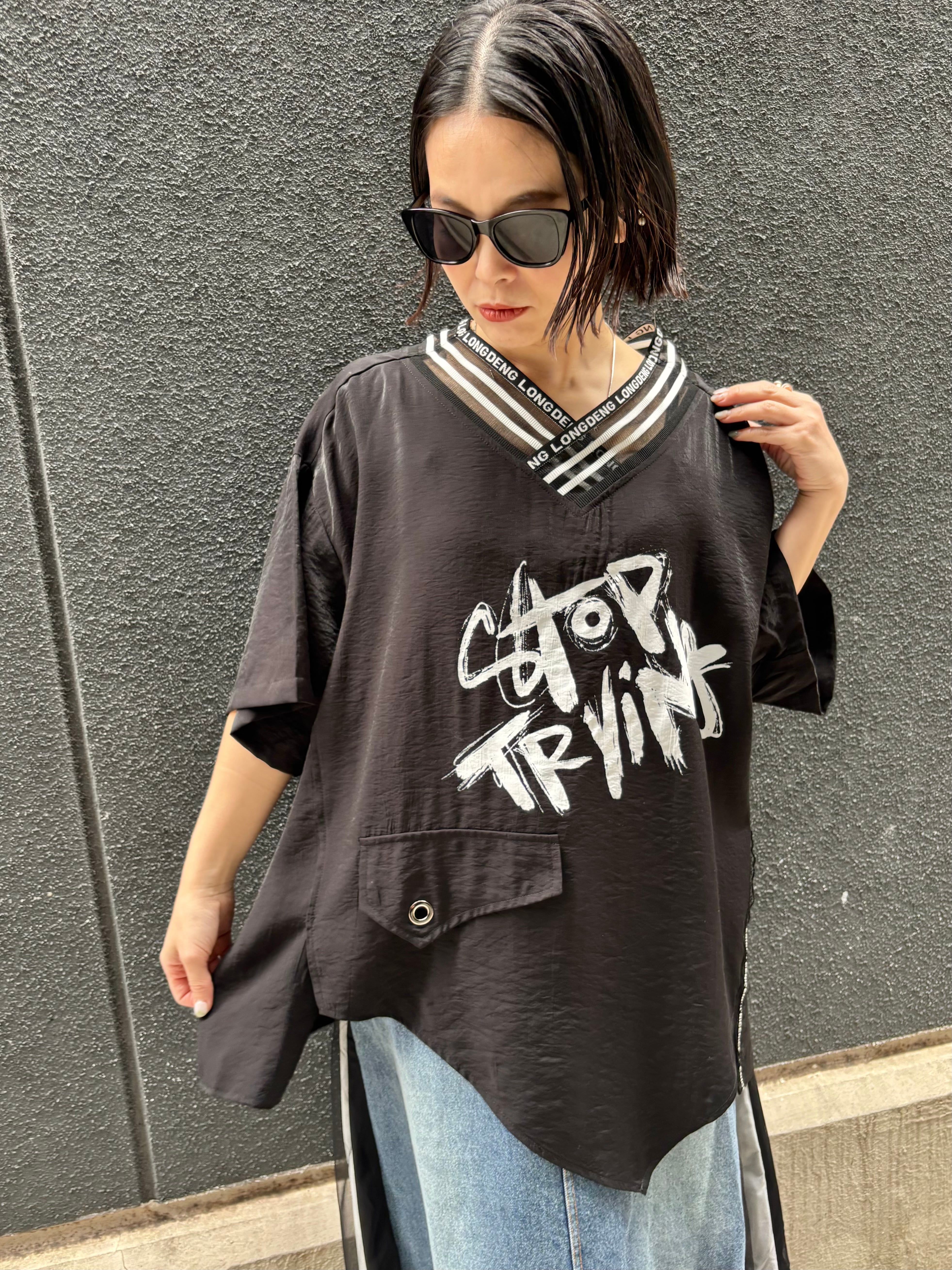 print V-neck design tops トップス Vネック プリント 布帛 ライン 白黒
