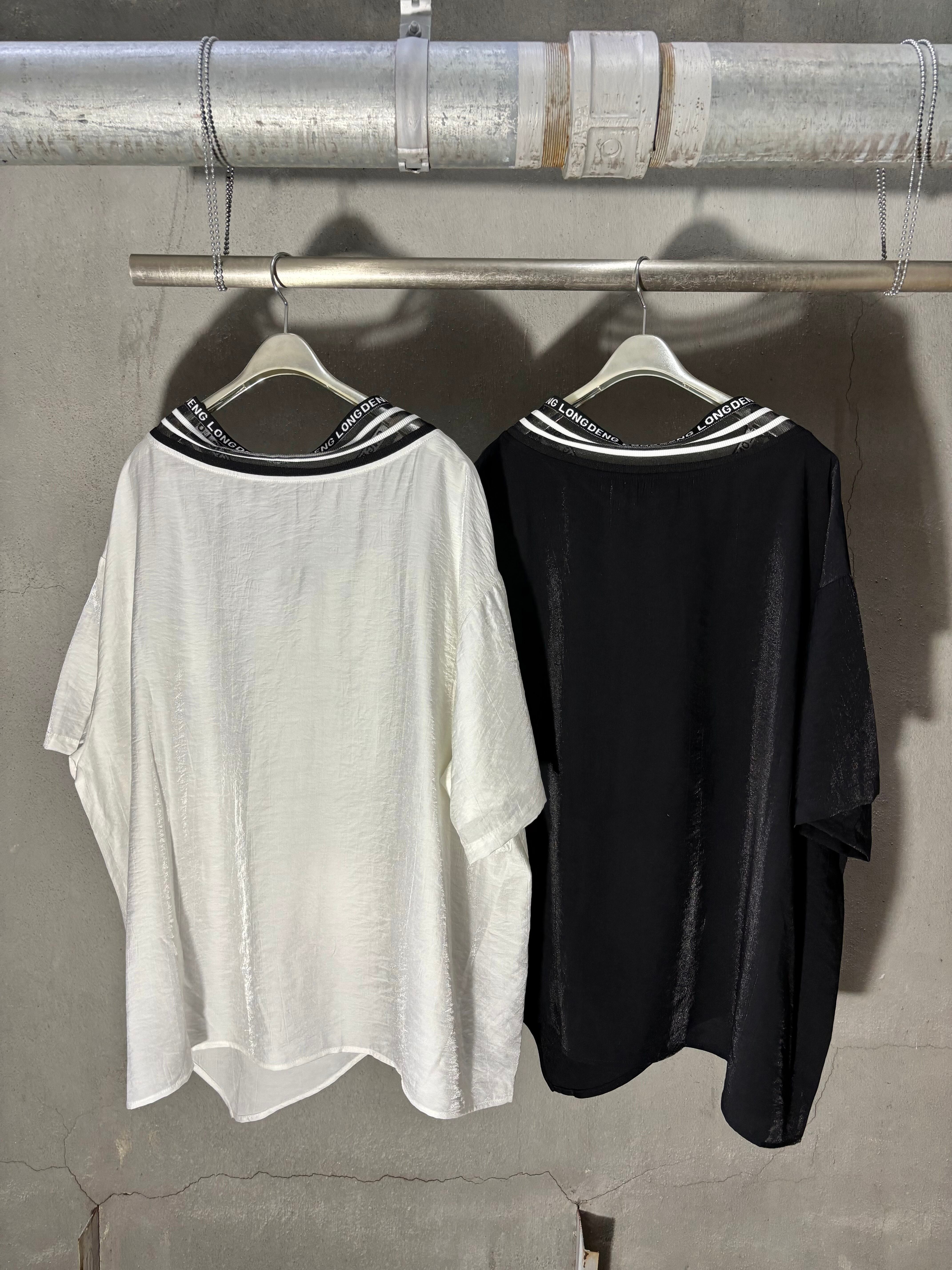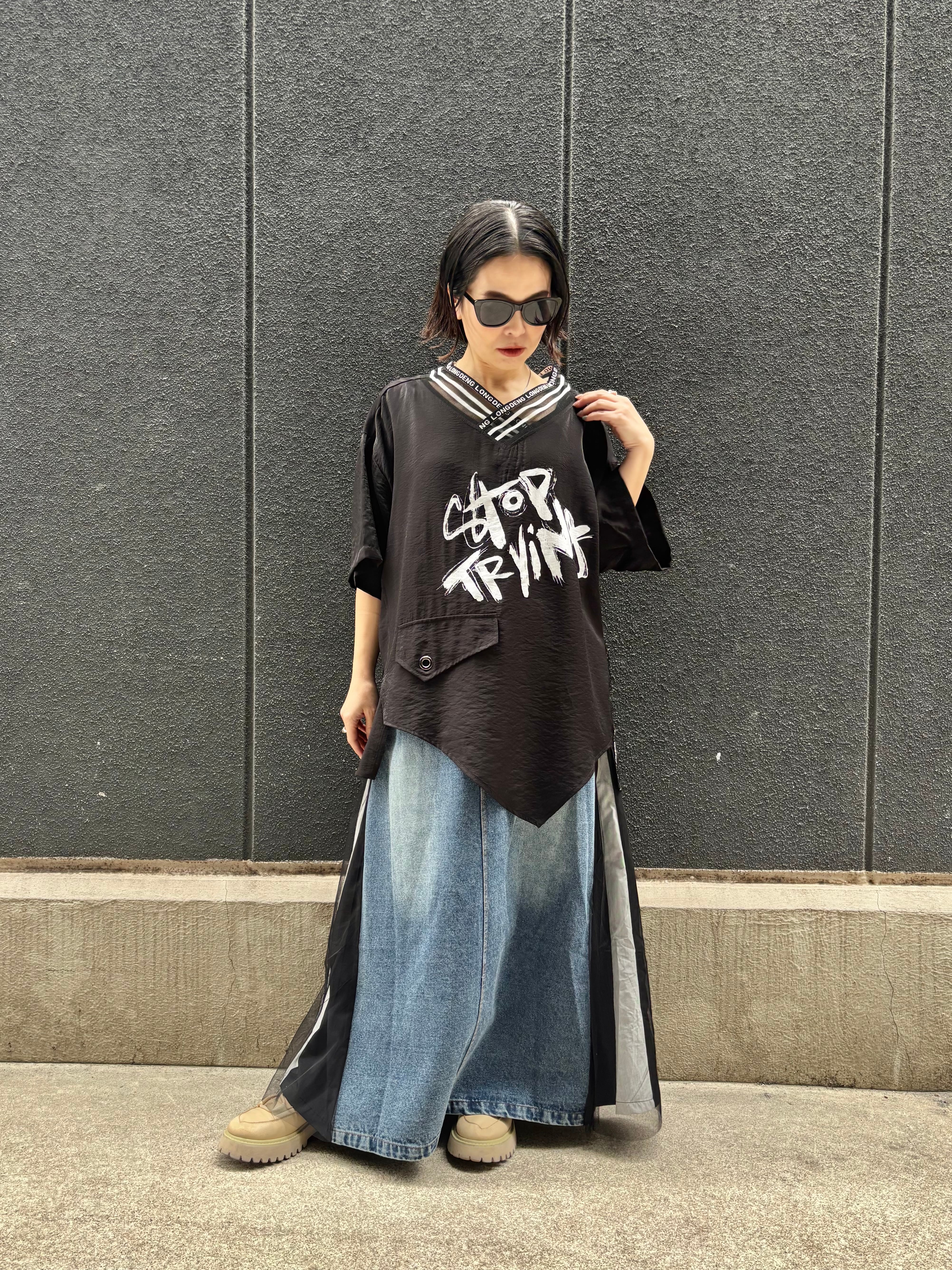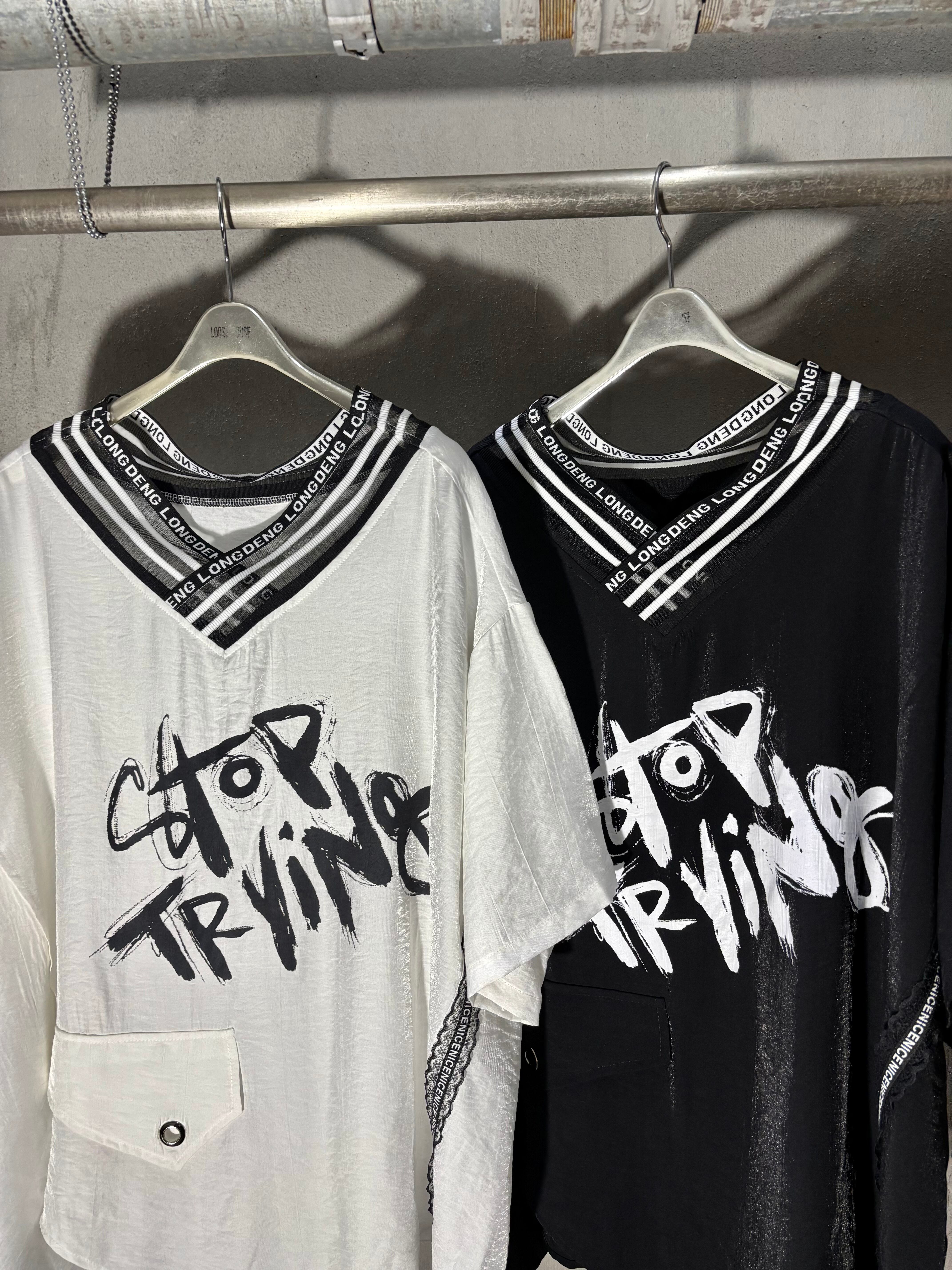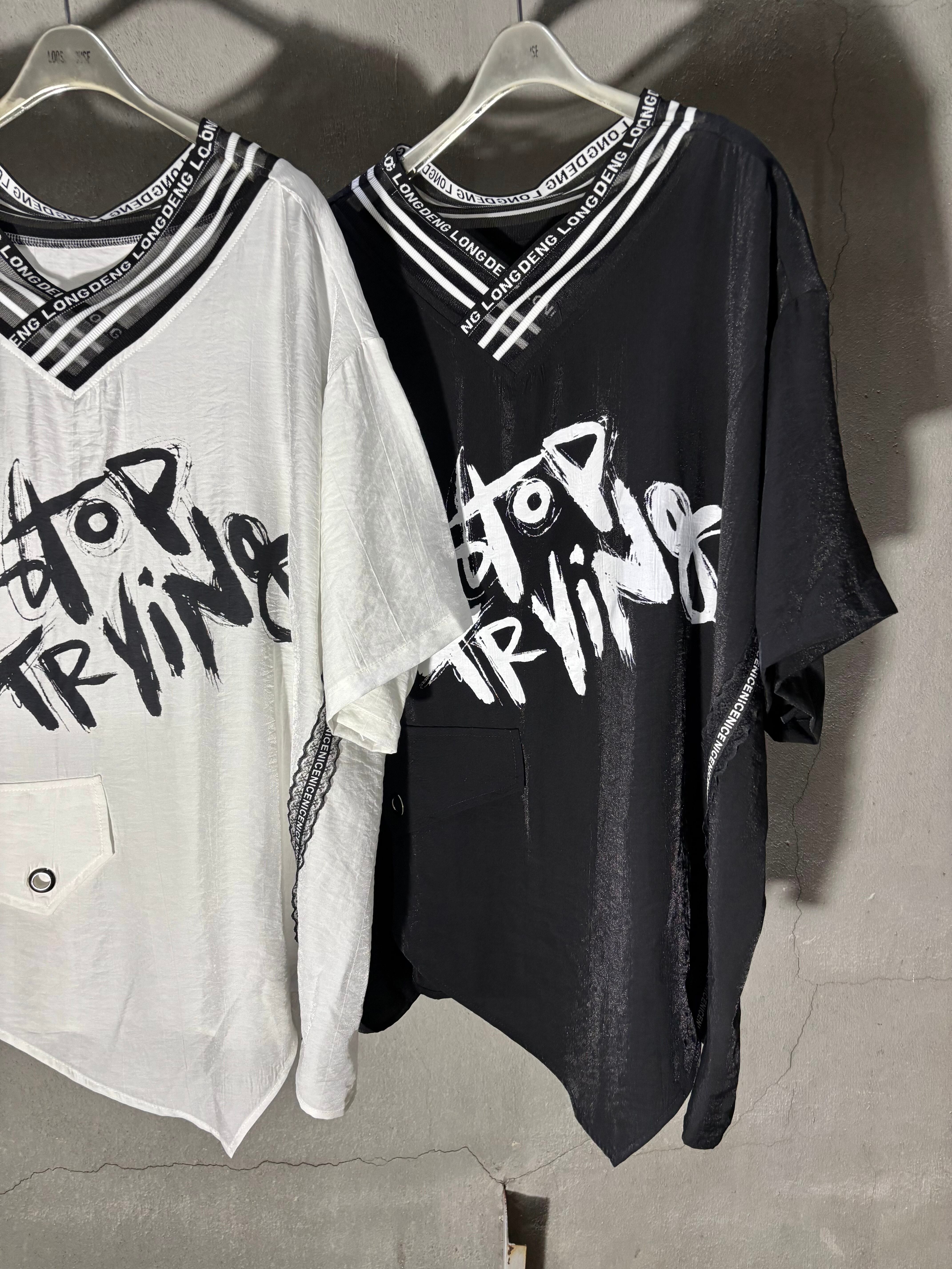print V-neck design tops トップス Vネック プリント 布帛 ライン 白黒