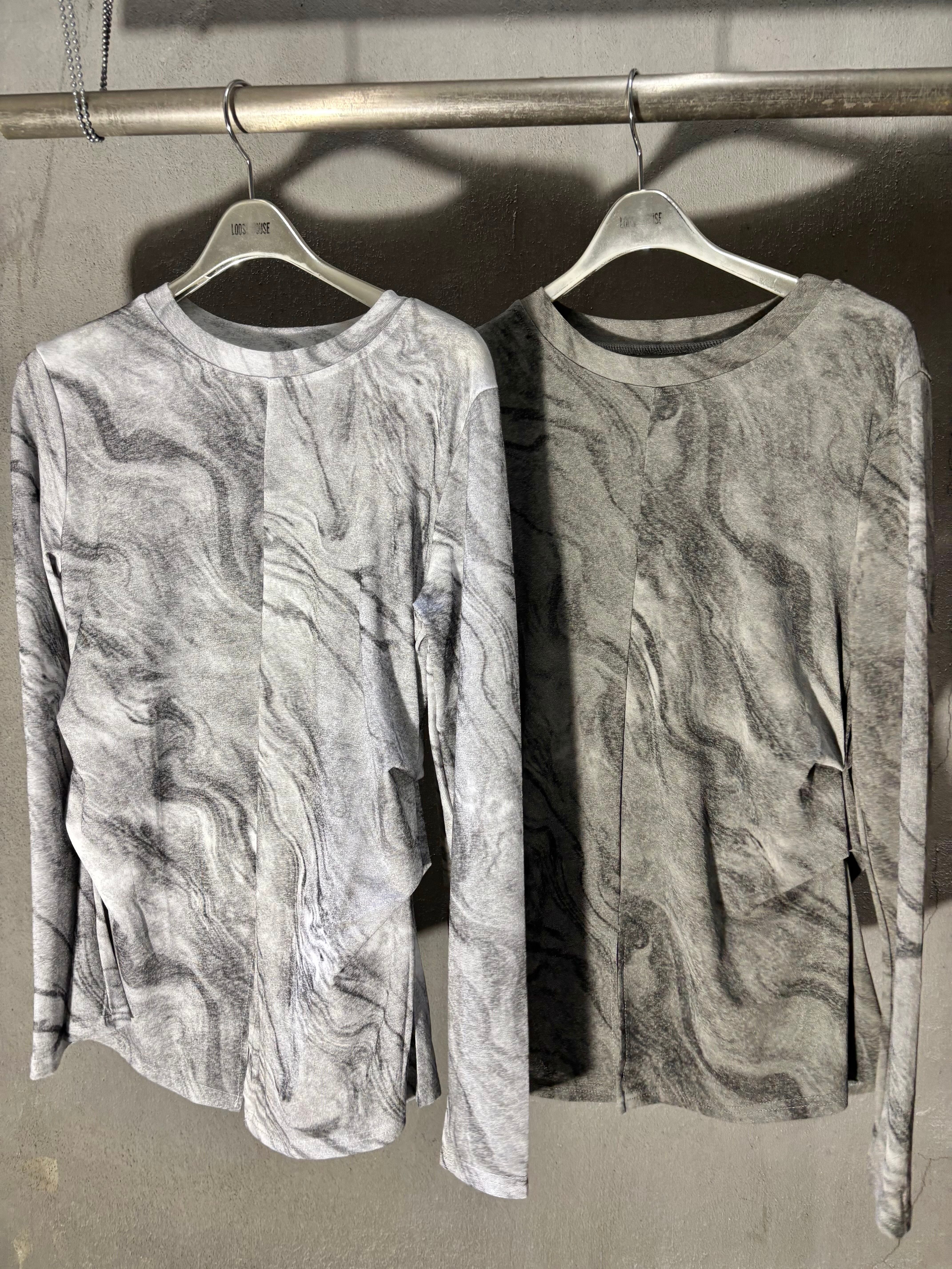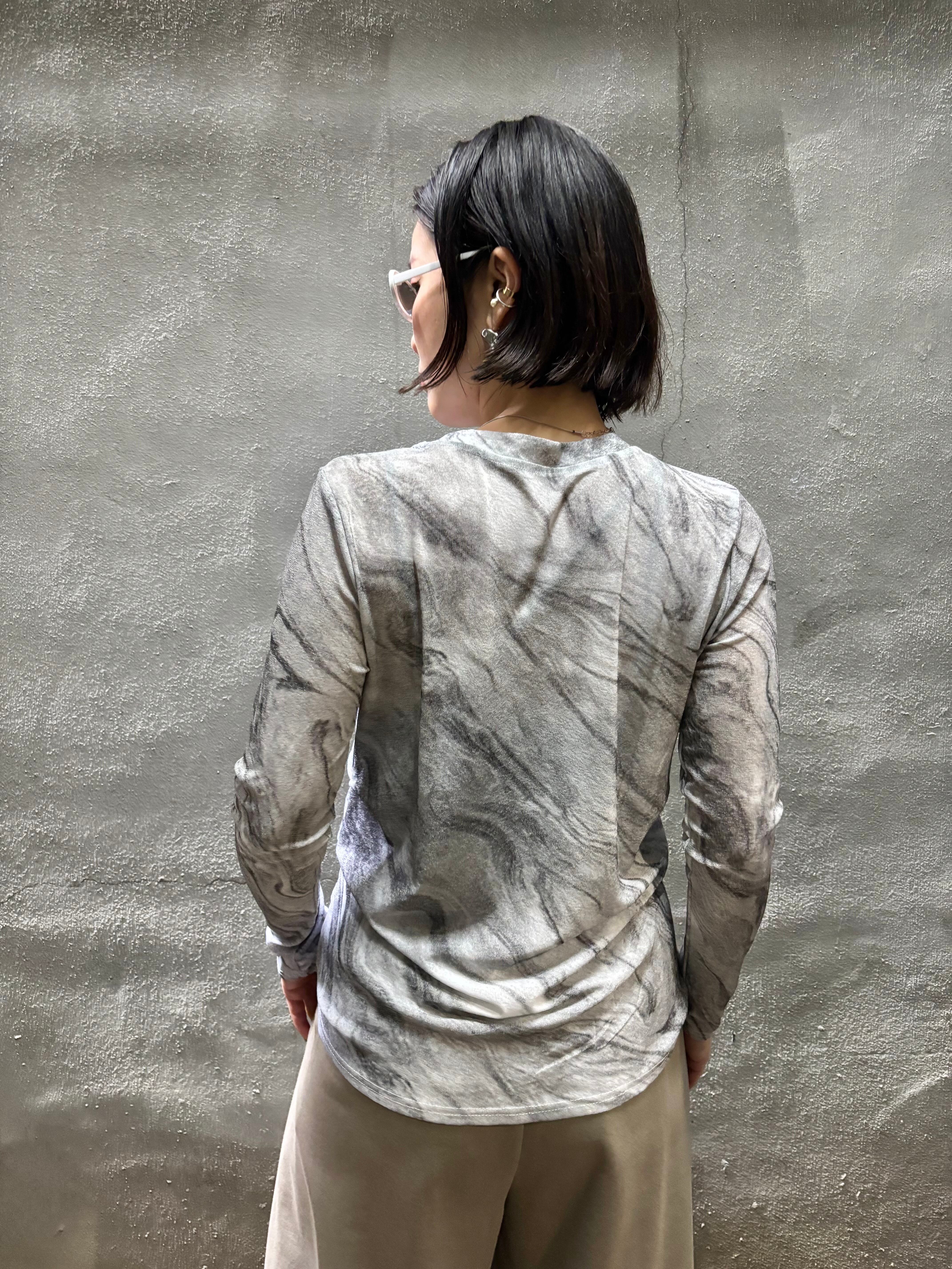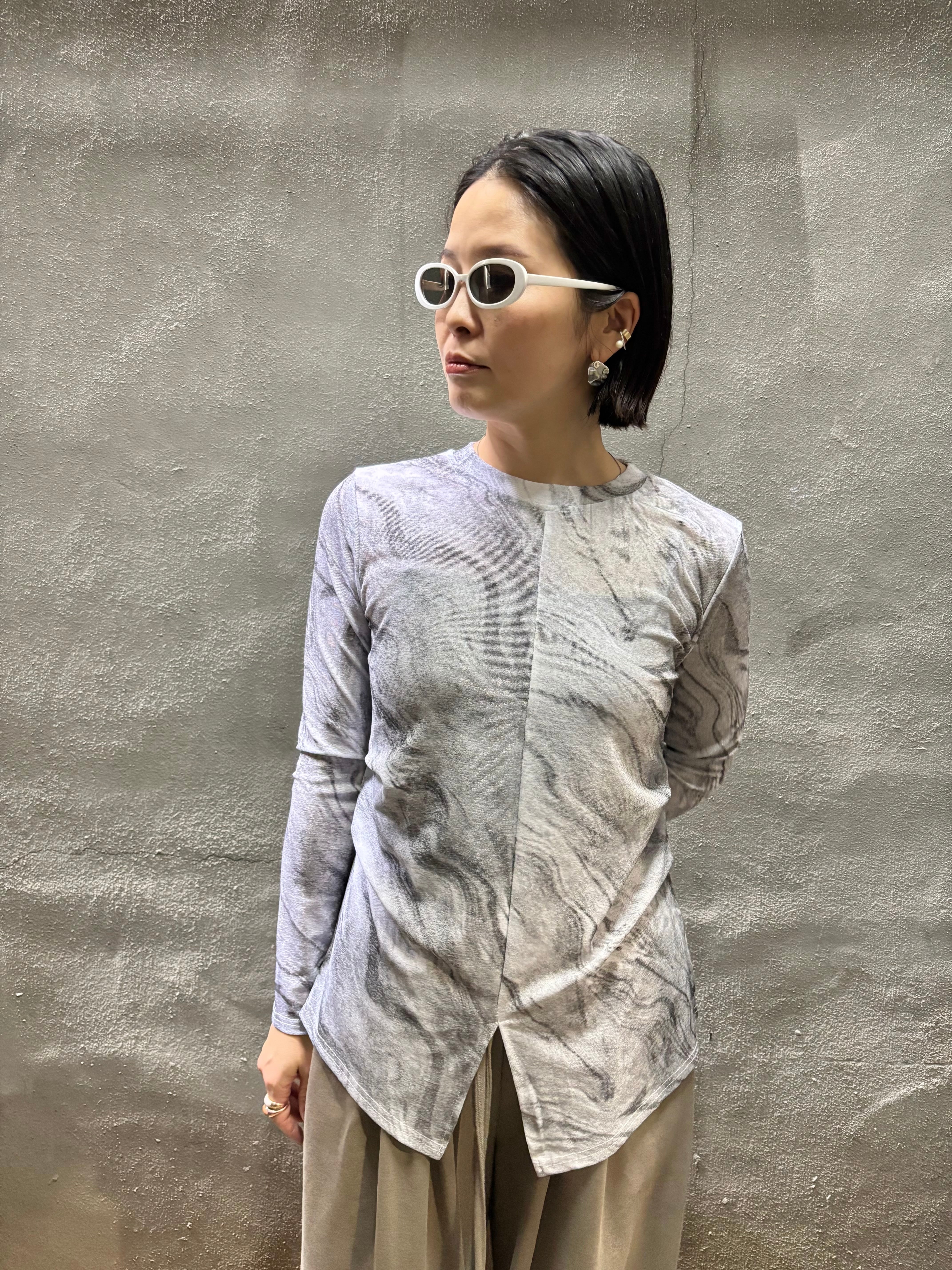 marble print tuck drape design tops トップス マーブル プリント ストレッチ ドレープ ギャザー