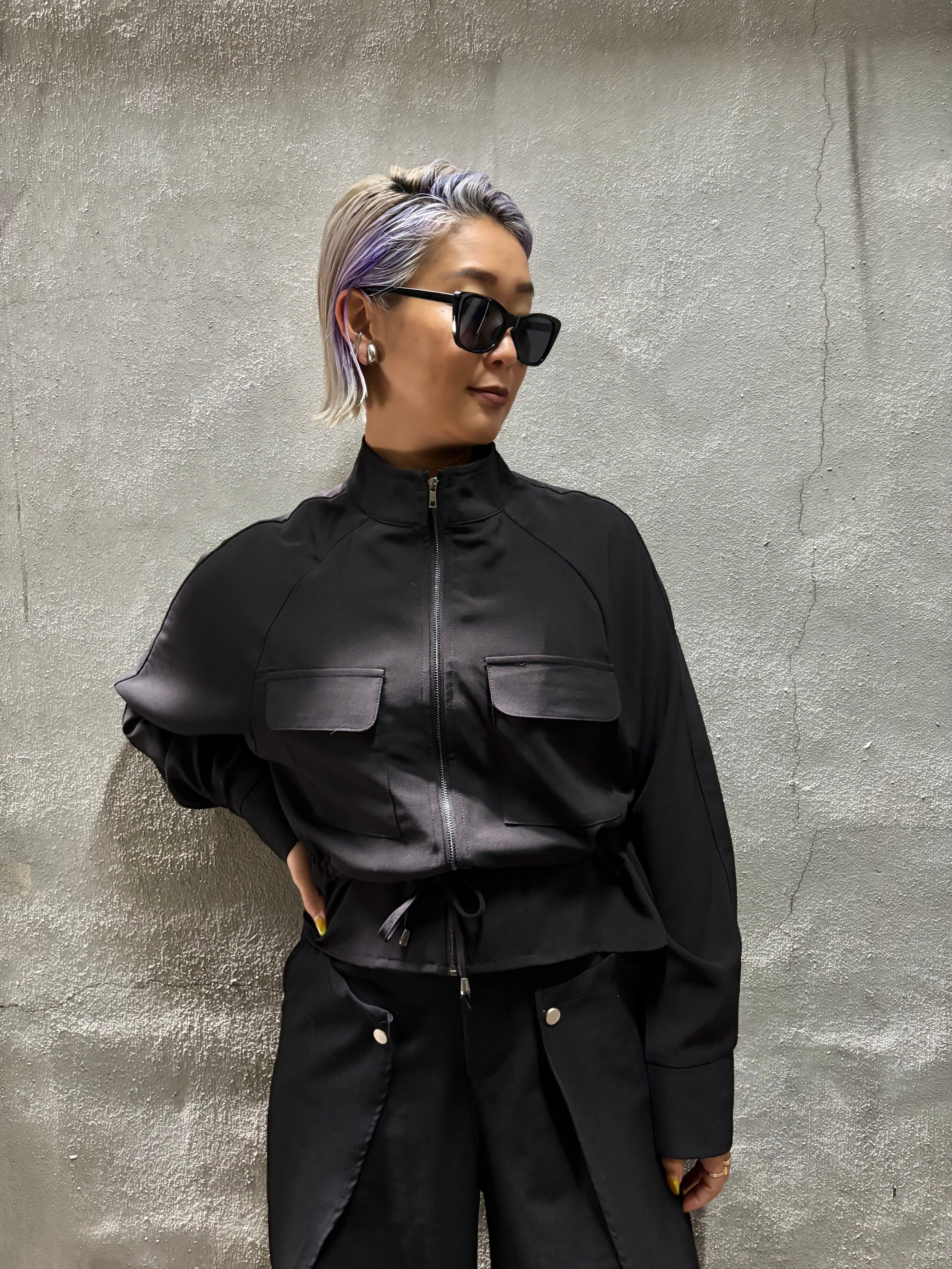 stand neck ribbon waist zip up design jacket ジャケット スタンドネック ジップアップ リボンウエスト ポケット ブラック 黒