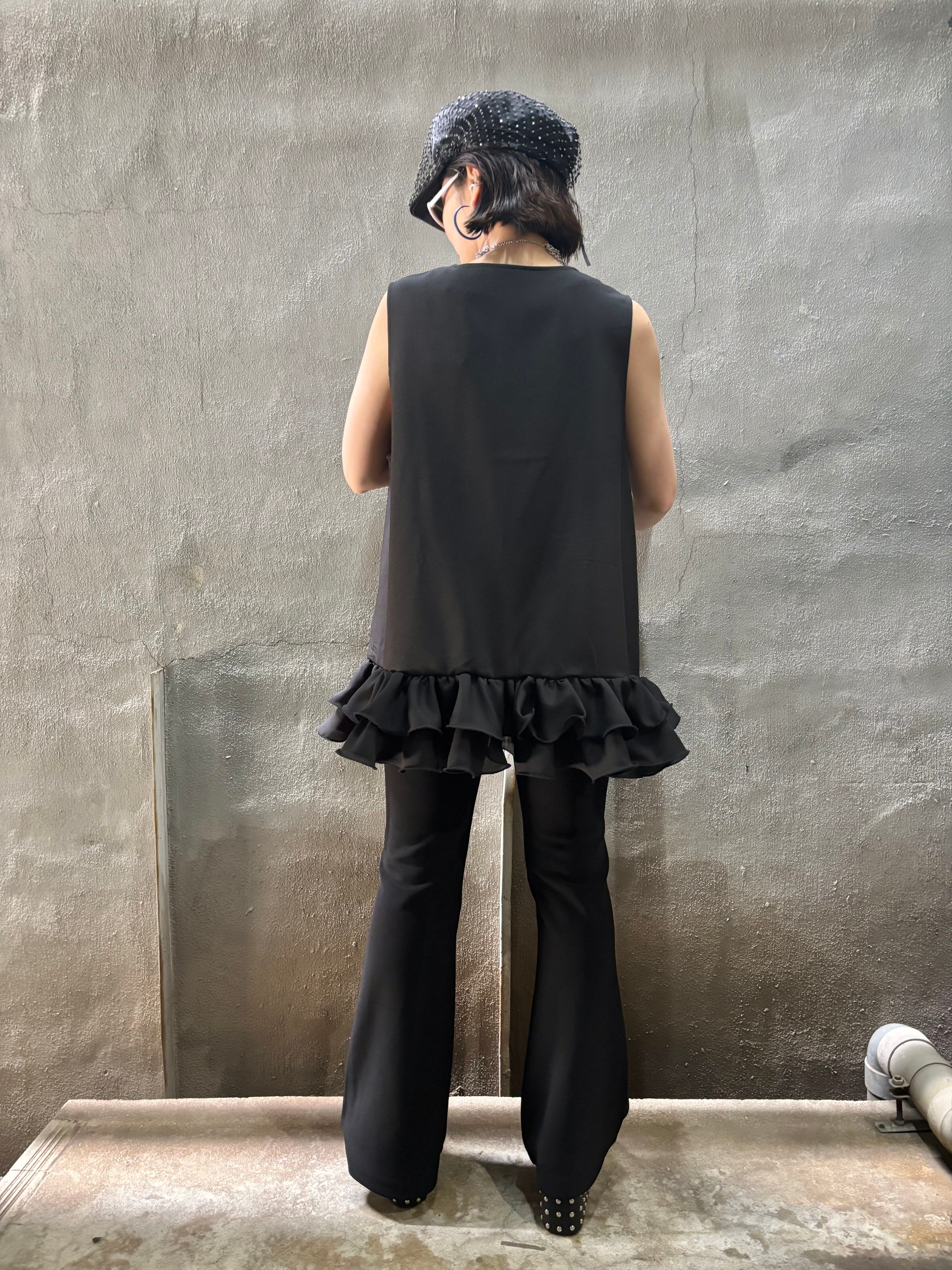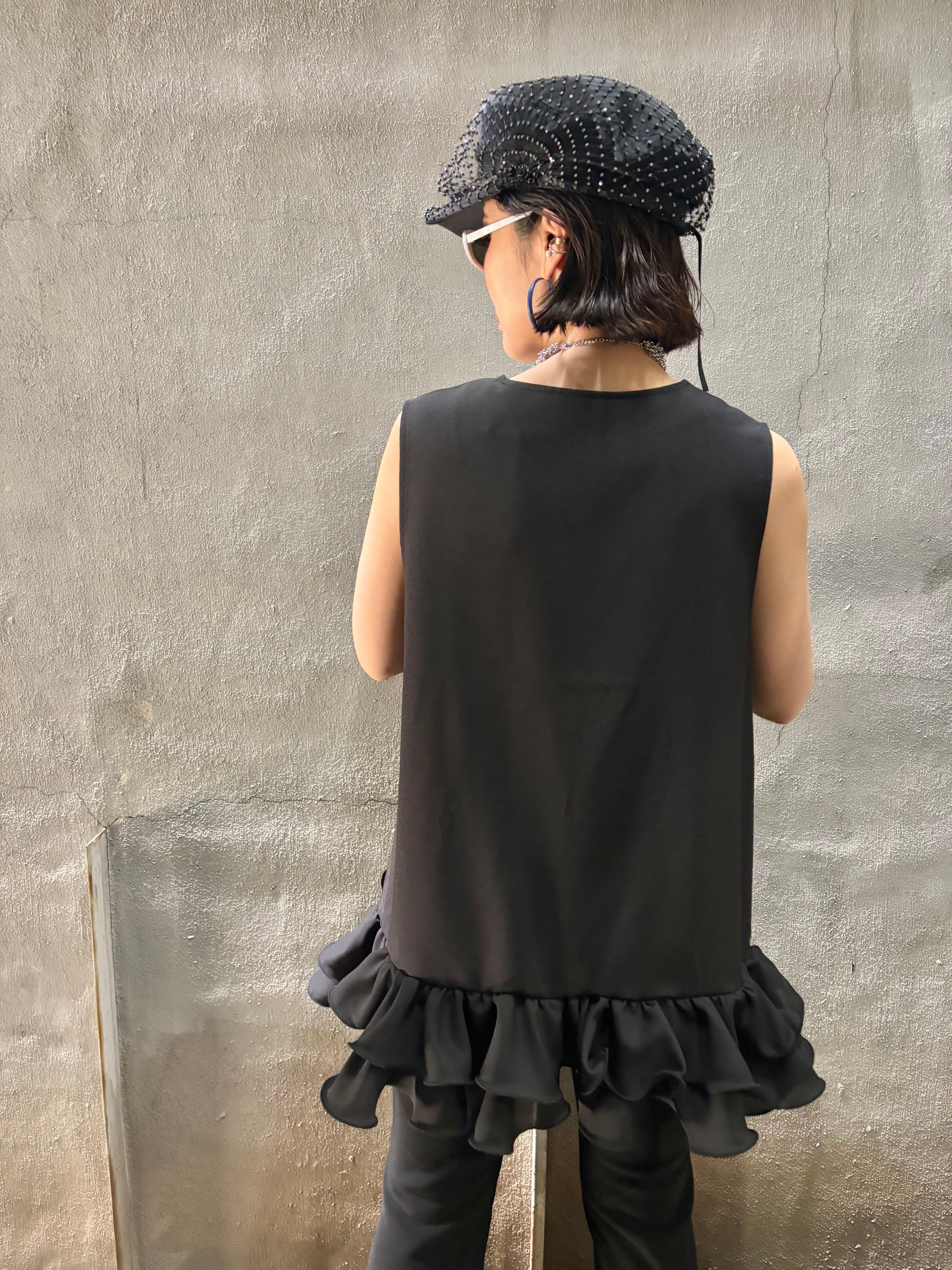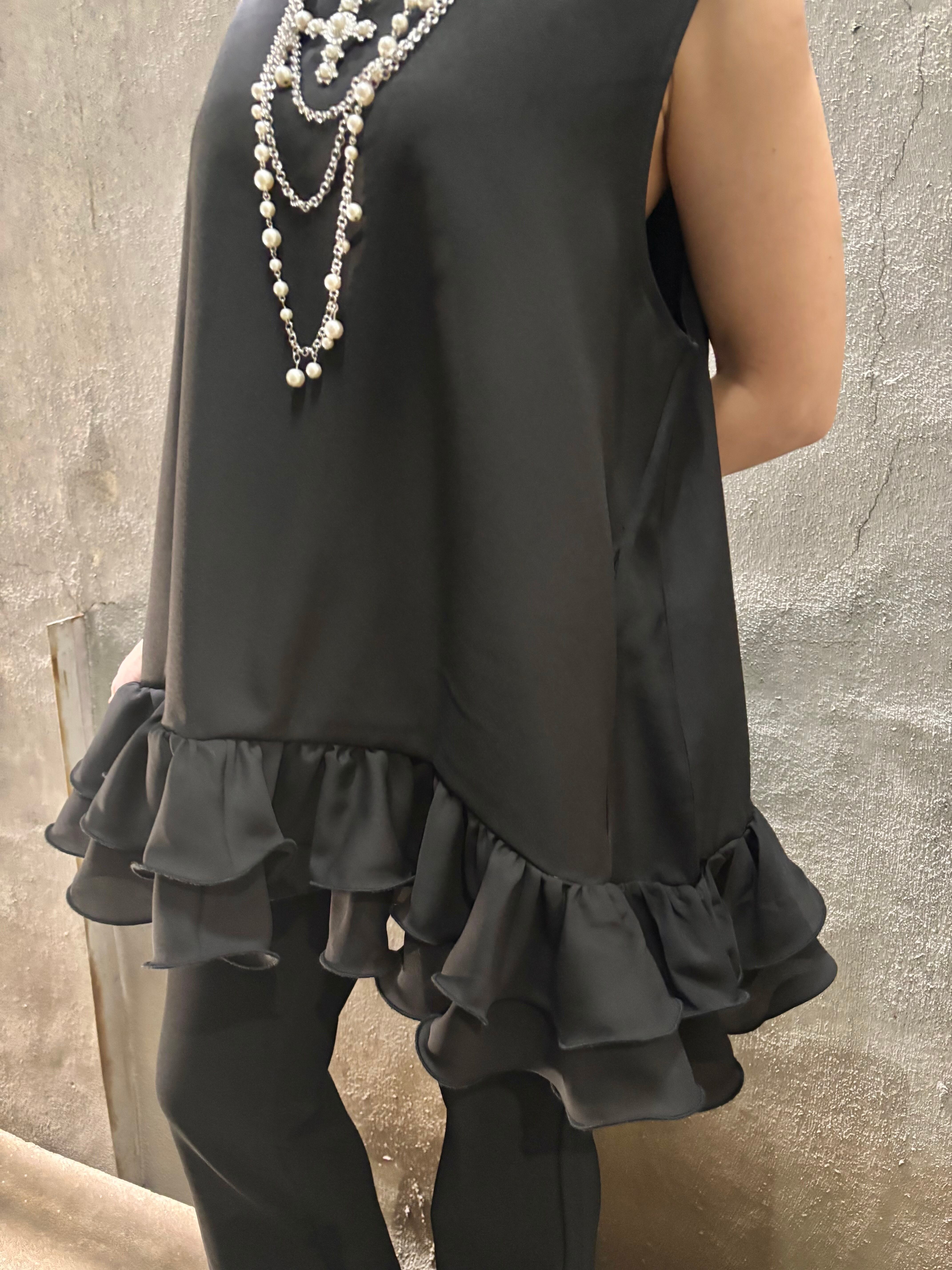 frill hem V-neck sleeve less design tunic チュニック フリル Vネック ブラック 黒