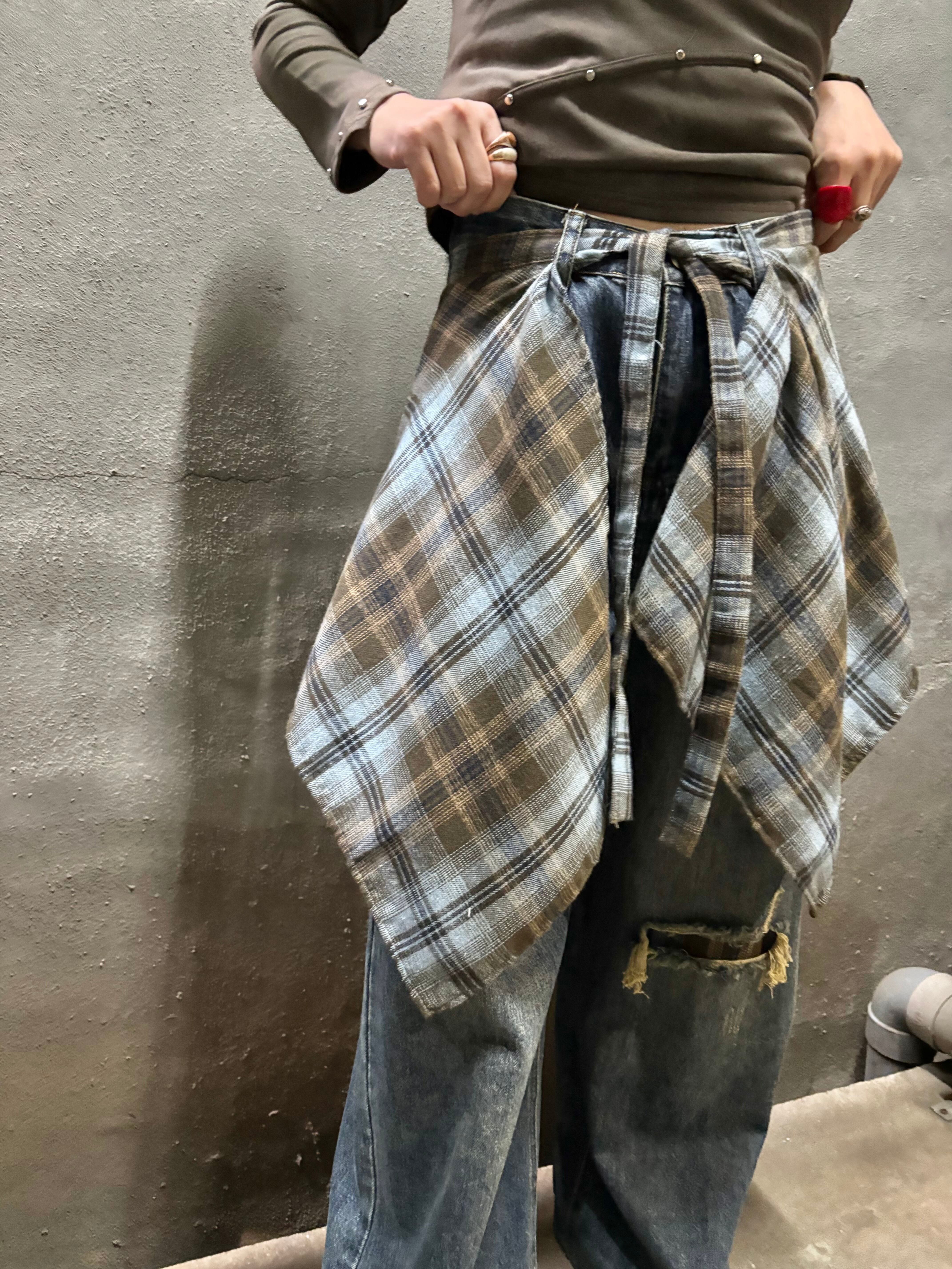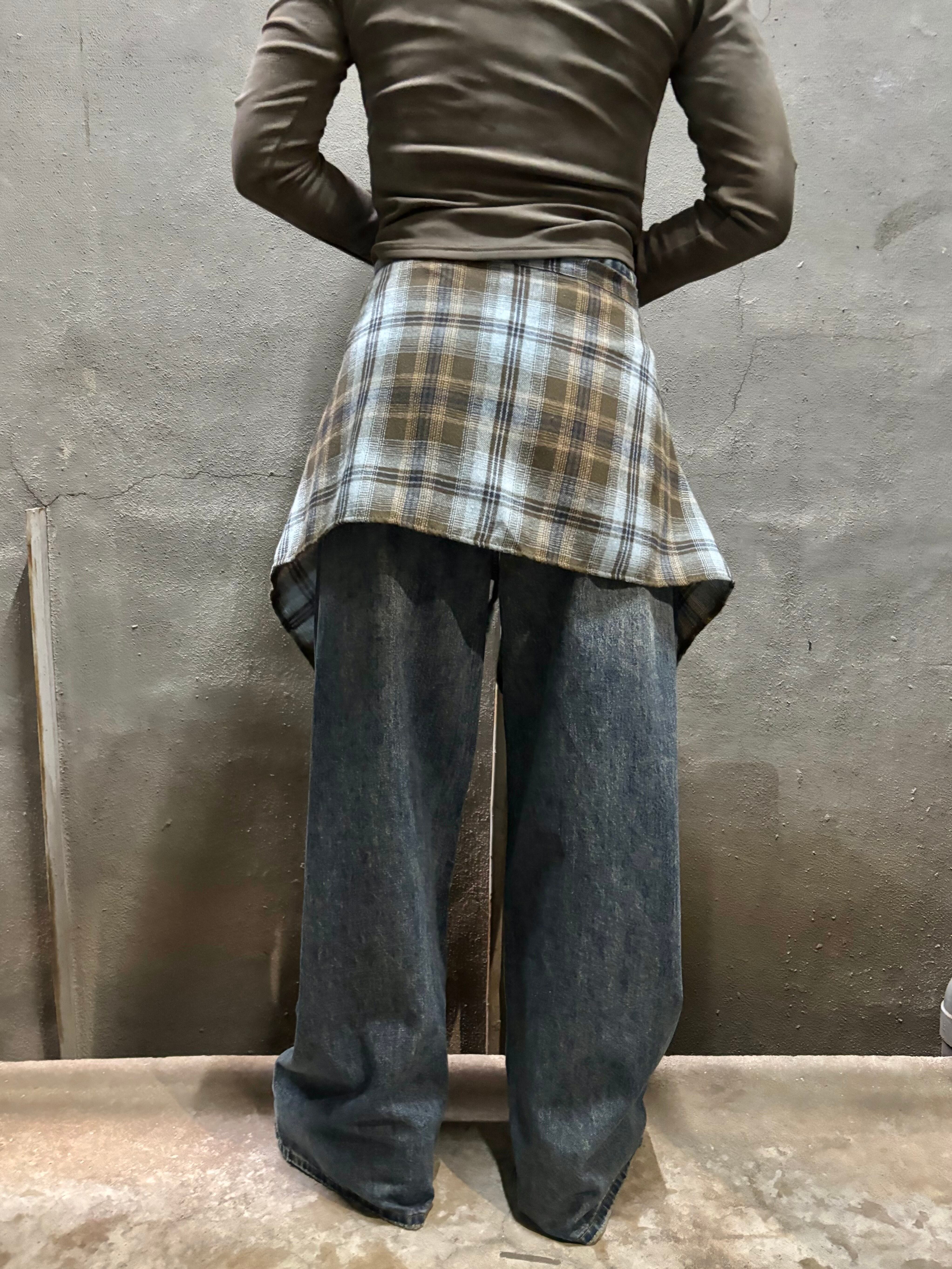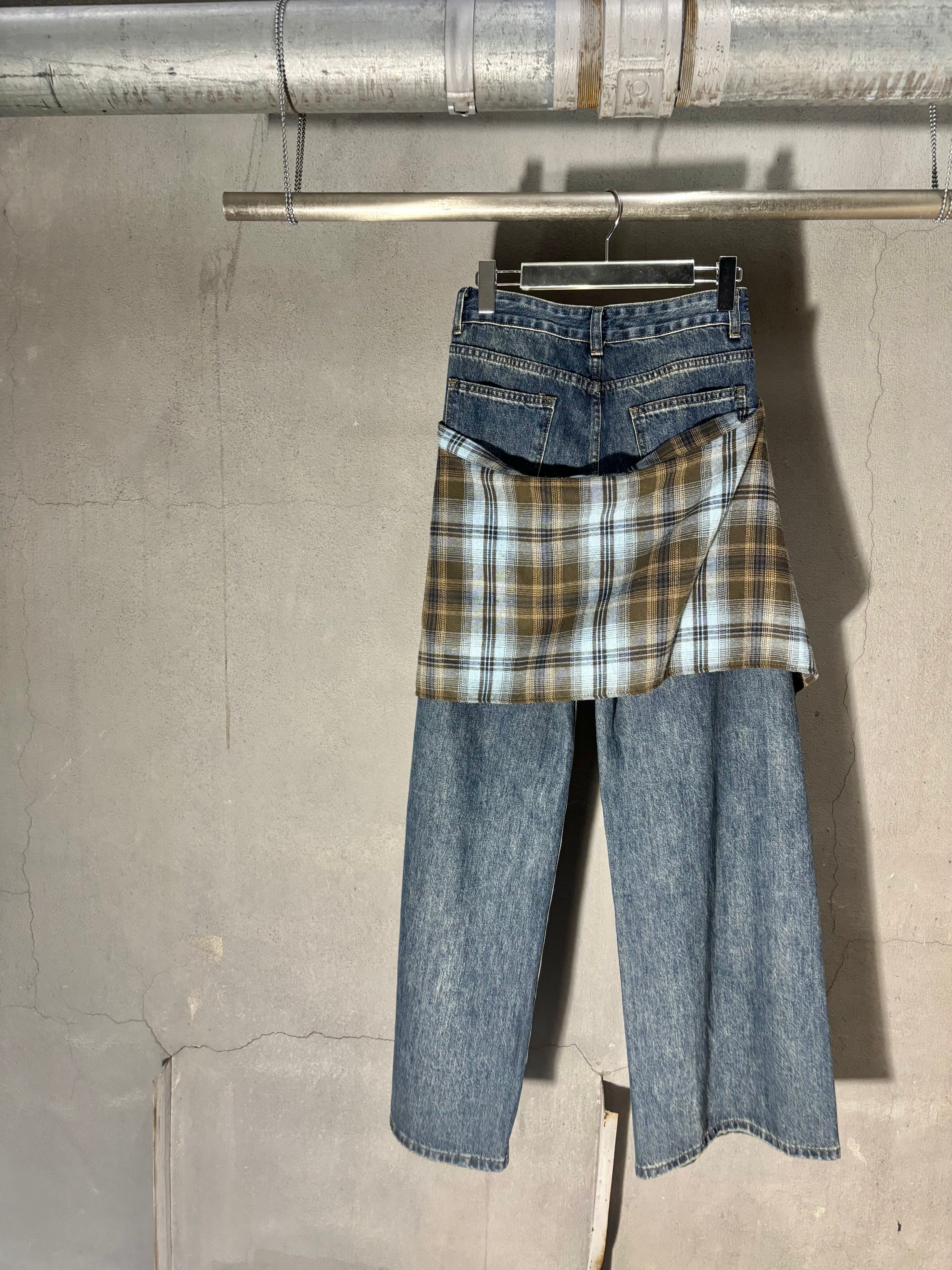 check layer design denim pants パンツ デニム チェック 重ね着風 カジュアル