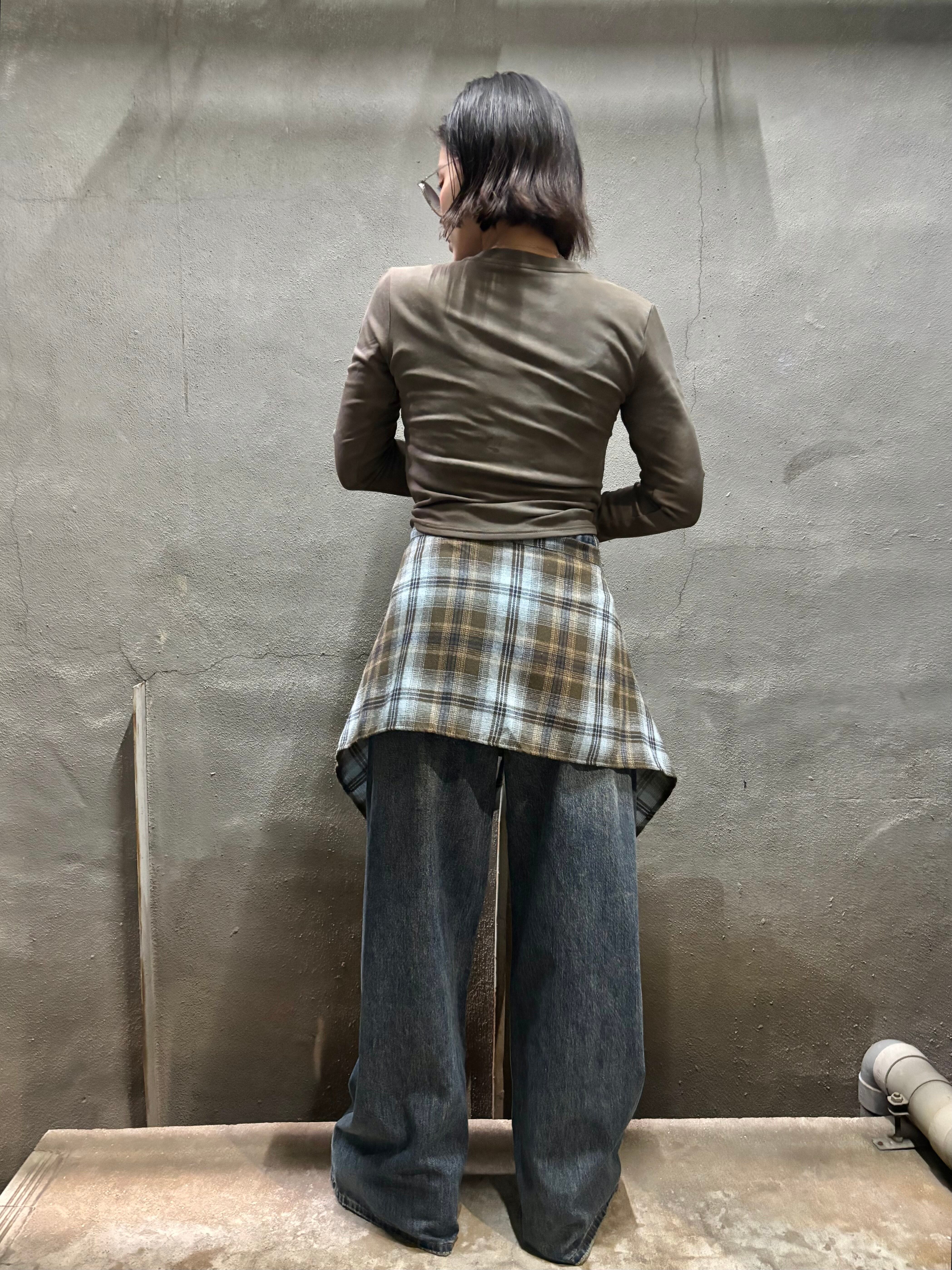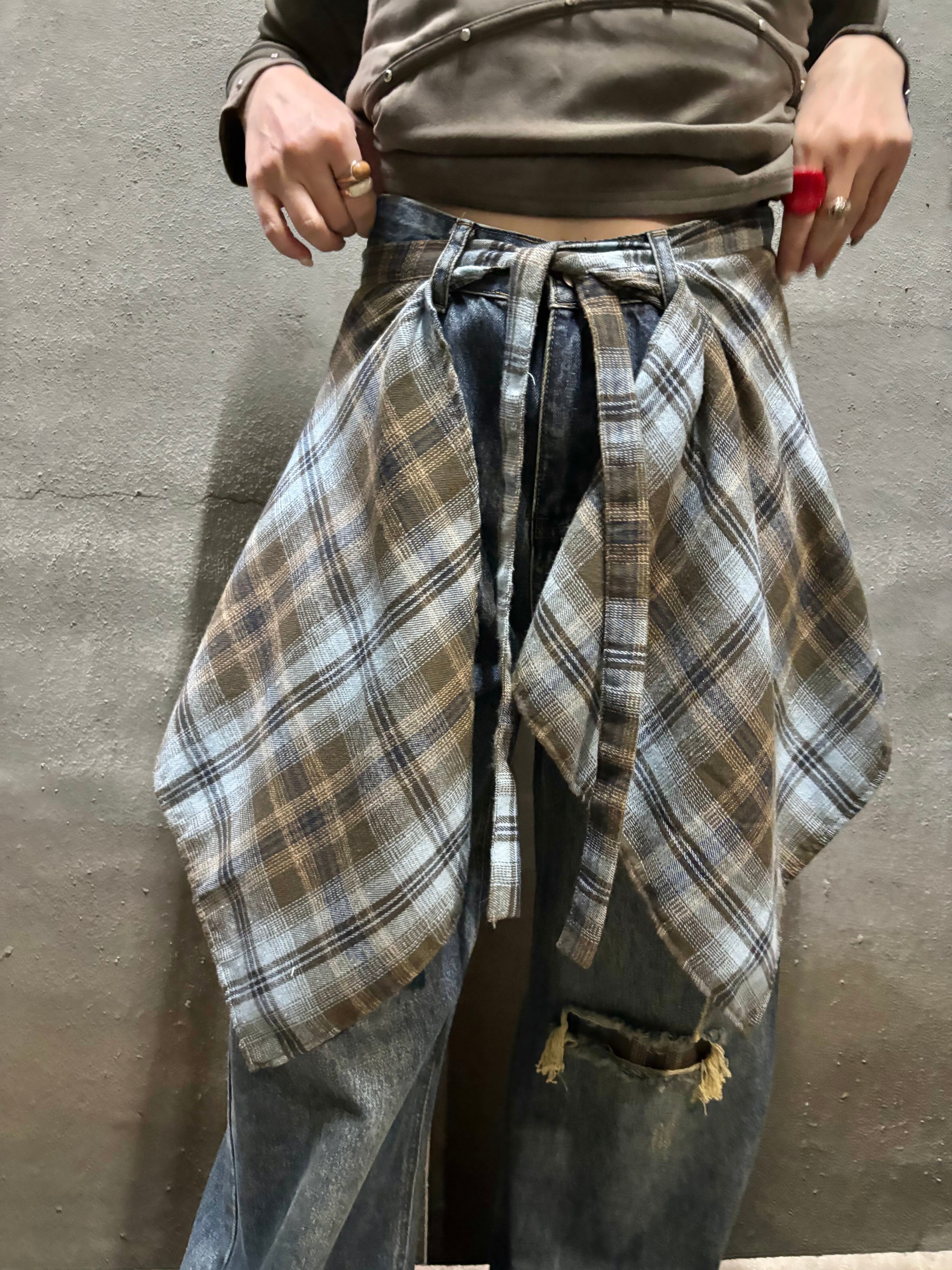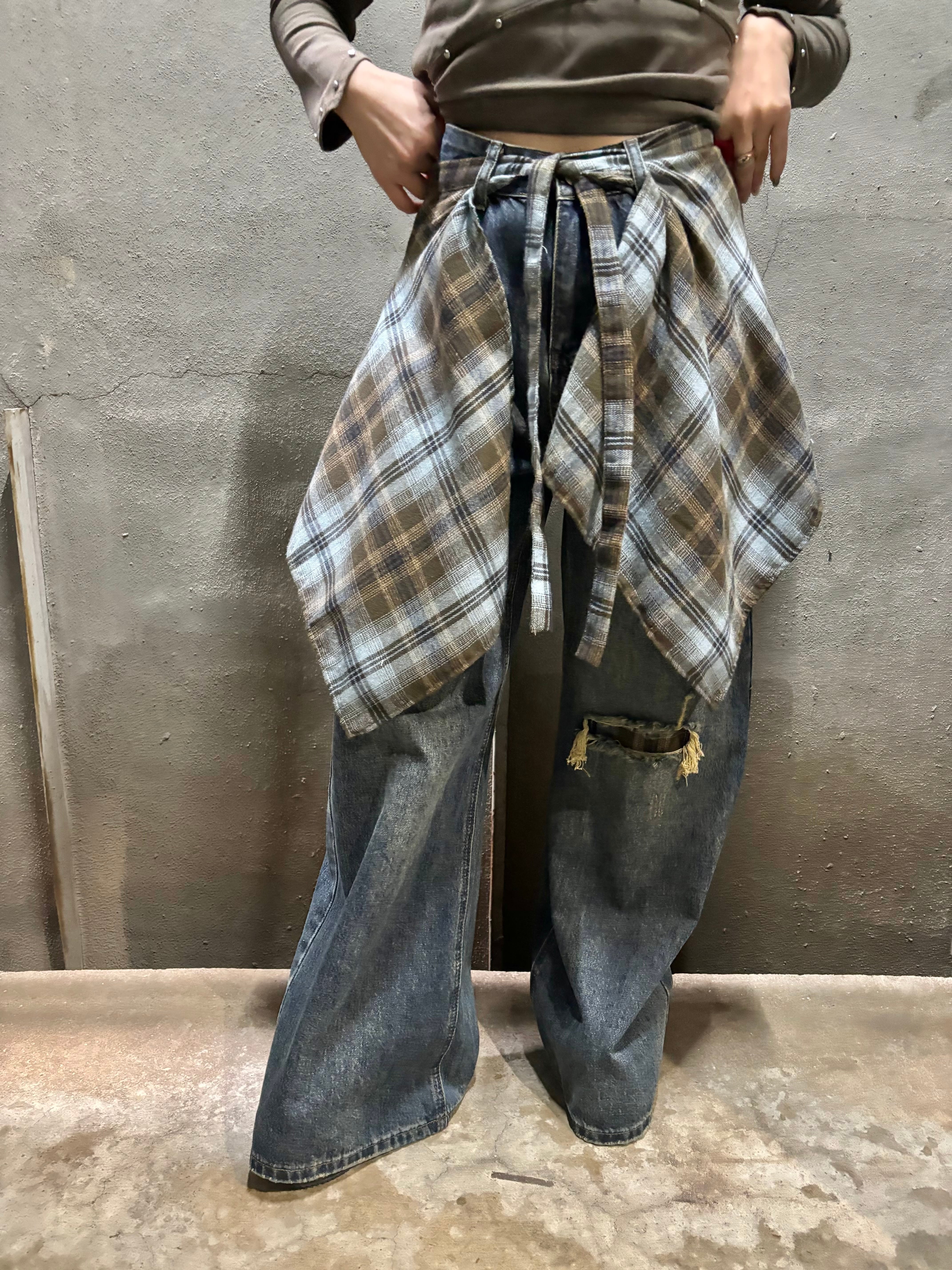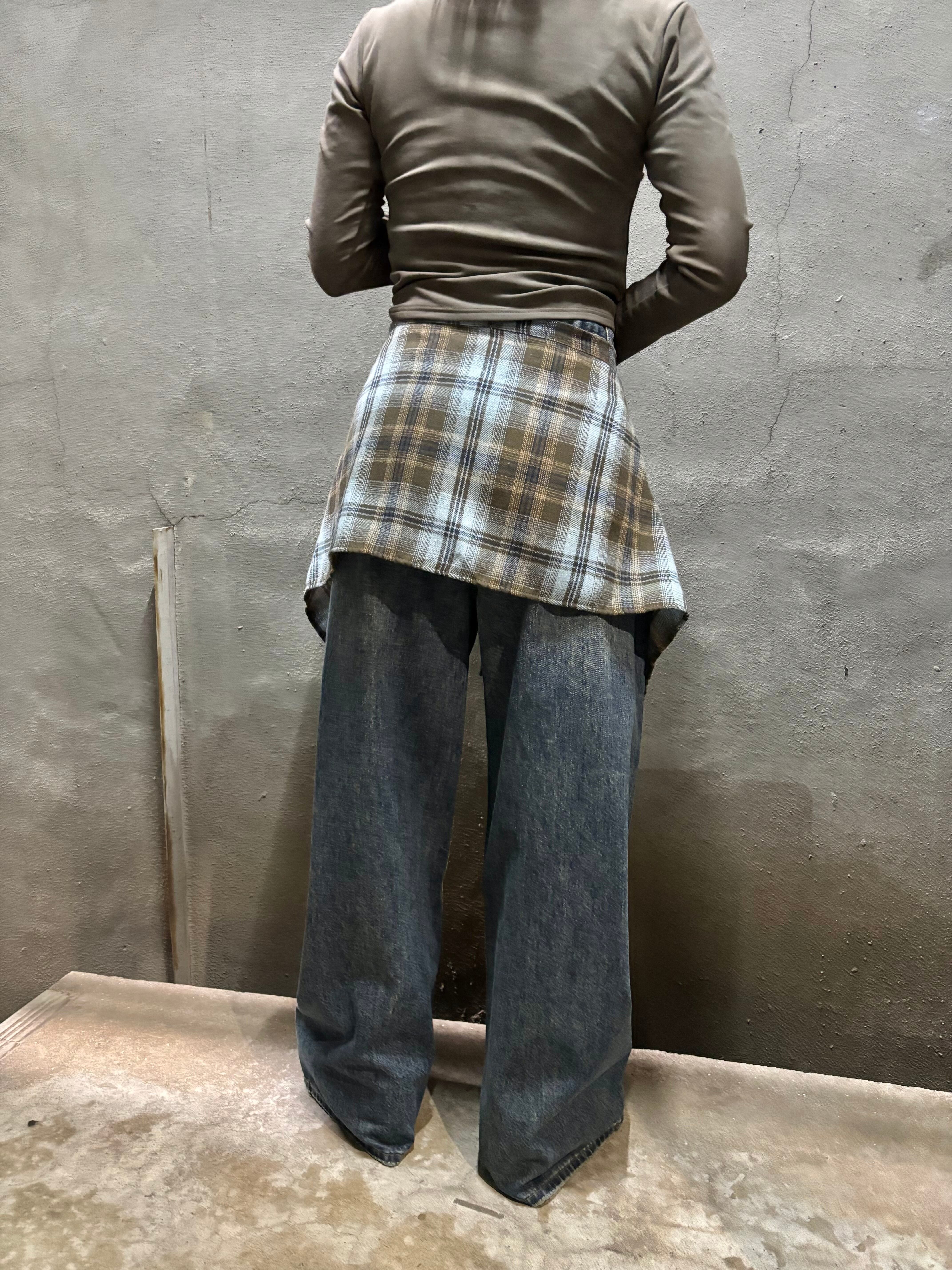 check layer design denim pants パンツ デニム チェック 重ね着風 カジュアル