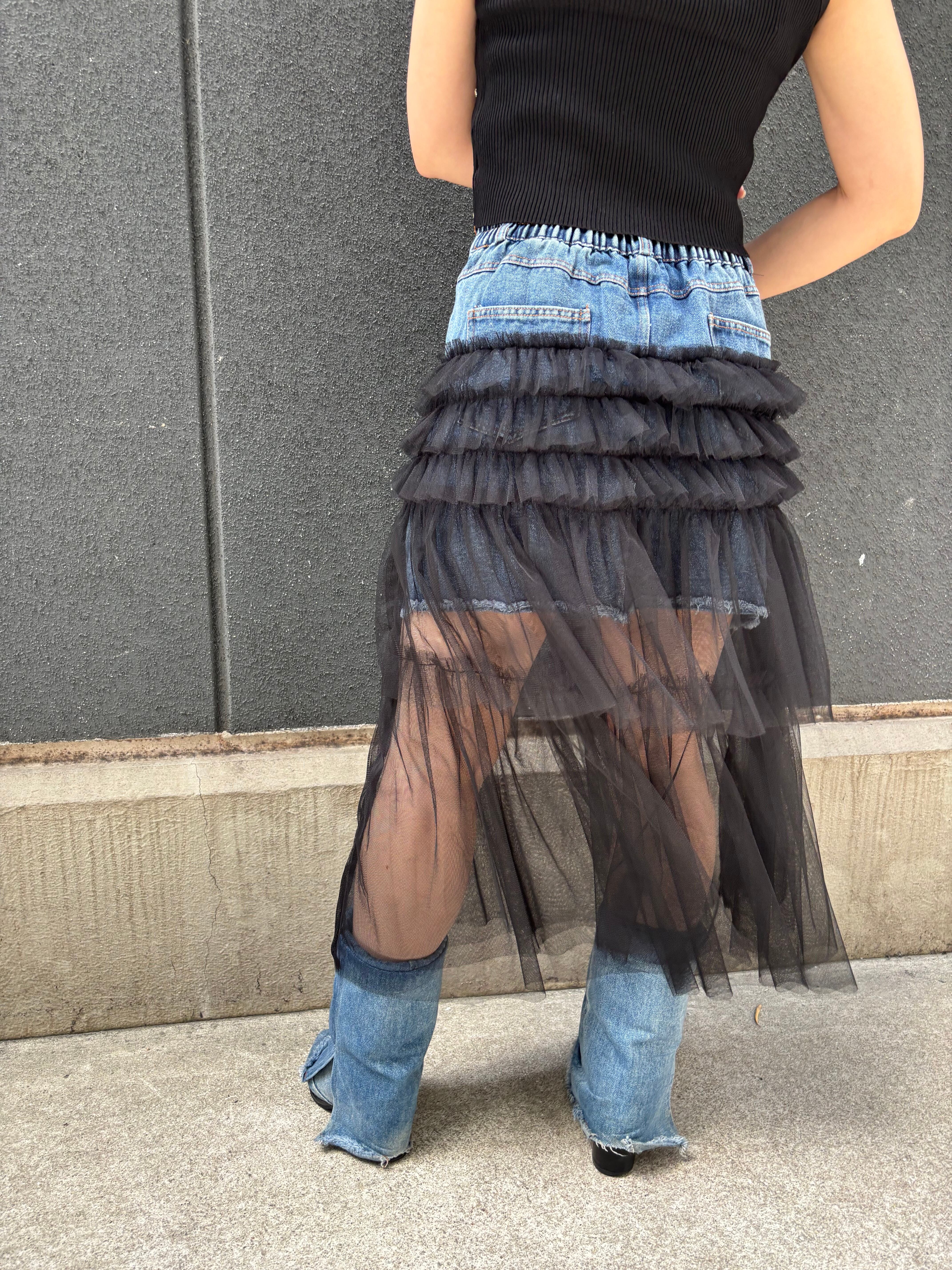 denim × tulle frill docking design skirt スカート デニム チュール フリル ドッキング