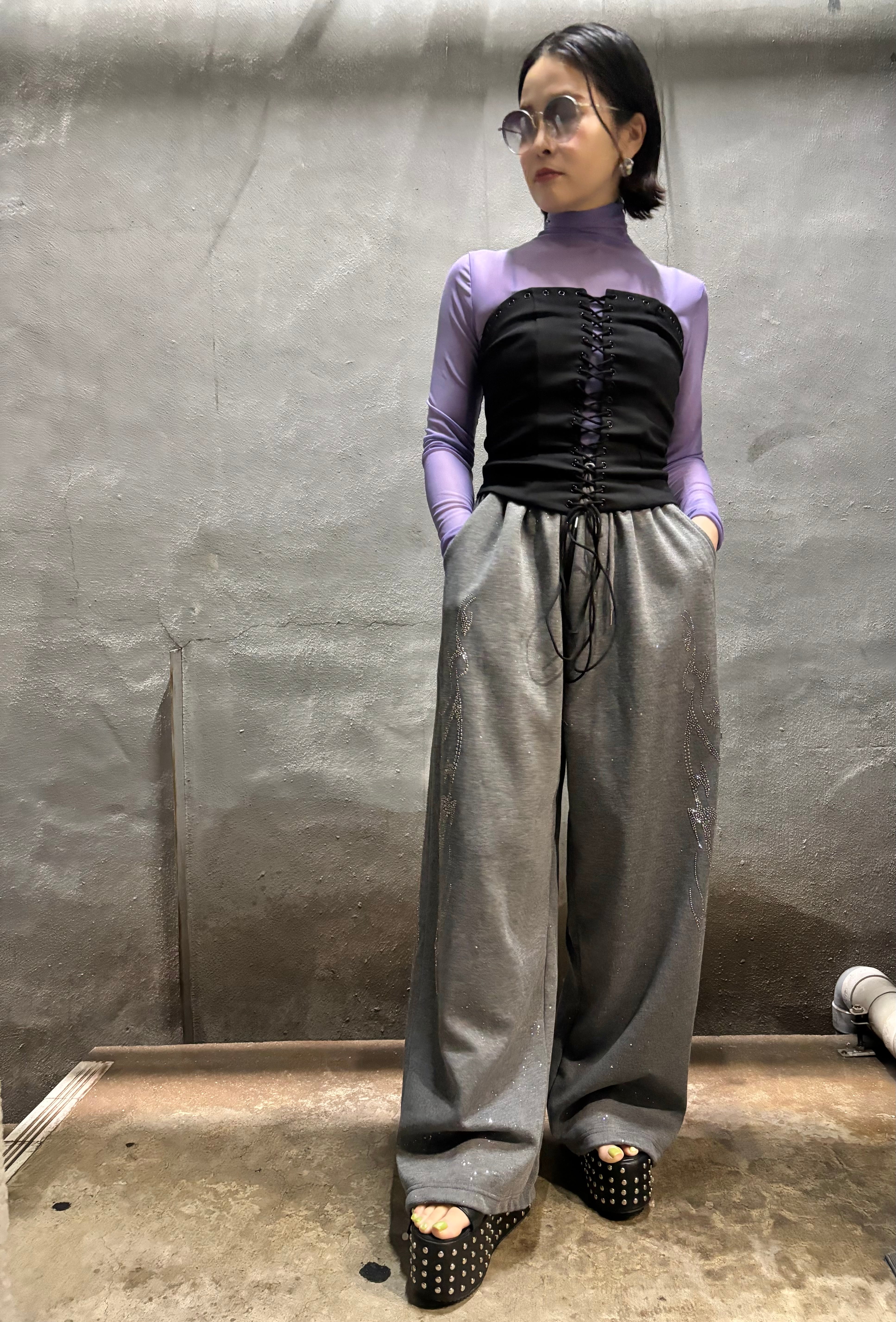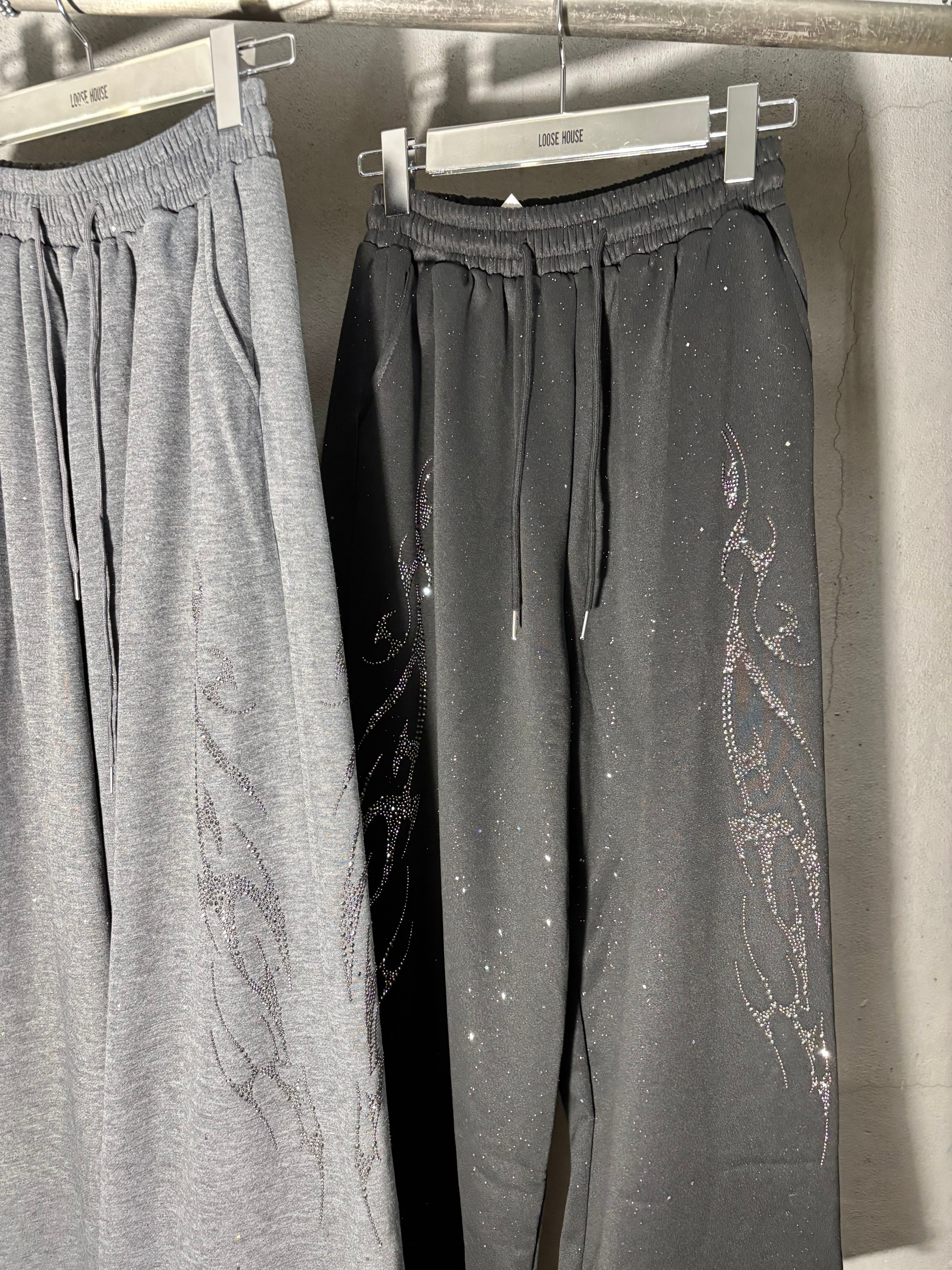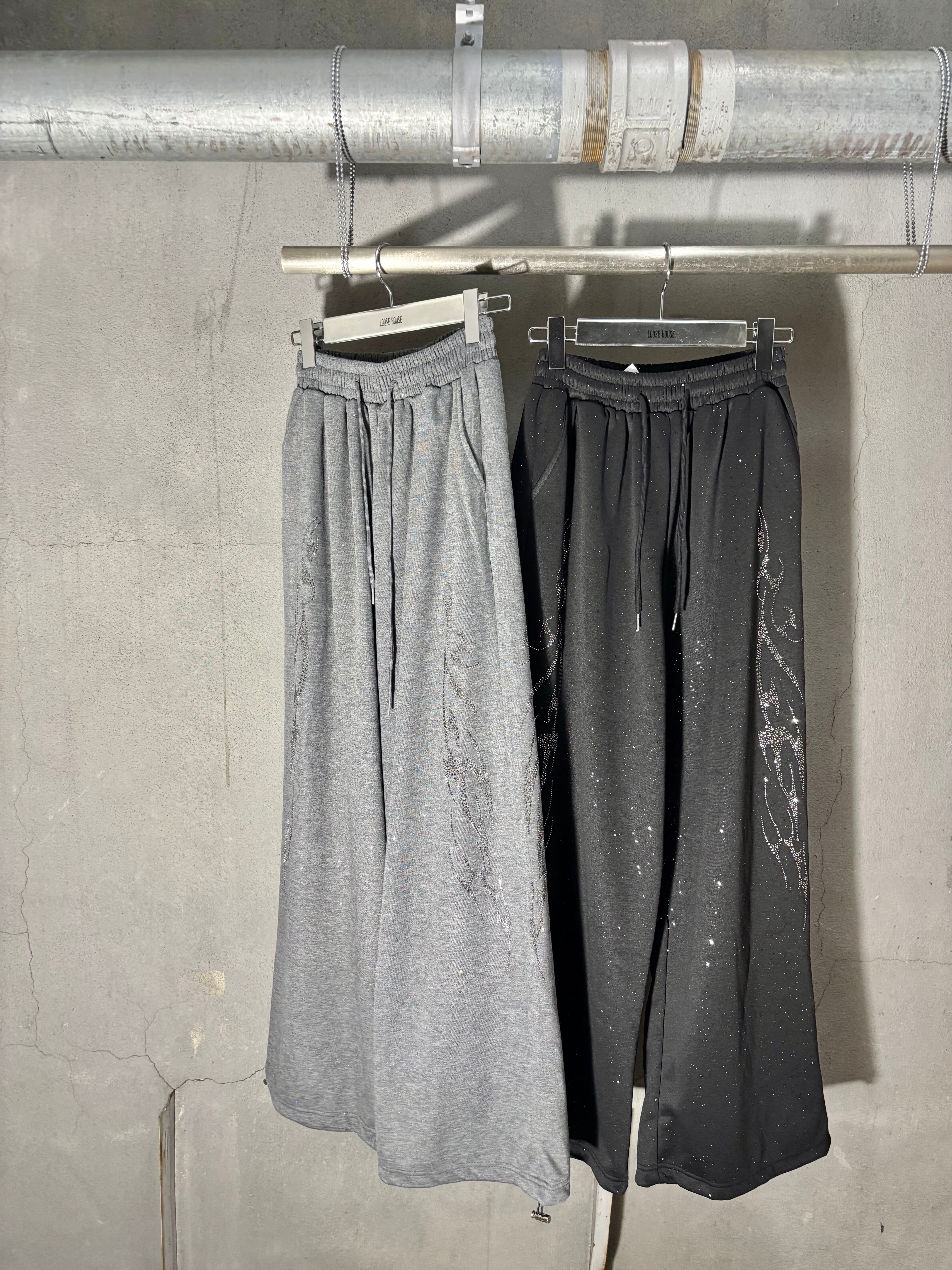 stone bijou sweat wide pants パンツ スウェット ゴムウエスト キラキラ ストーン ドローコード ポケット