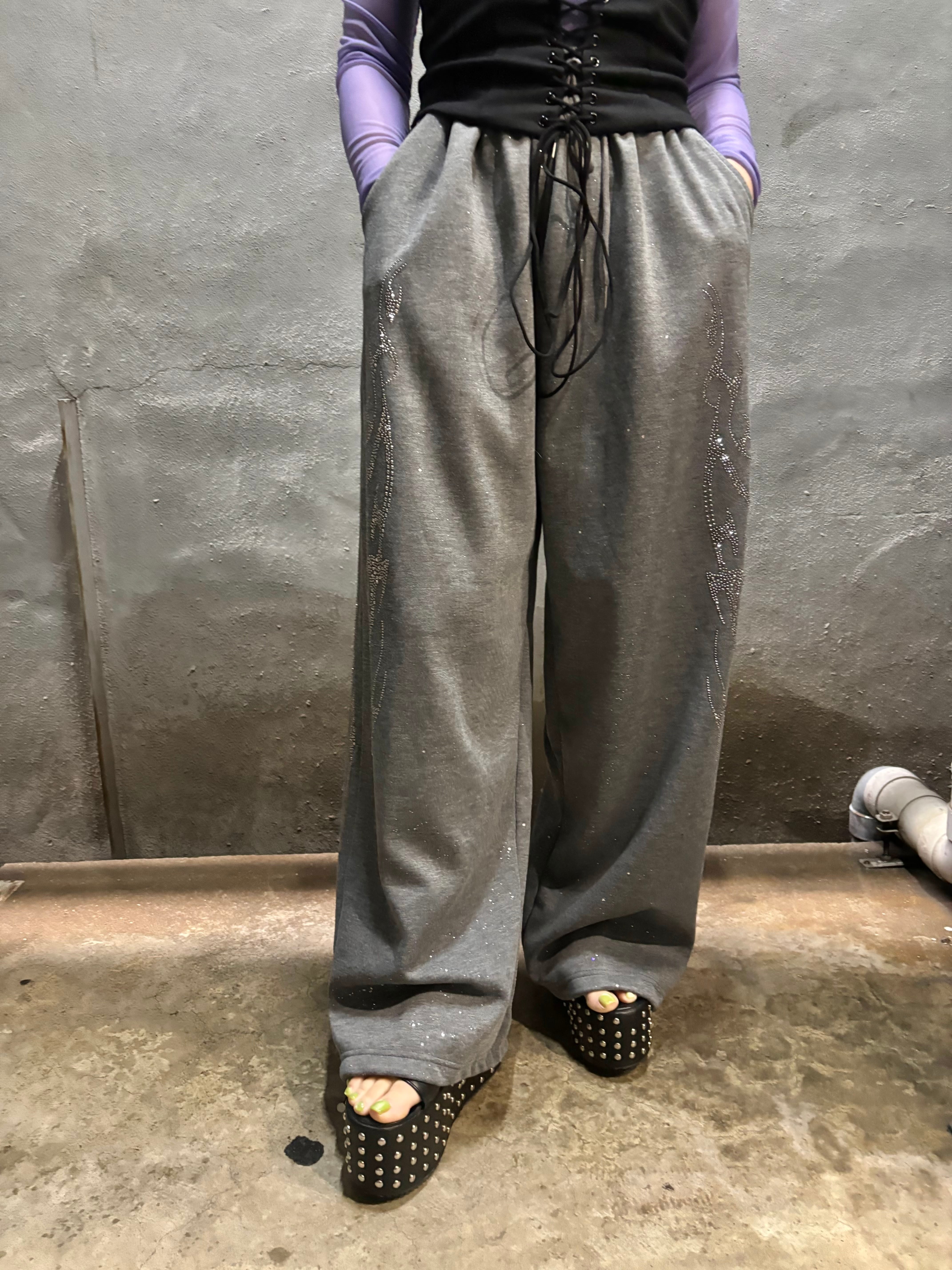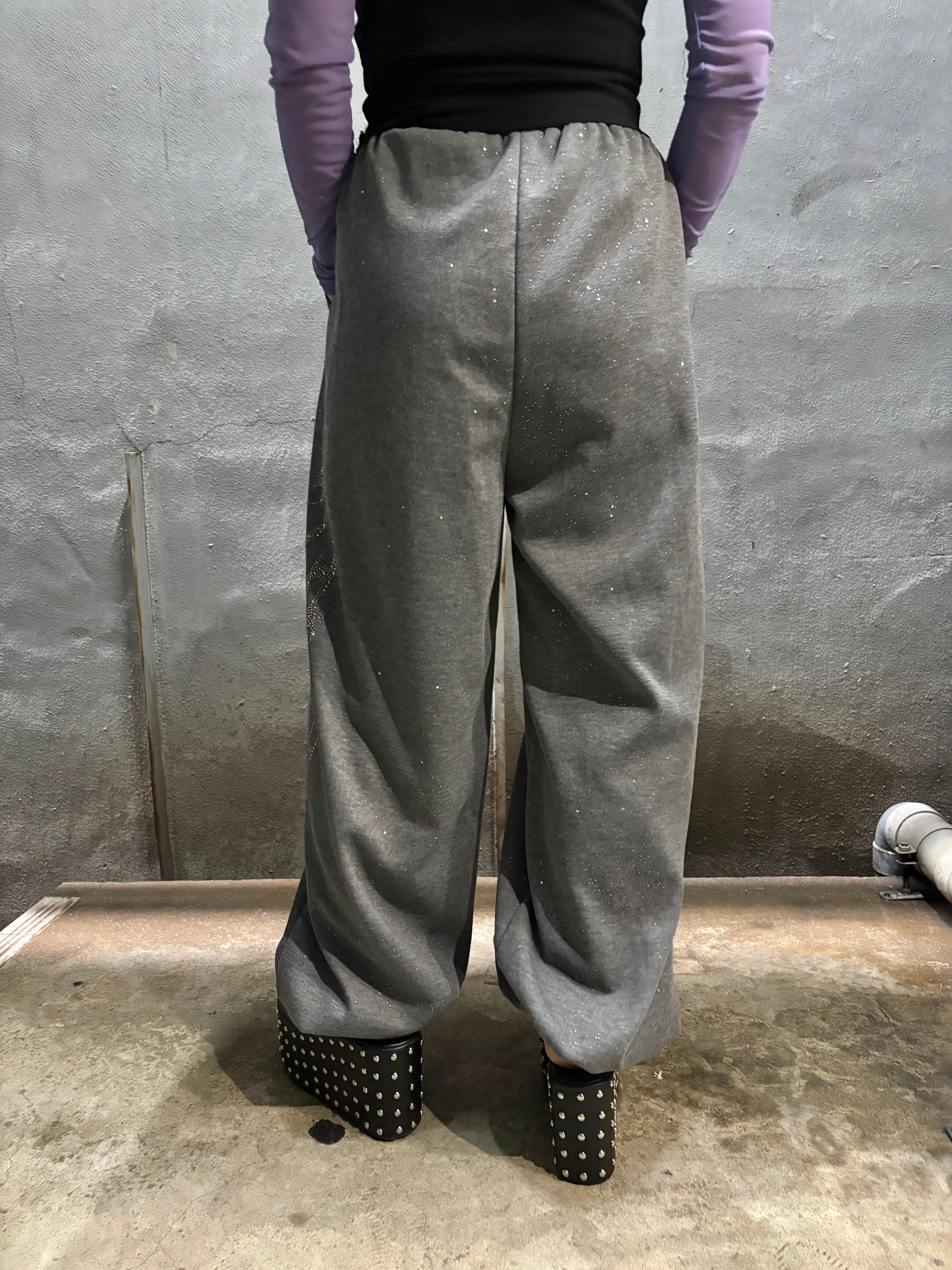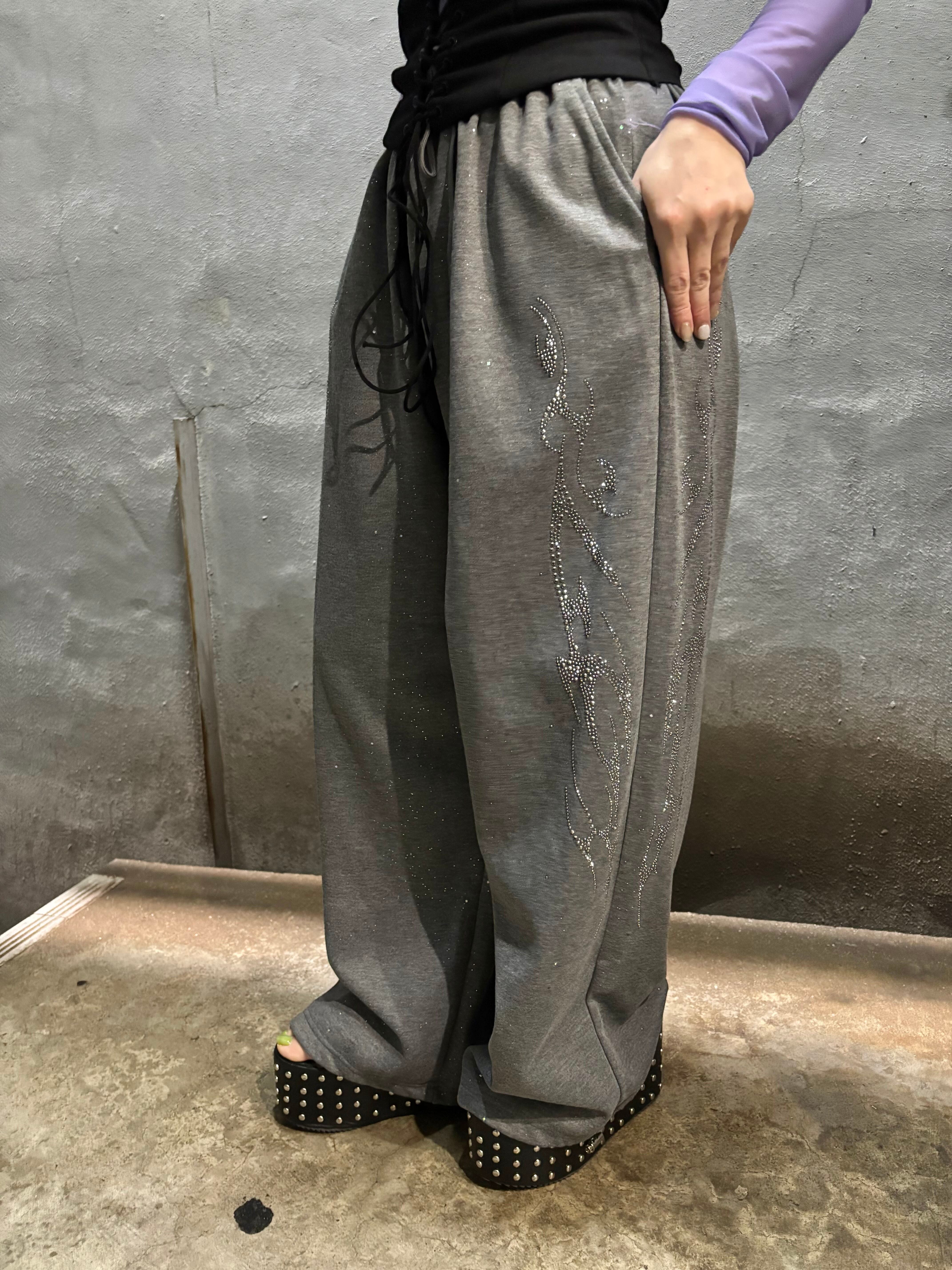 stone bijou sweat wide pants パンツ スウェット ゴムウエスト キラキラ ストーン ドローコード ポケット