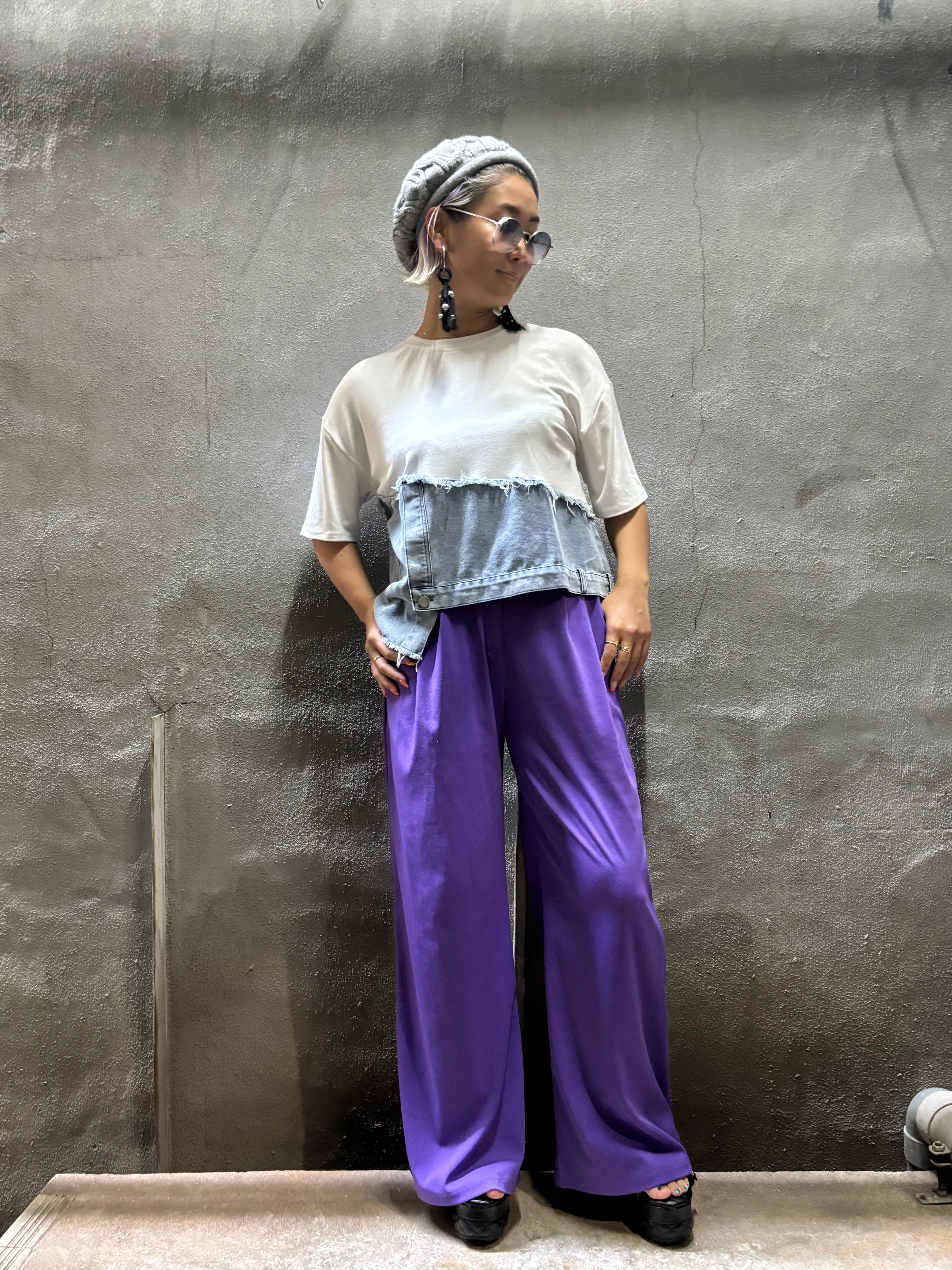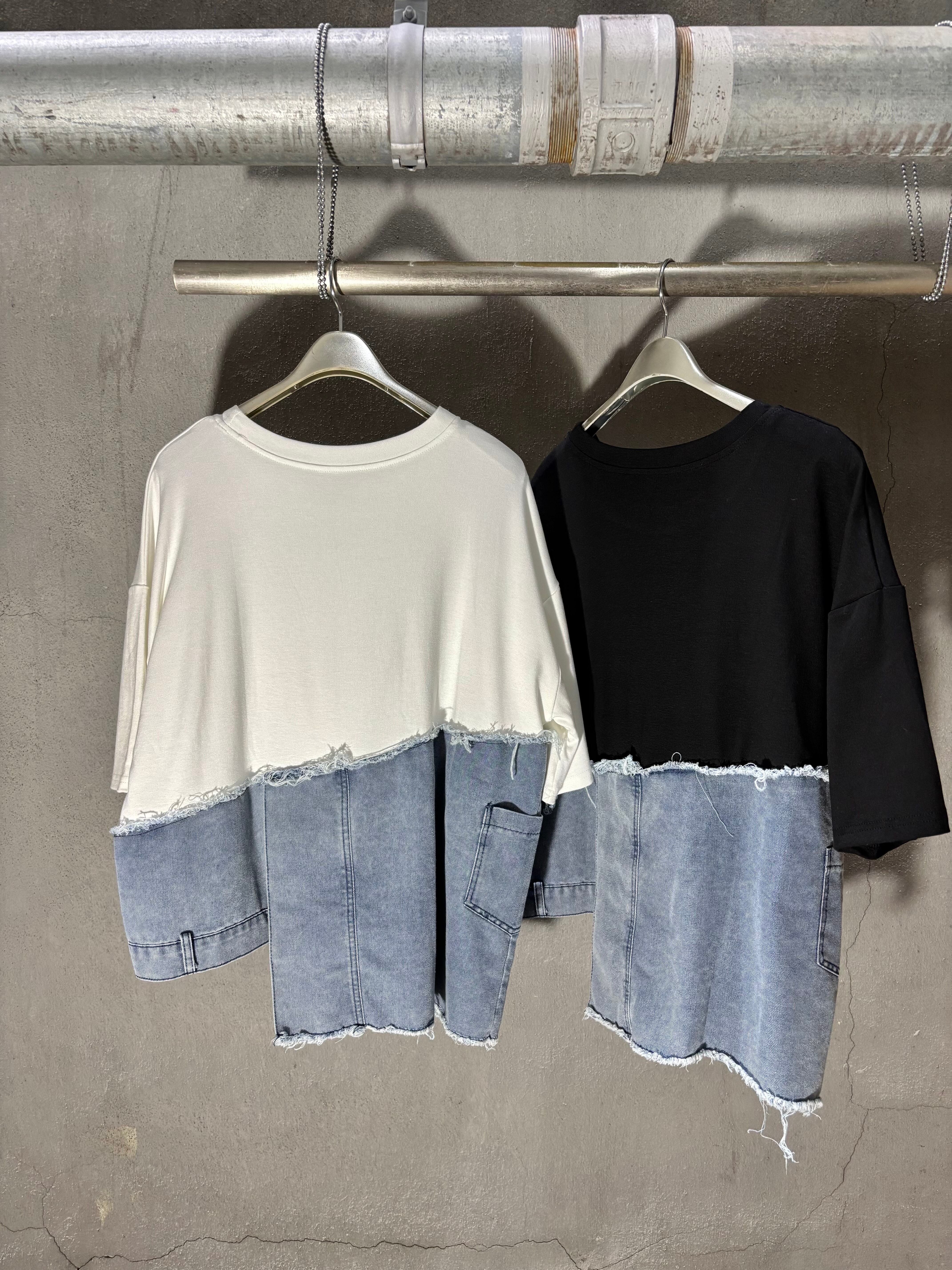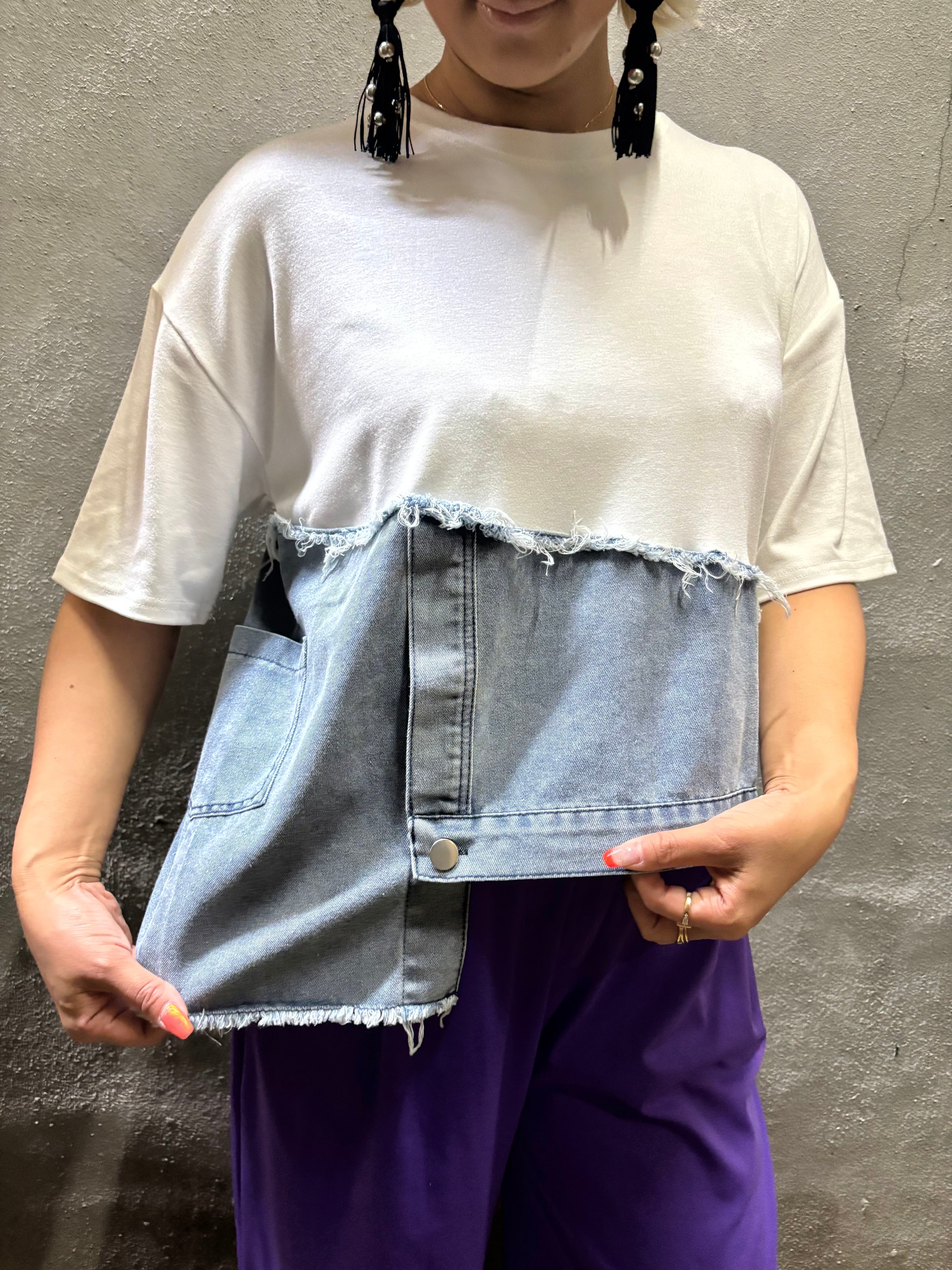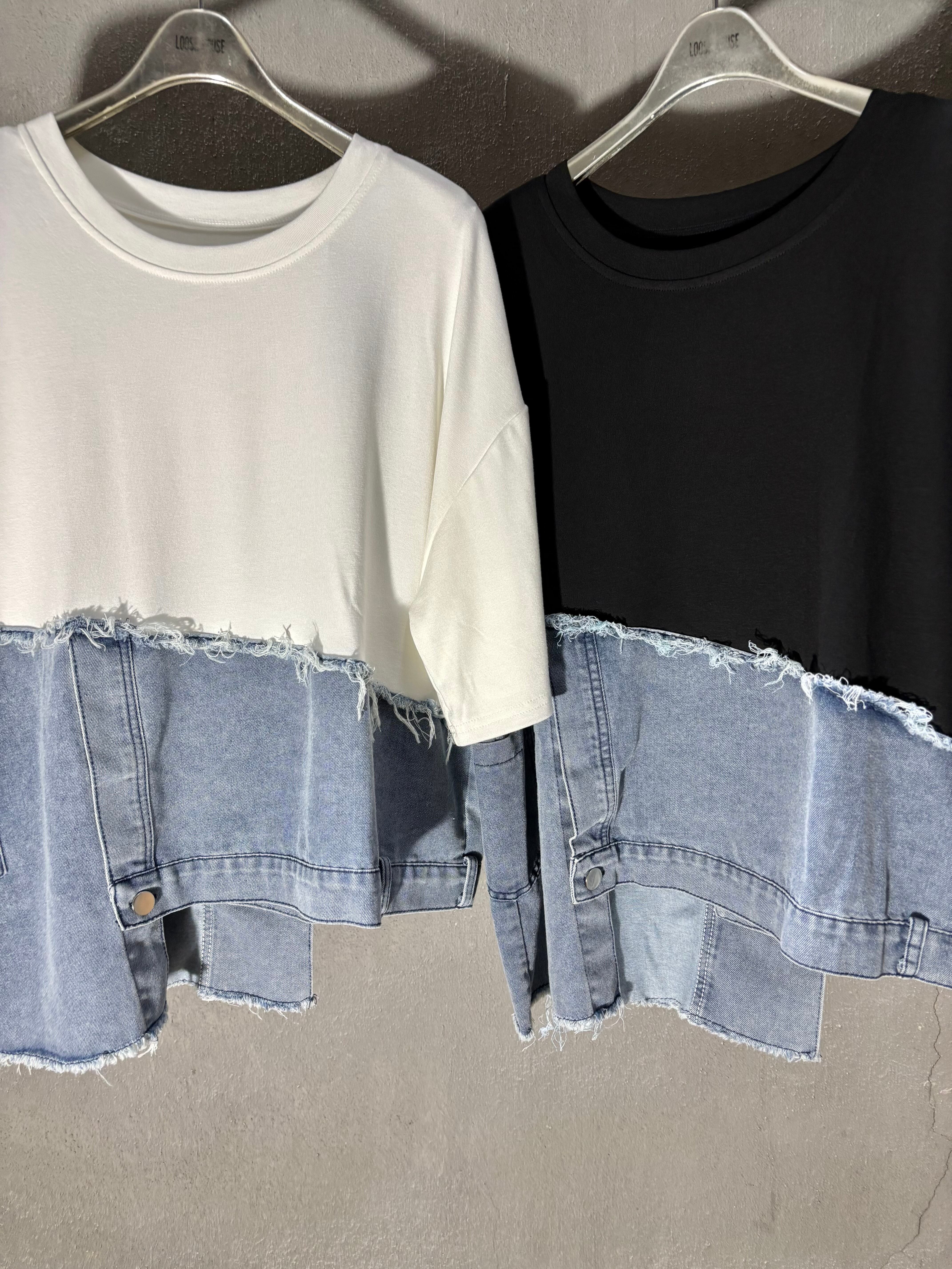 柔らかい素材のTシャツにデニムがドッキングした、カジュアルスタイルにピッタリなトップスです!