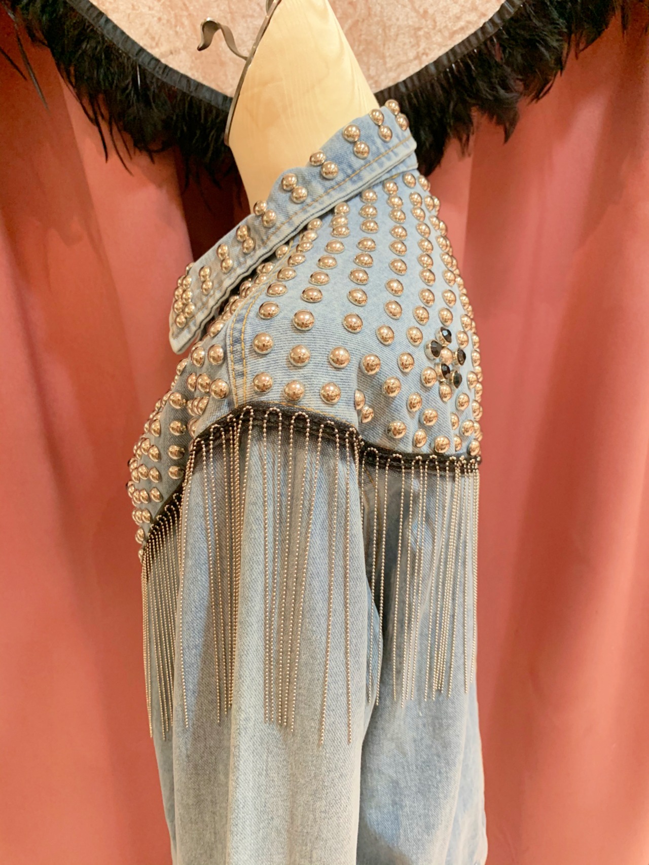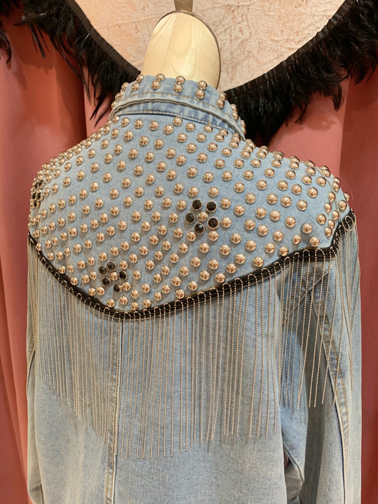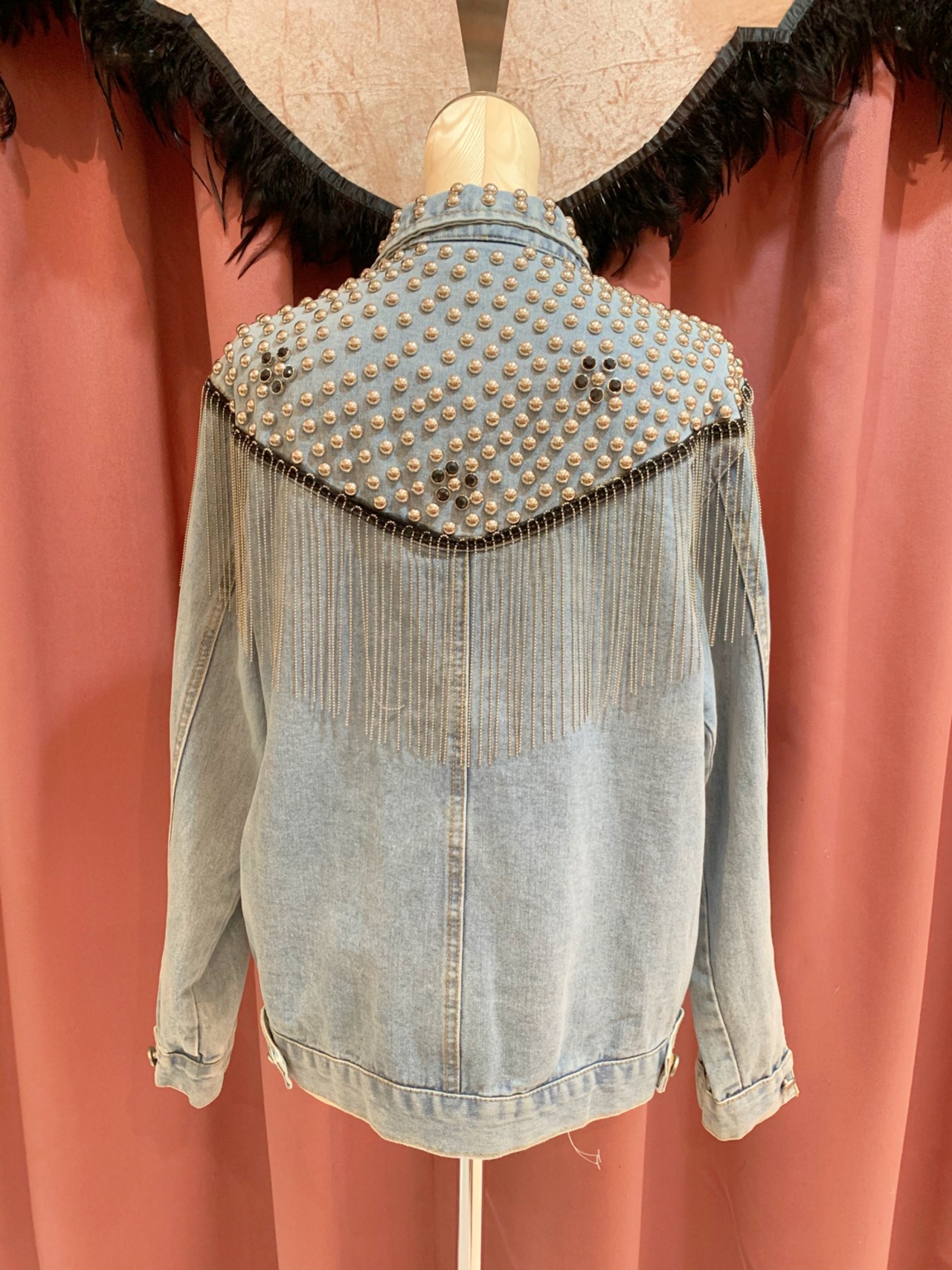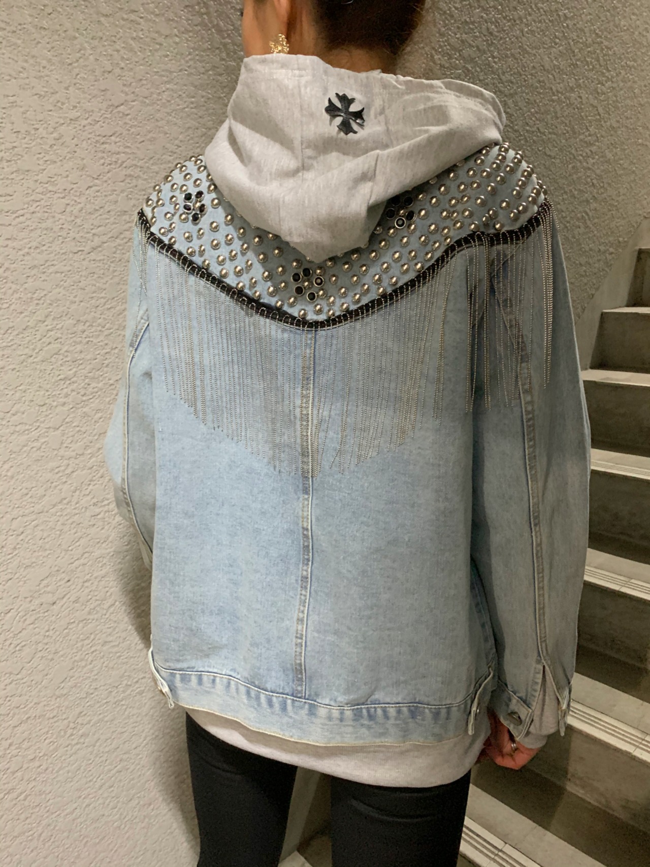 denim jacket デニム デニムジャケット ジャケット スタッズ フリンジ ボールチェーン チェーン デザインジャケット かっこいい おしゃれ インポート 個性的 ユニーク