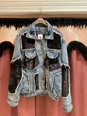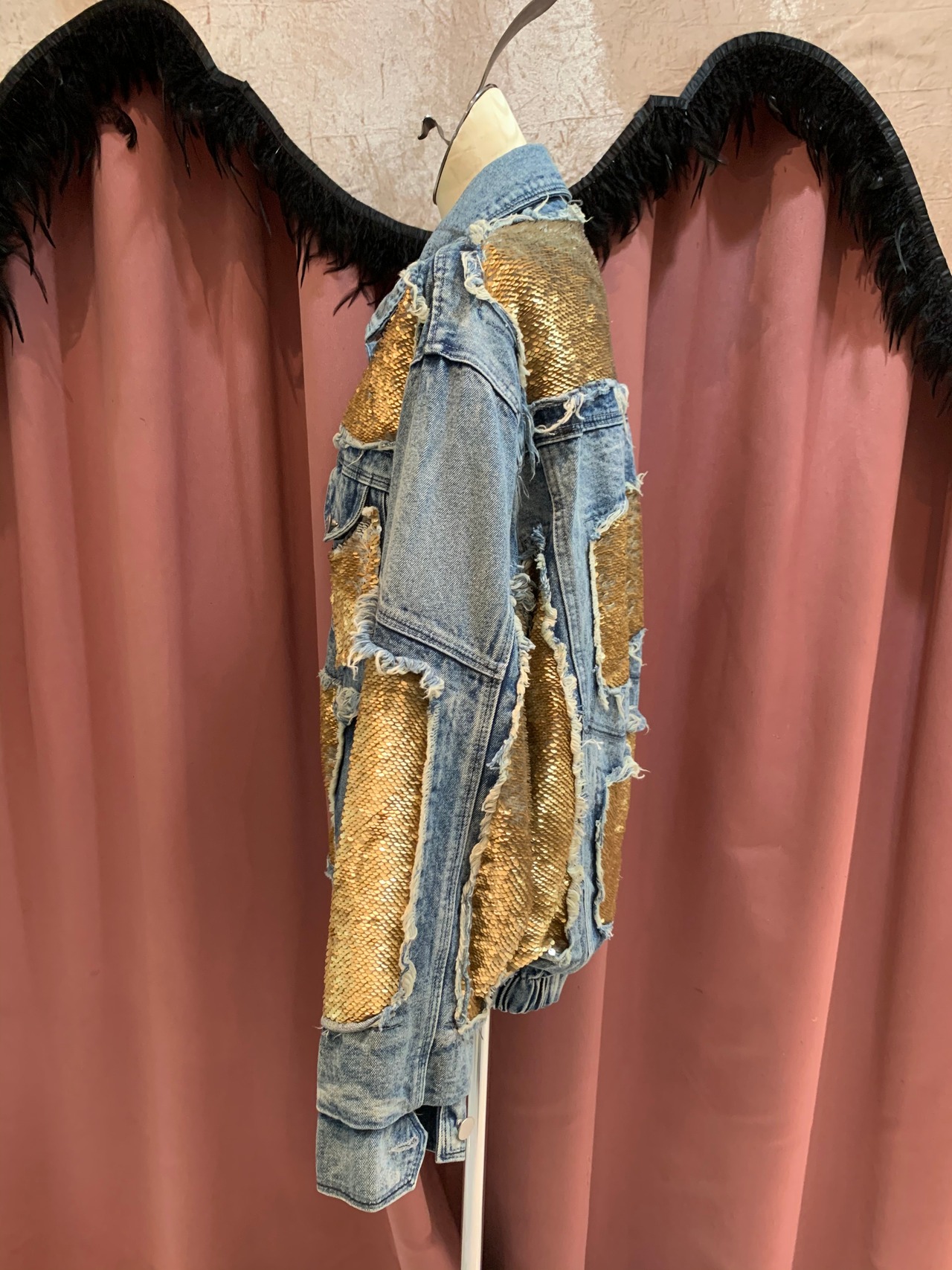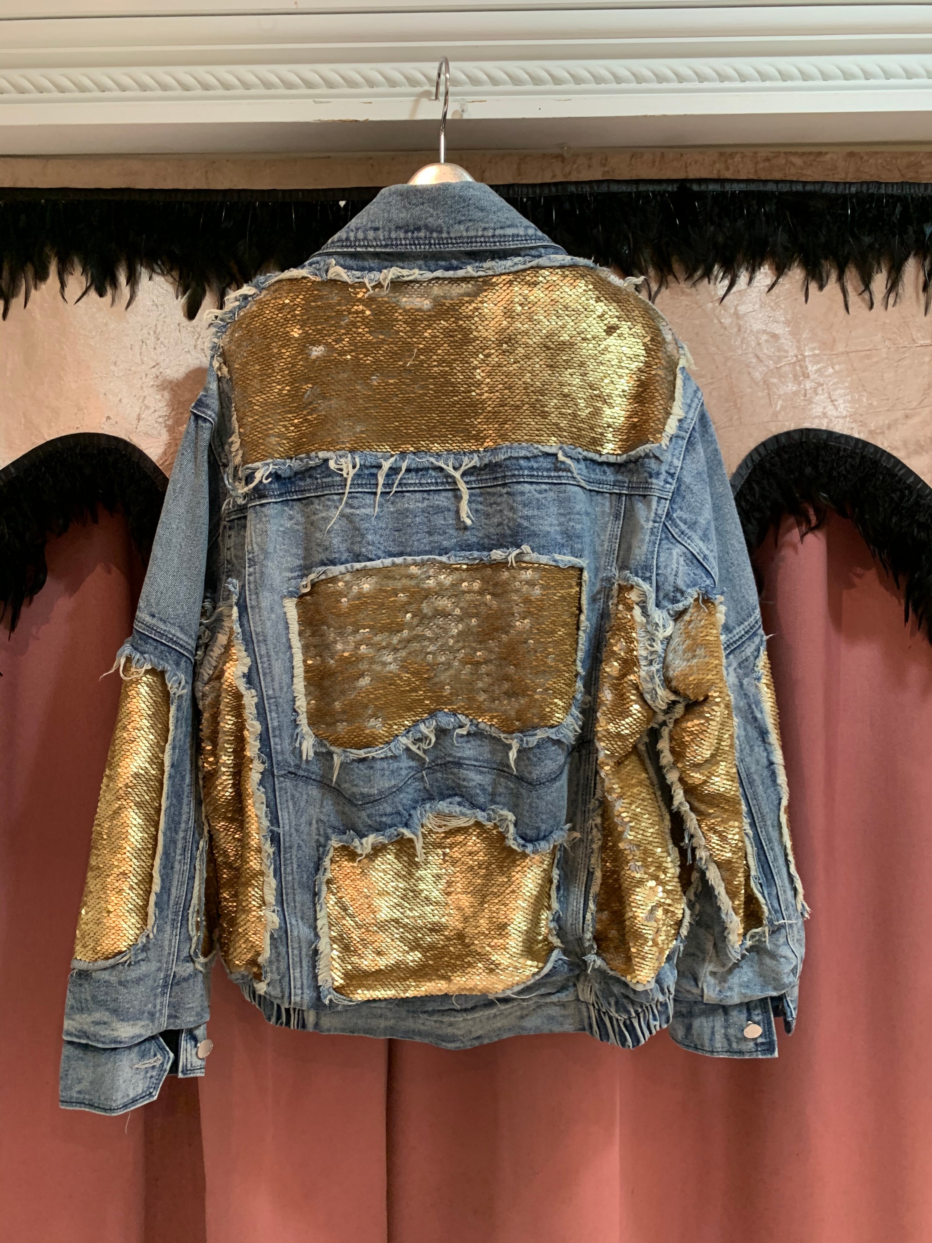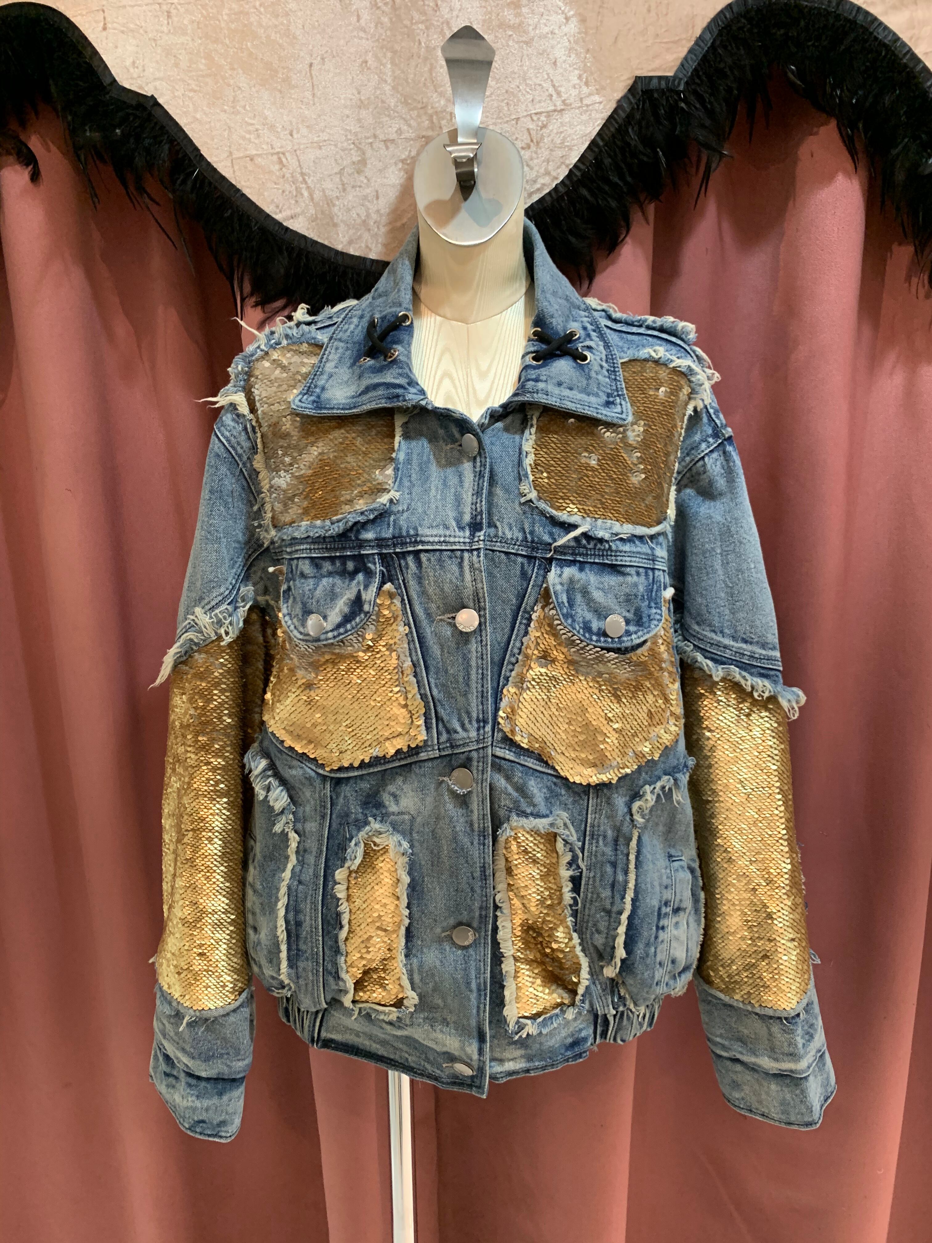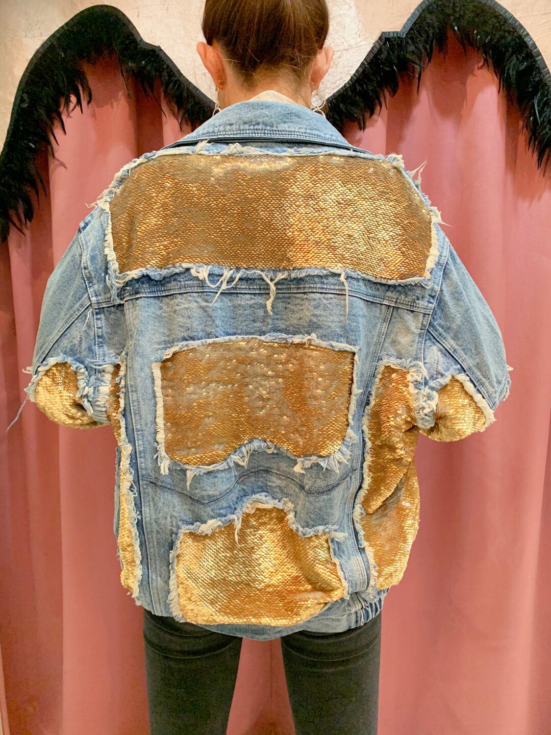 denim jacket デニム デニムジャケット スパンコール カメレオンスパン キラキラ ゴールド 派手 個性的 インポート おしゃれ オーバーサイズ ゆったりめ ビッグシルエット