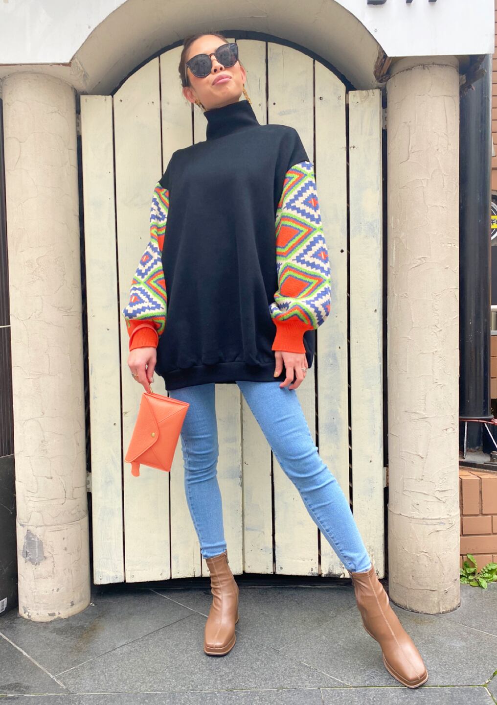 change sleeve sweat tunic スウェット スエット トレーナー デザインスリーブ 切替スリーブ ニット ニット切替 ネイティブ ネイティブ柄 ハイネック インポート おしゃれ かわいい ゆったりめ