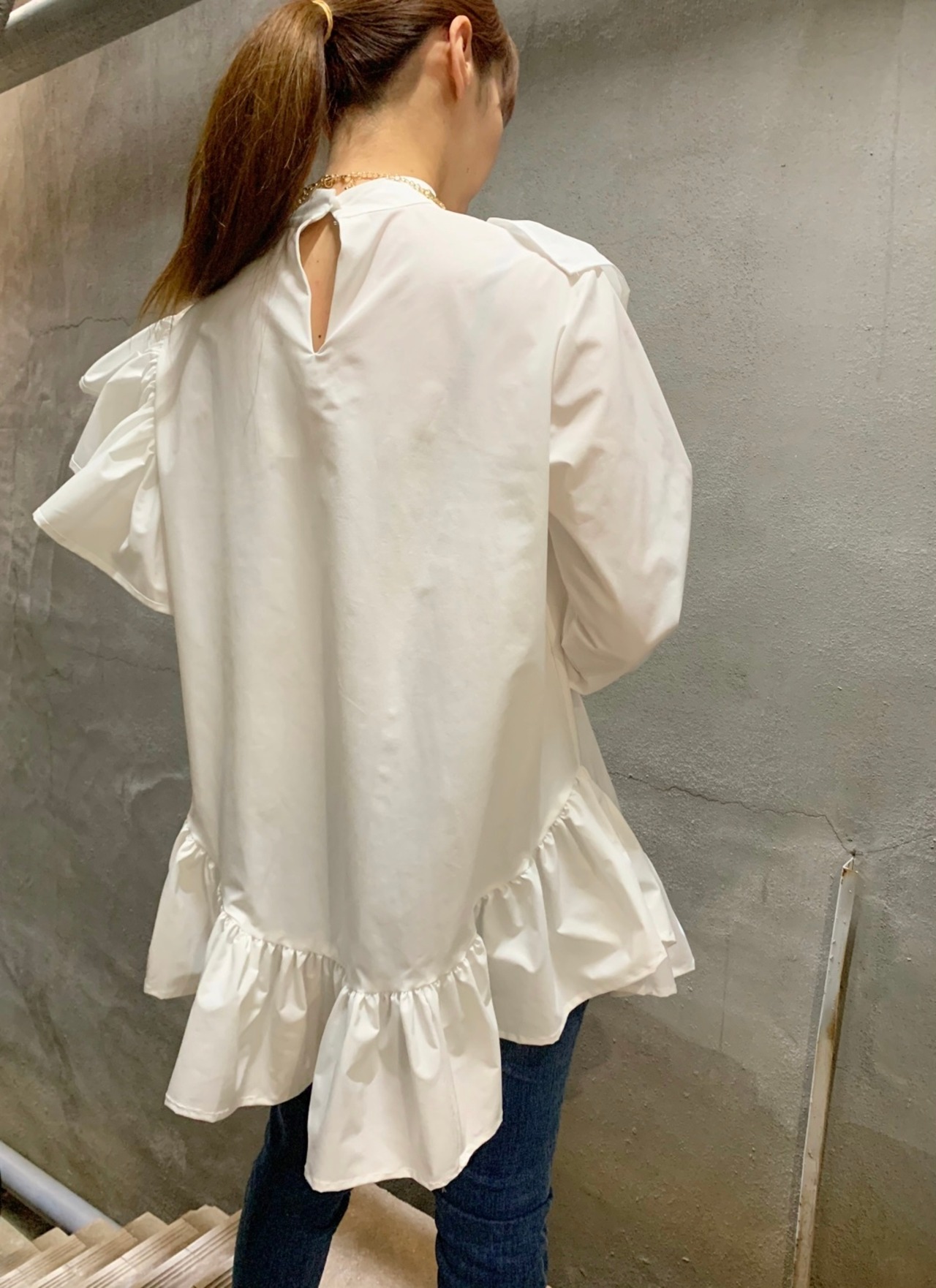 frill shirt tops フリル シャツ トップス チュニック ランダムフリル スタンドネック ボリューム