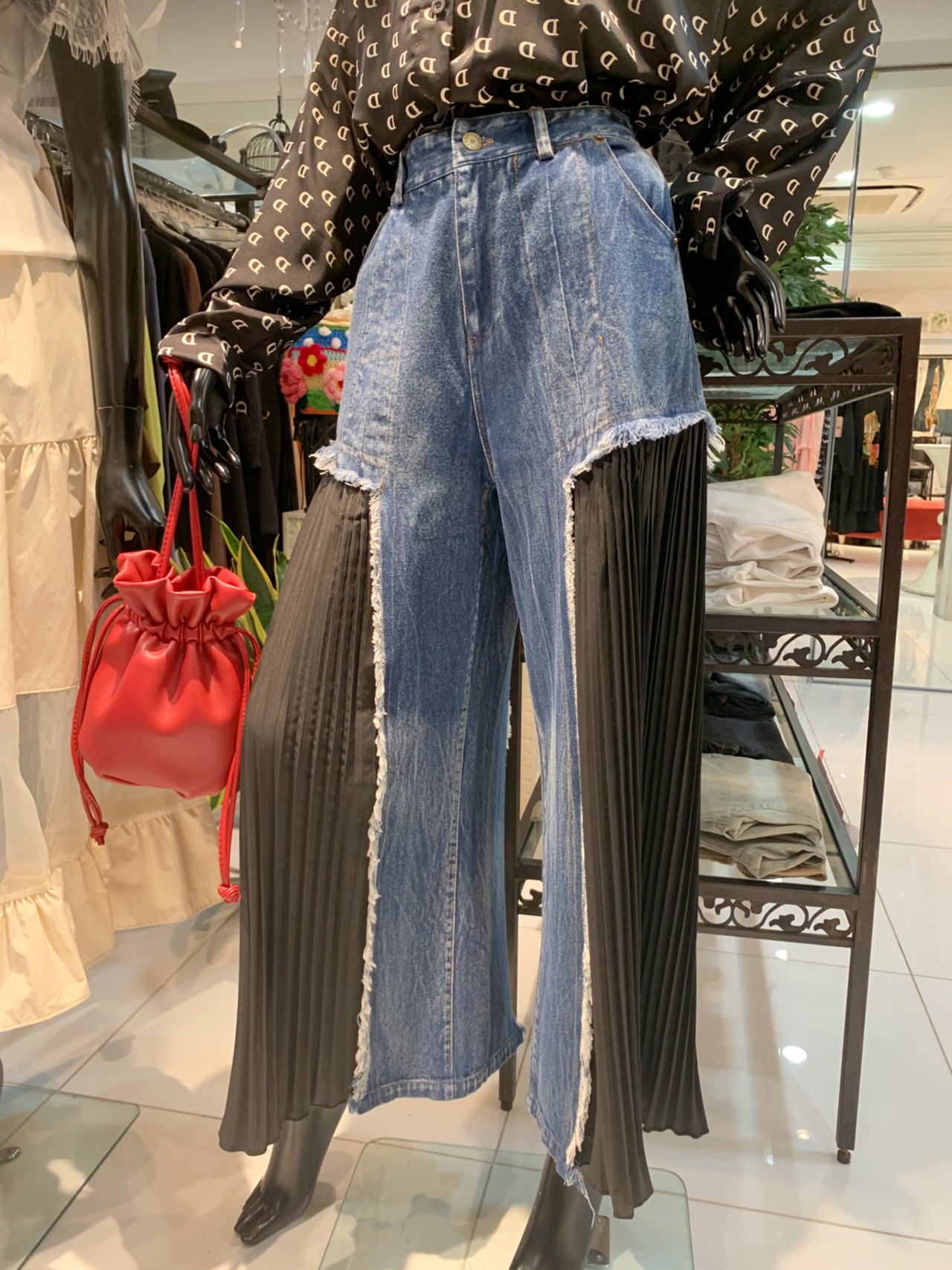 denim wide pants デニム ワイド パンツ プリーツ 切替 異素材 オシャレ インポート ハイウエスト