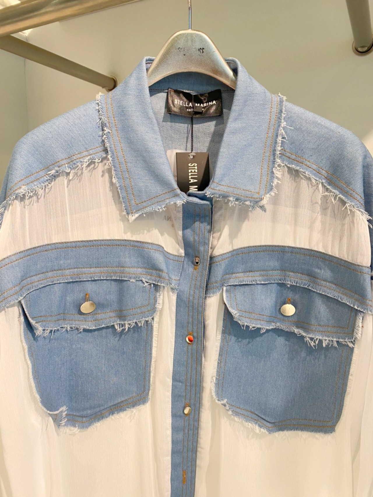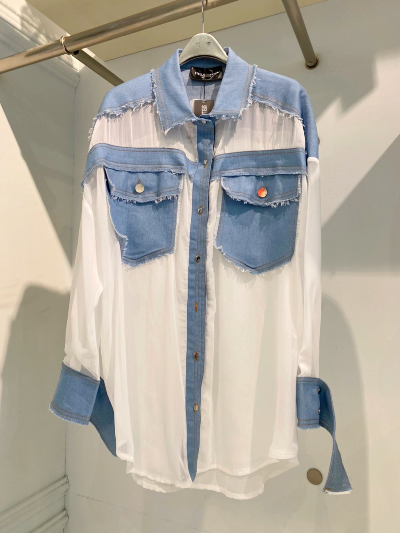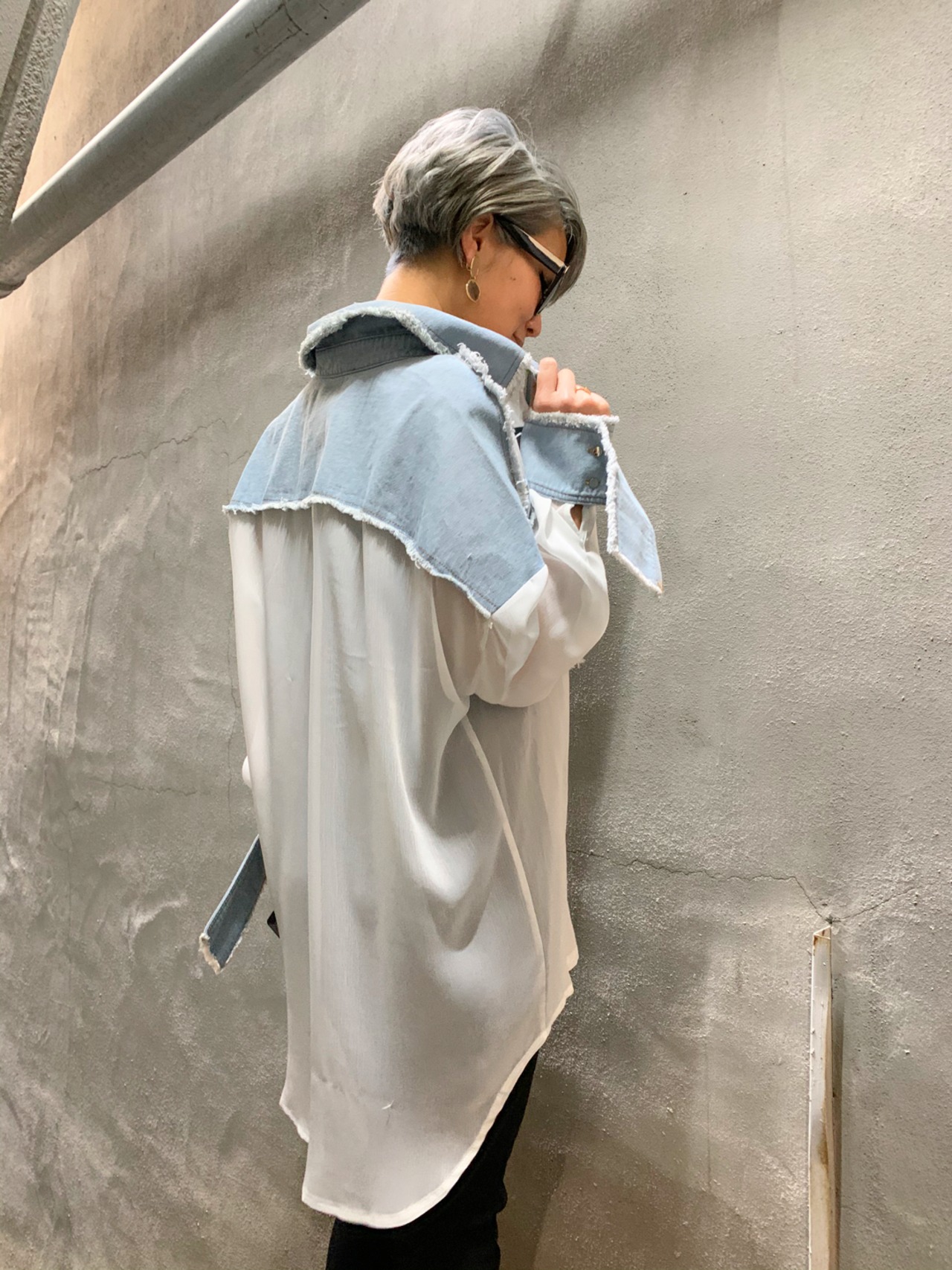 denim×chiffon design shirt シャツ デニム デザイン デニム切替 シフォン シースルー