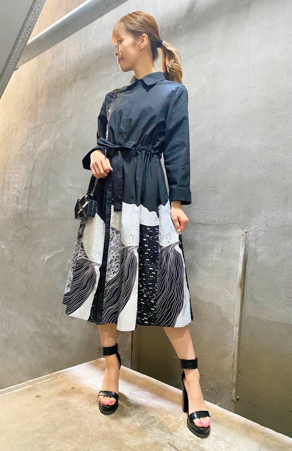 shirt one piece バイカラー プリント Aライン シャツ ワンピース ウエストマーク ロング丈 モノトーン 襟付き