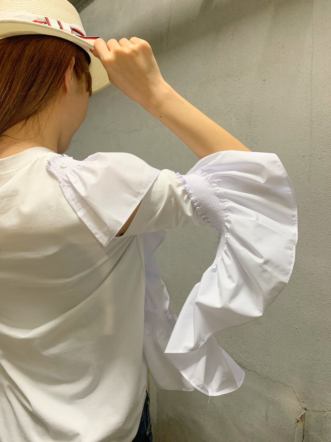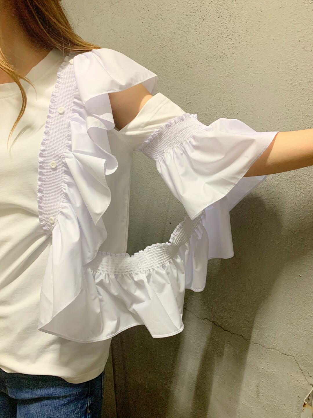 frill open sleeve tops フリル トリミング オープン スリーブ トップス Tシャツ 変形 イレギュラー シルエット