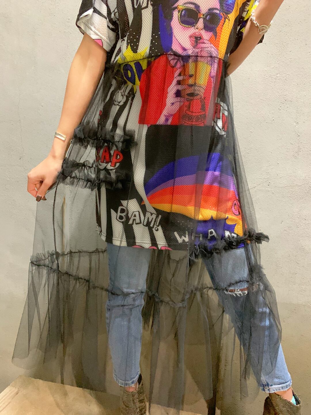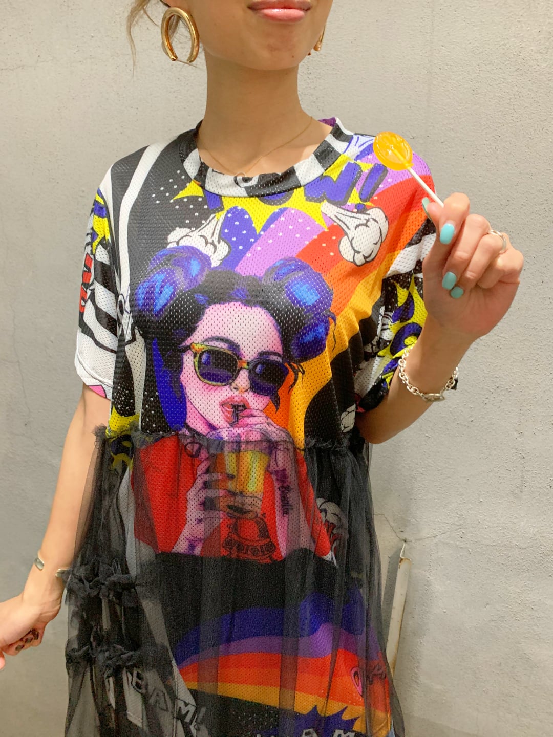 american comic print tulle cover mesh T-one-piece ワンピース Tシャツ メッシュ ガールプリント アメコミ チュール