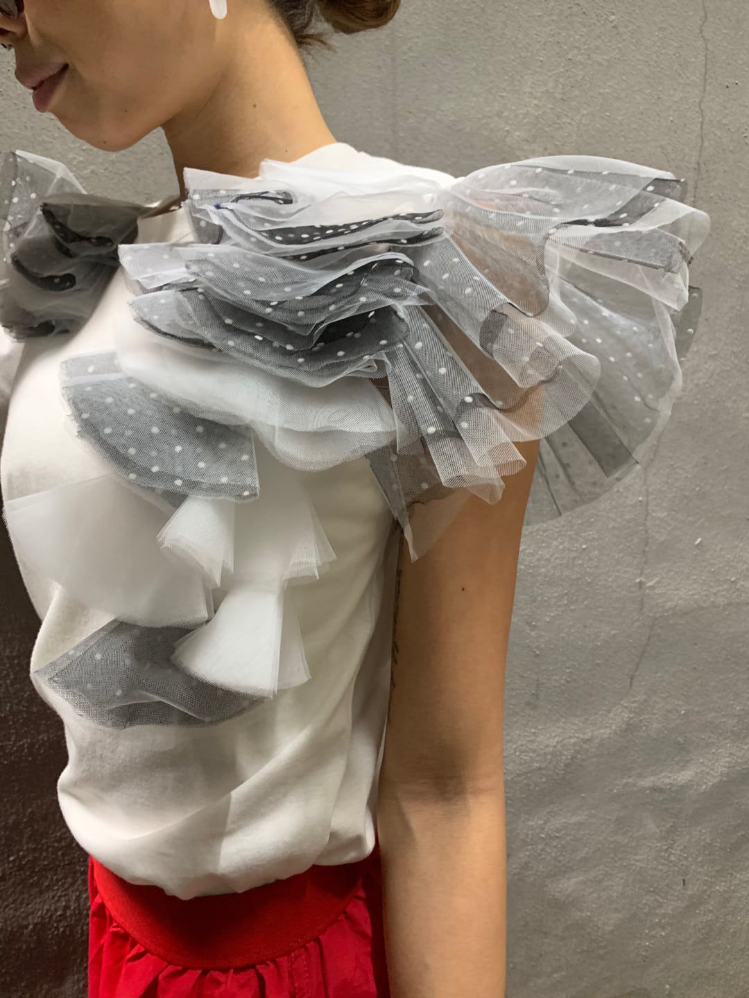 tulle frill design asymmetry tops トップス アシンメトリー フリル チュール ドット かわいい おしゃれ