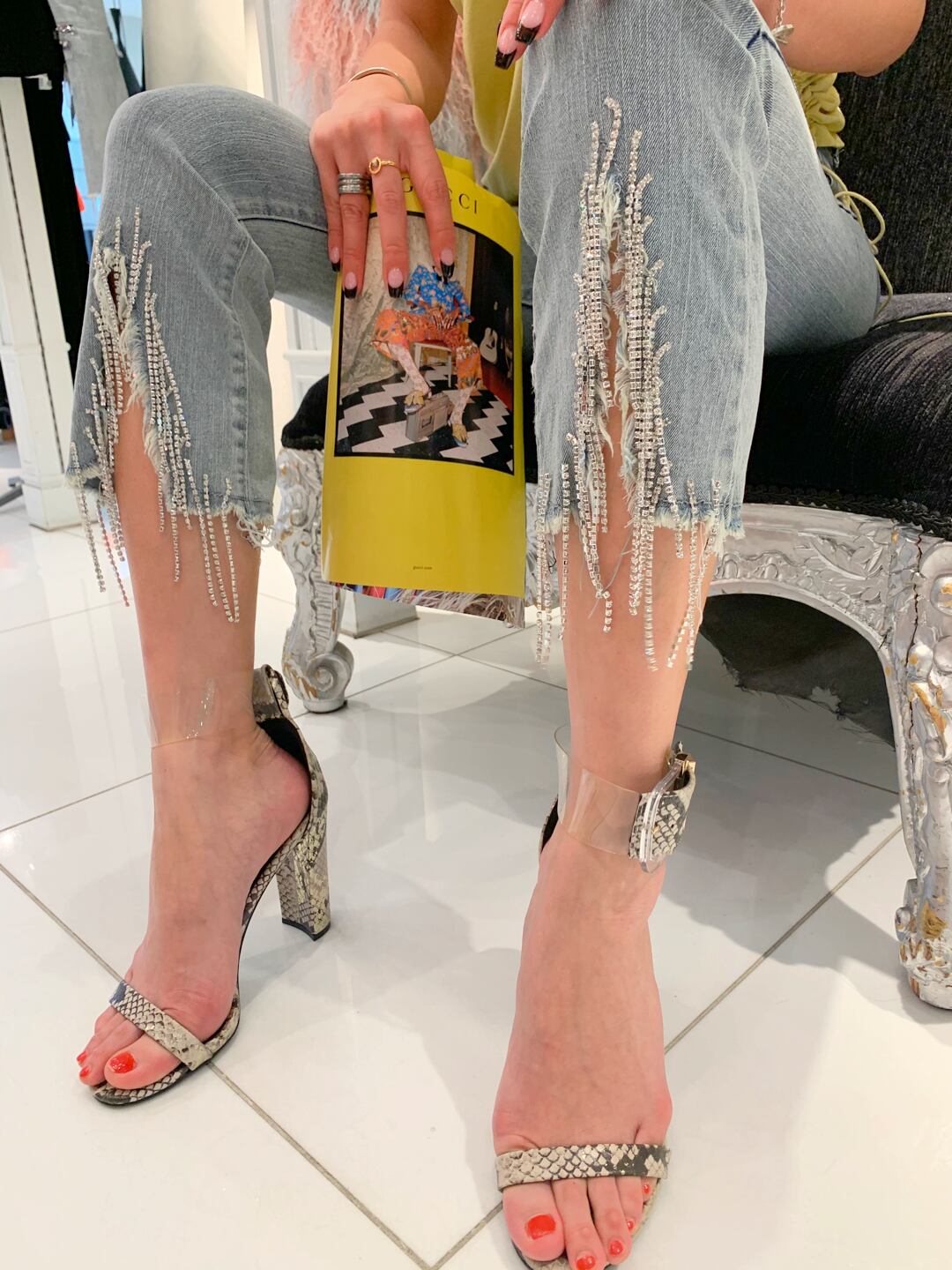 stone fringe flare denim pants カプリフレア デニム パンツ ラインストーン キラキラ カッティング 切りっぱなし ダメージ
