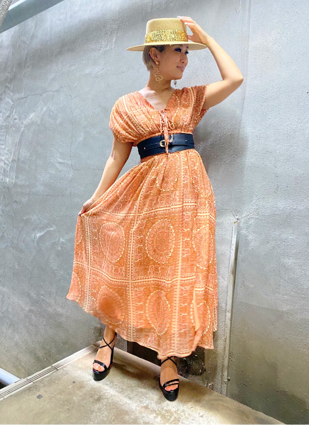 moroccan print chiffon long one-piece ワンピース ロングワンピ シフォン スリット入り レースアップ リゾート