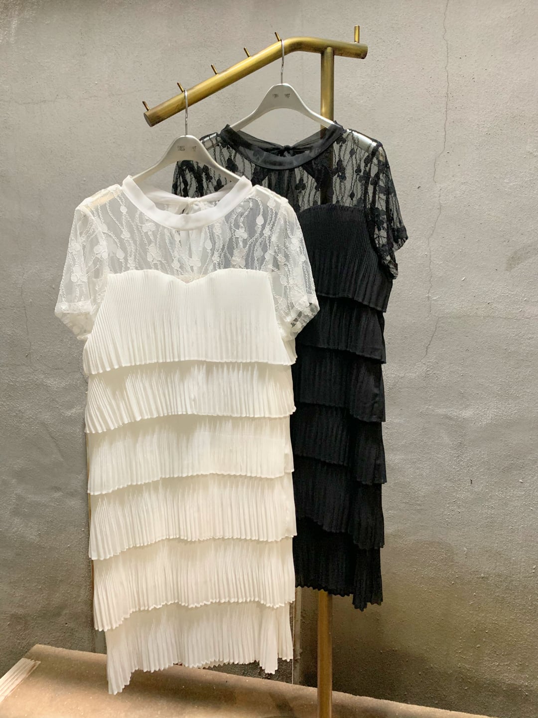 pleats chiffon lace one-piece プリーツ シフォン ティアードフリル レース 切替 トランプ リボン ワンピース