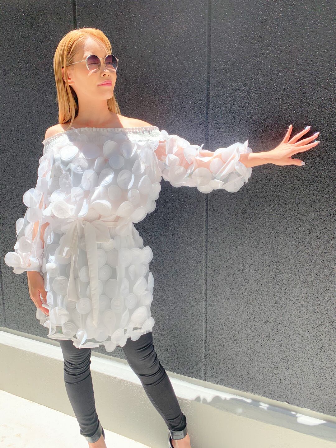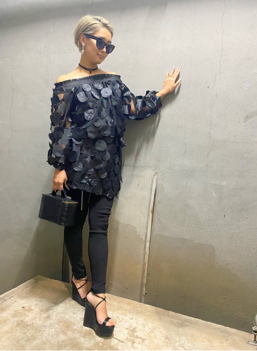 round patch off shoulder one-piece サークルモチーフ シースルー オフショルダー ミニ ワンピース リボンベルト