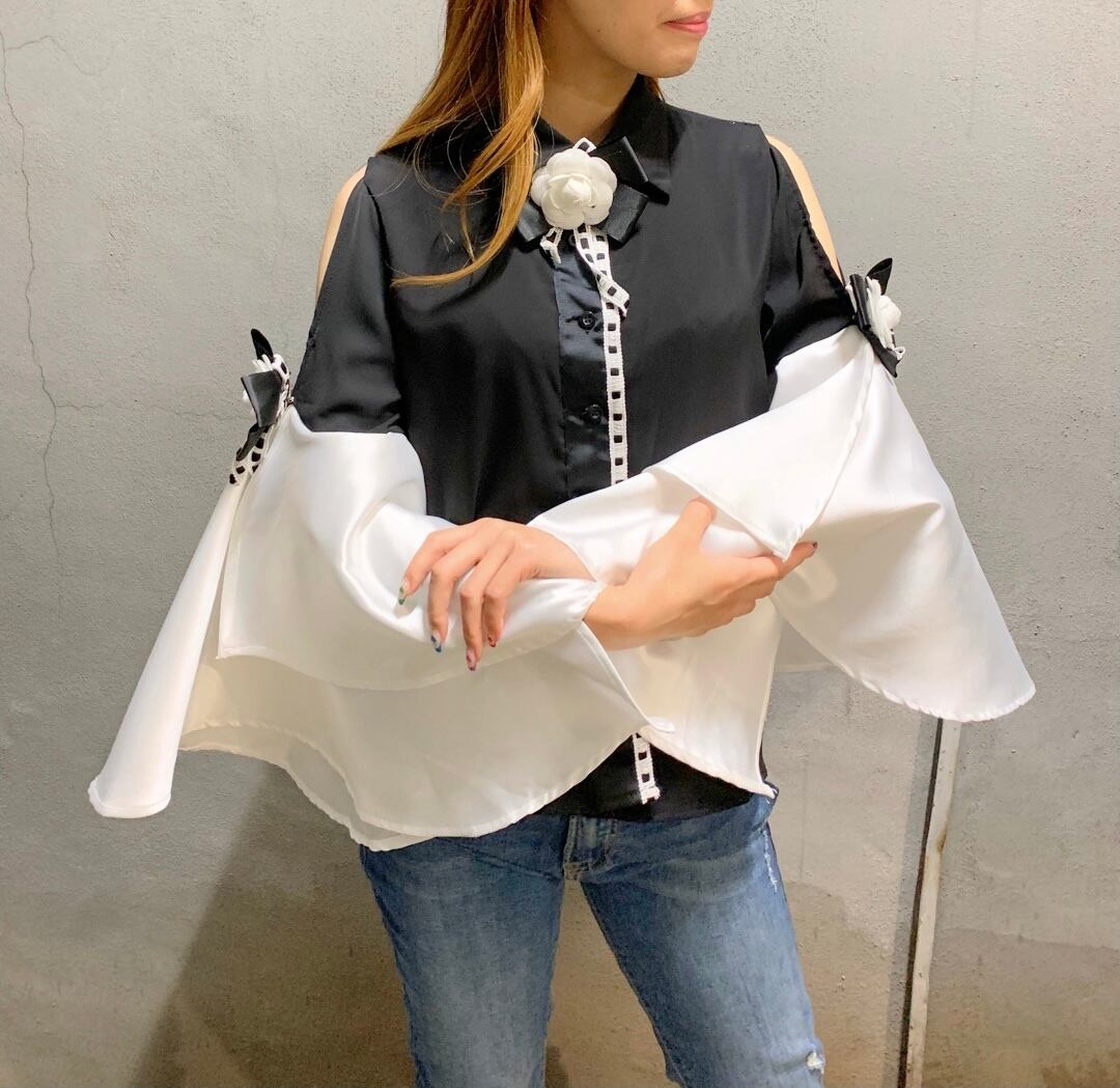camellia slit bell sleeve blouse ブラウス トップス ベルスリーブ カメリア ブローチ ボリュームスリーブ デザインスリーブ