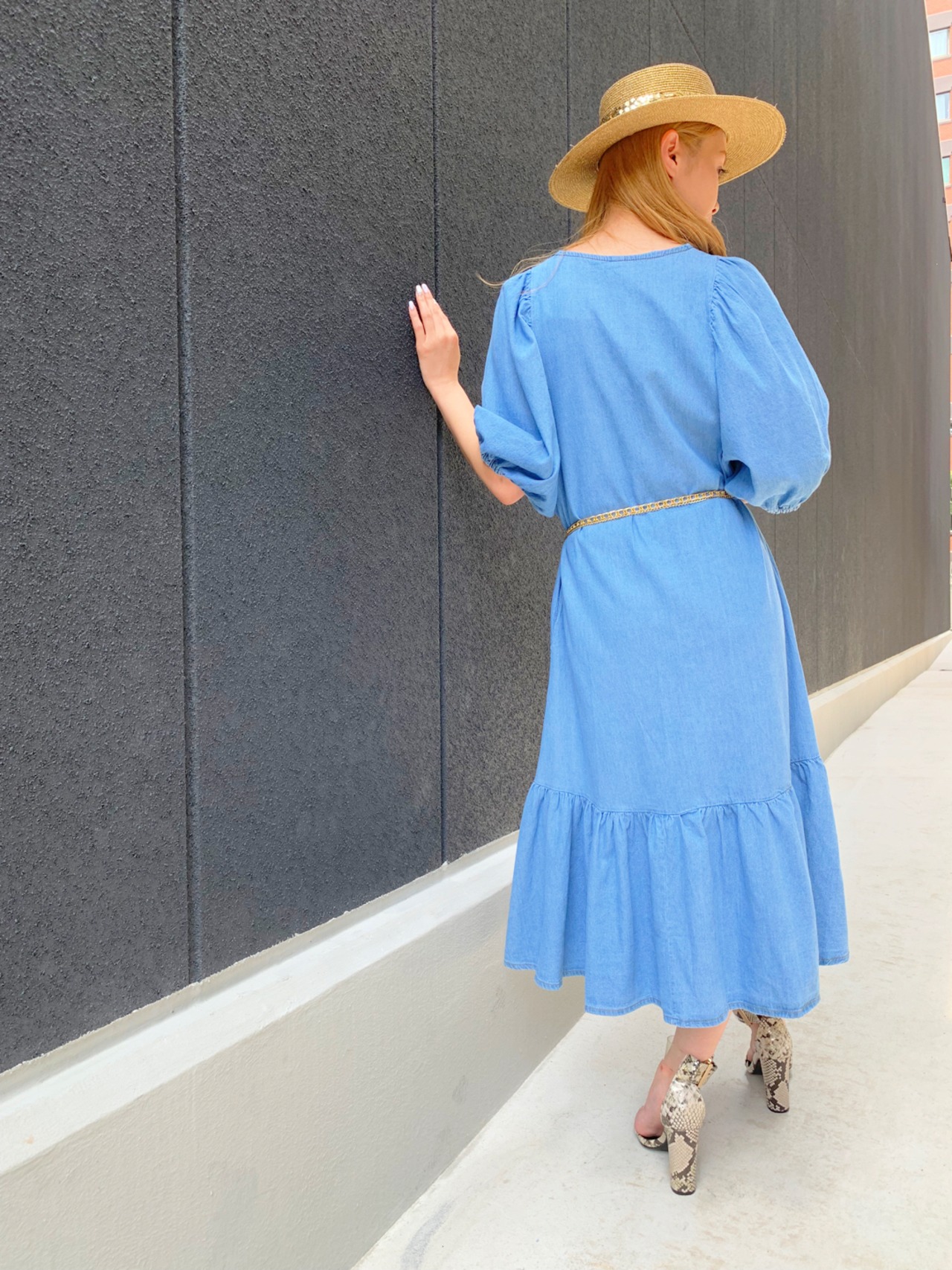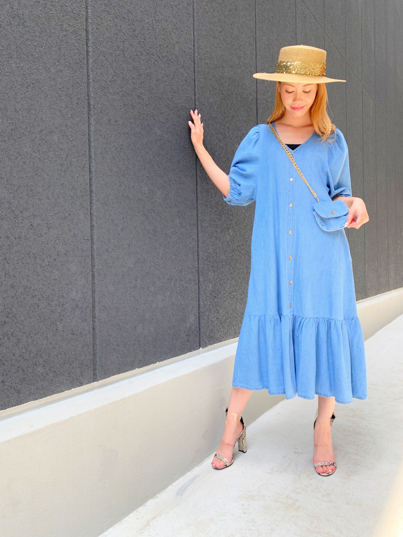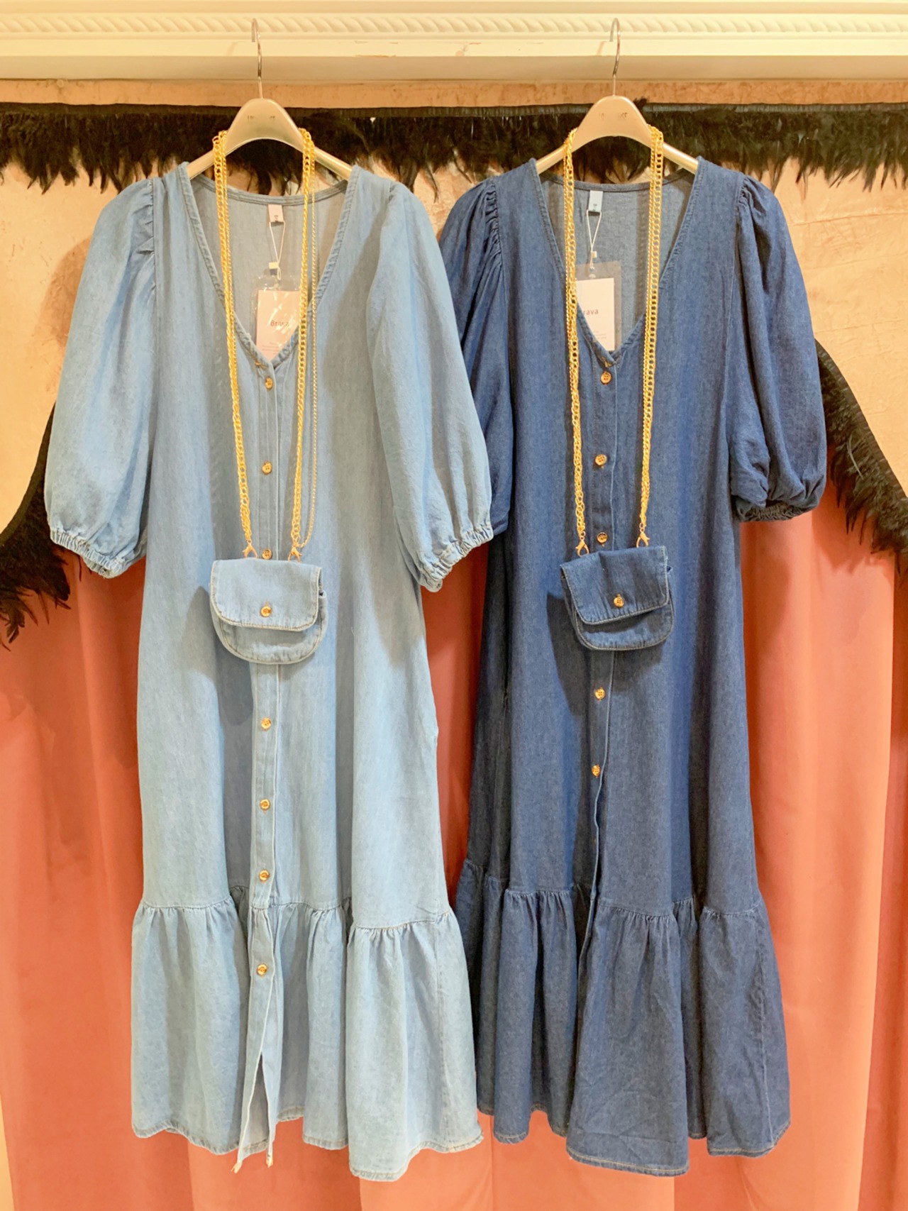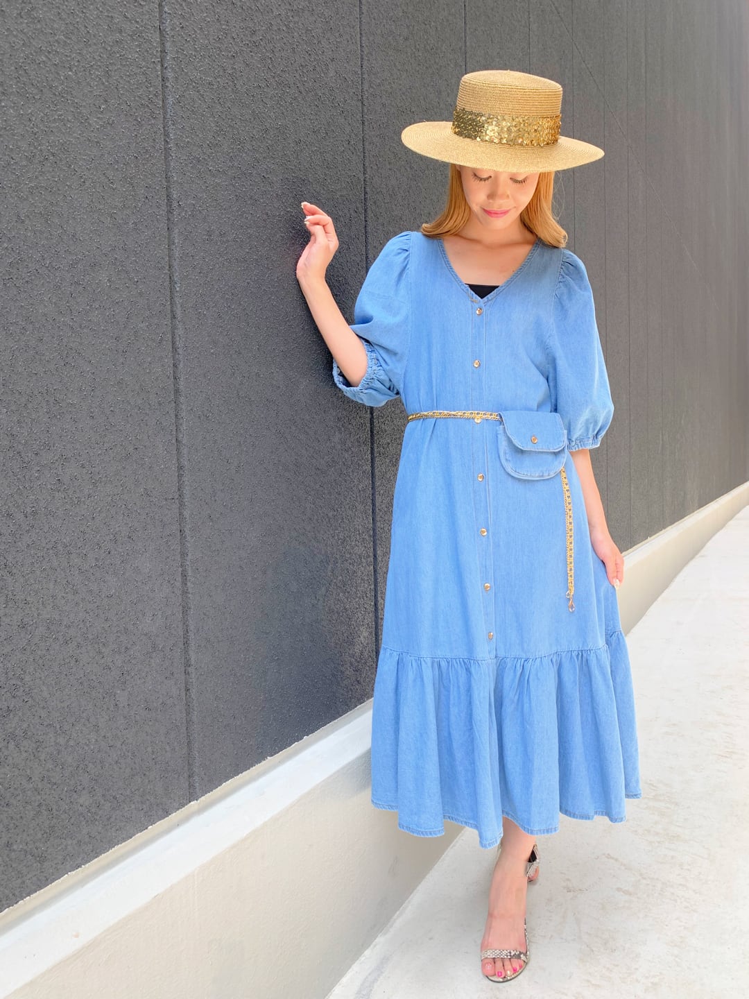 denim balloon sleeve one-piece(pochette set) デニムワンピ ワンピース デニム ポシェット付き ゴールドチェーン