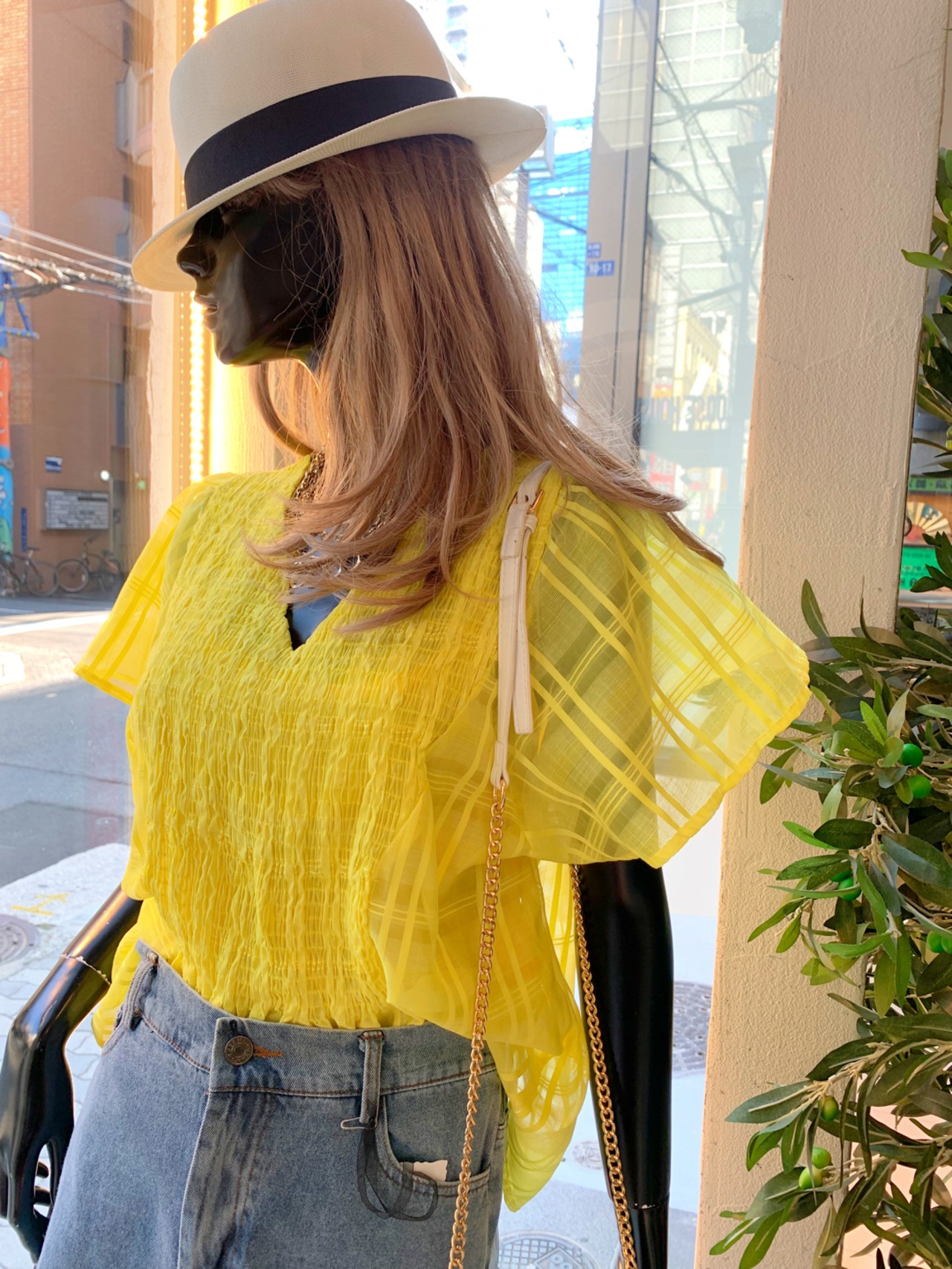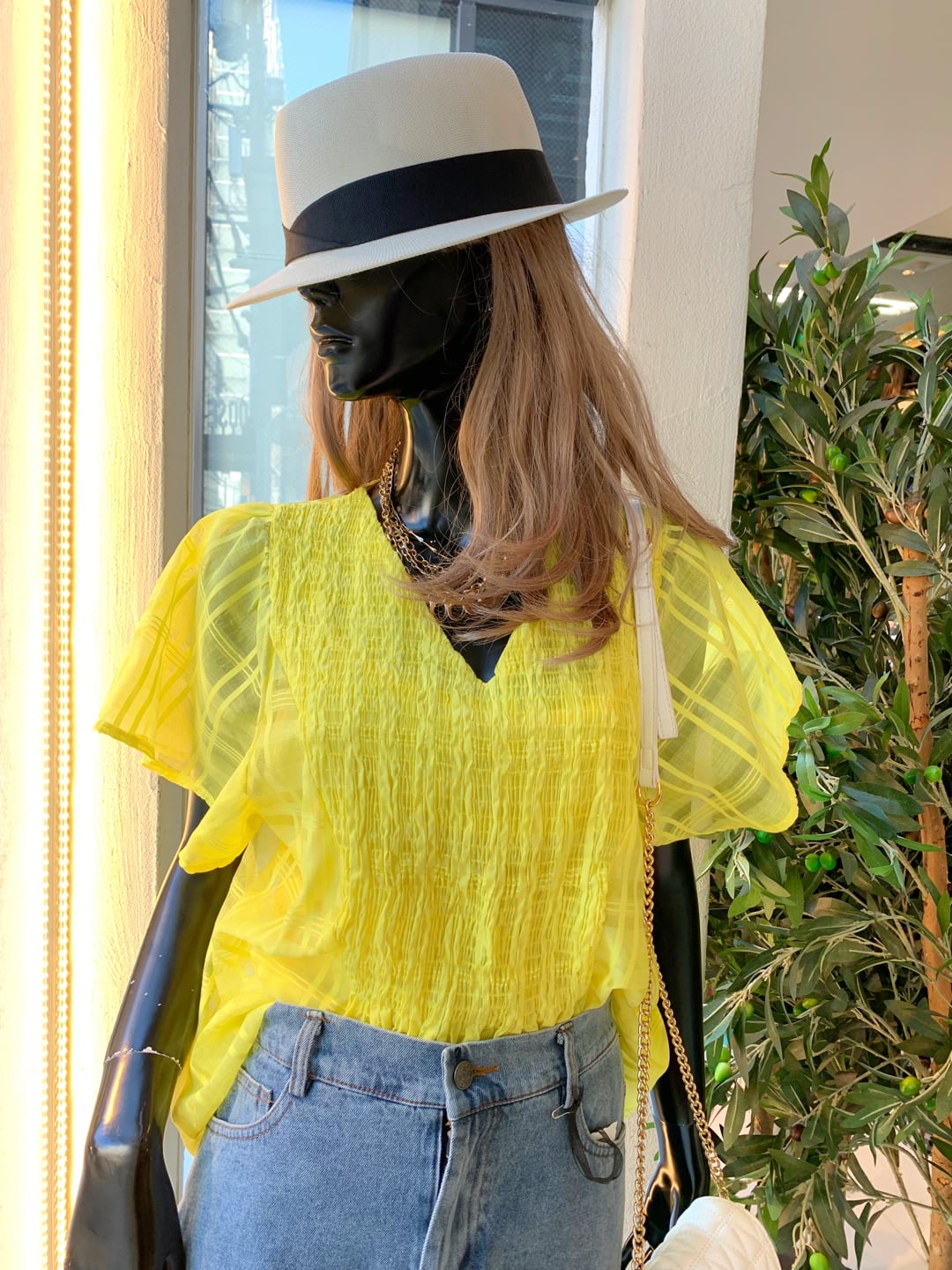 check pattern chiffon shirring Vneck tops トップス チェック シースルー シフォン Vネック
