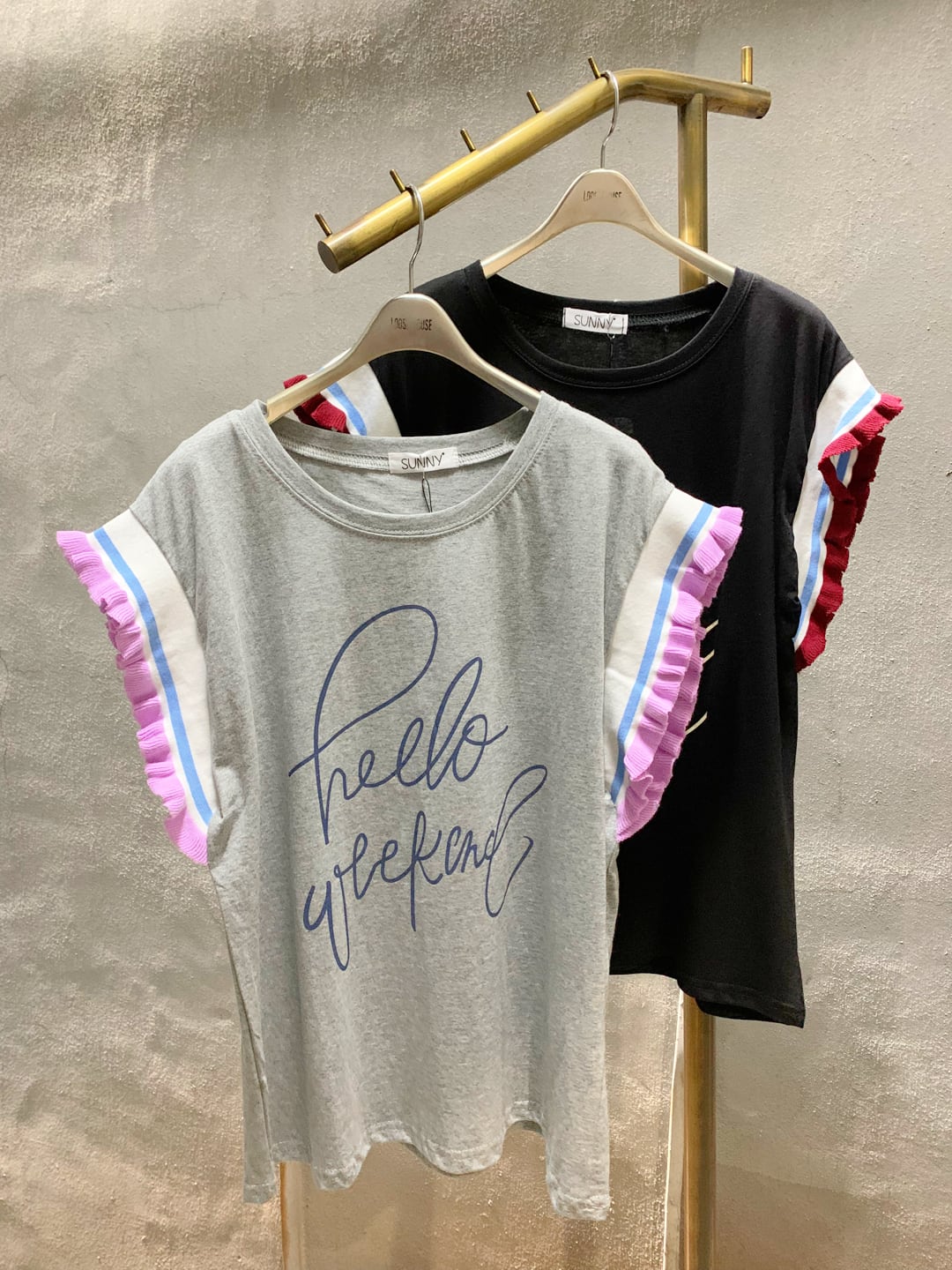 bi-color frill arm T-tops トップス Tシャツ フリルスリーブ 配色 バイカラー