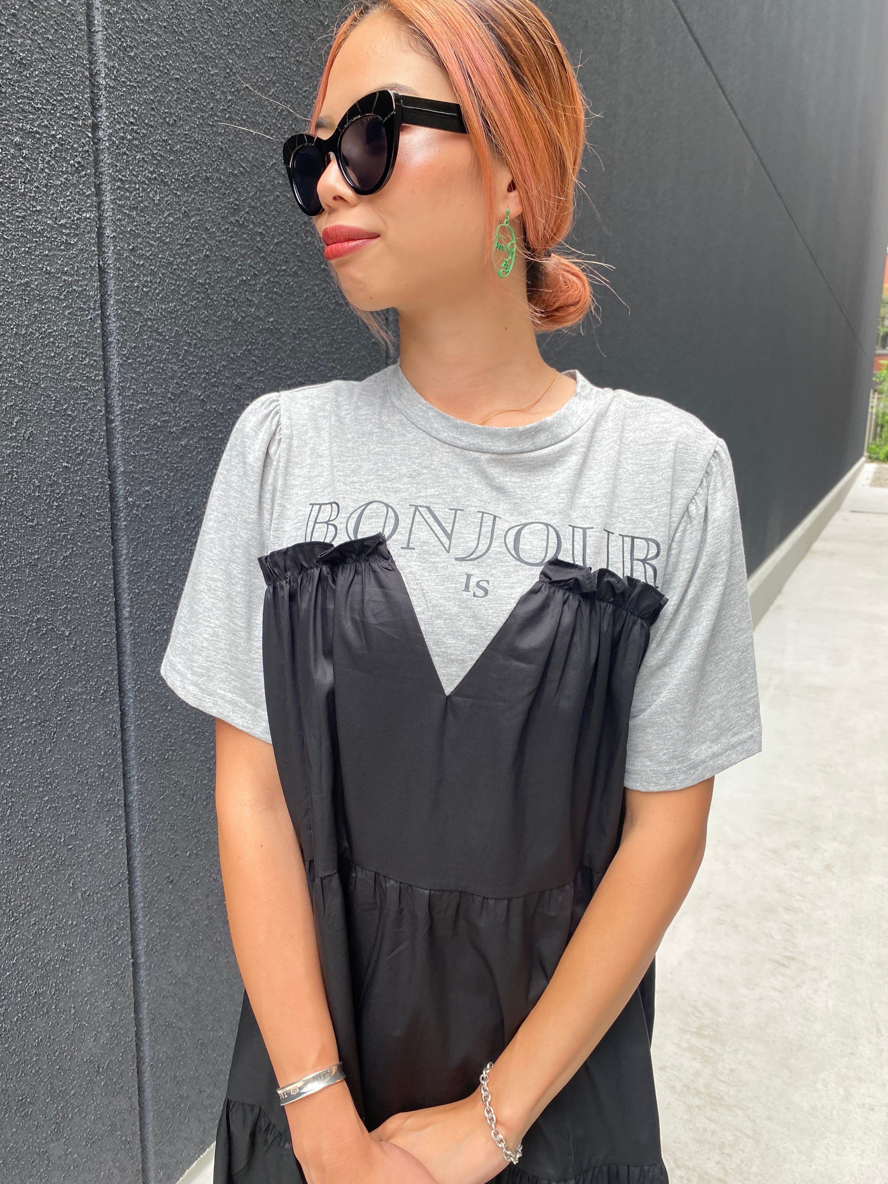 〝bonjour〟プリントTシャツに、ティアードワンピがドッキング♪