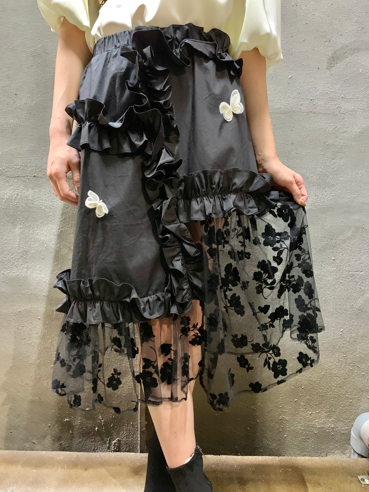 butterfly broach frill trimming gather skirt スカート フリル レース チュール 透け感 シースルー 黒