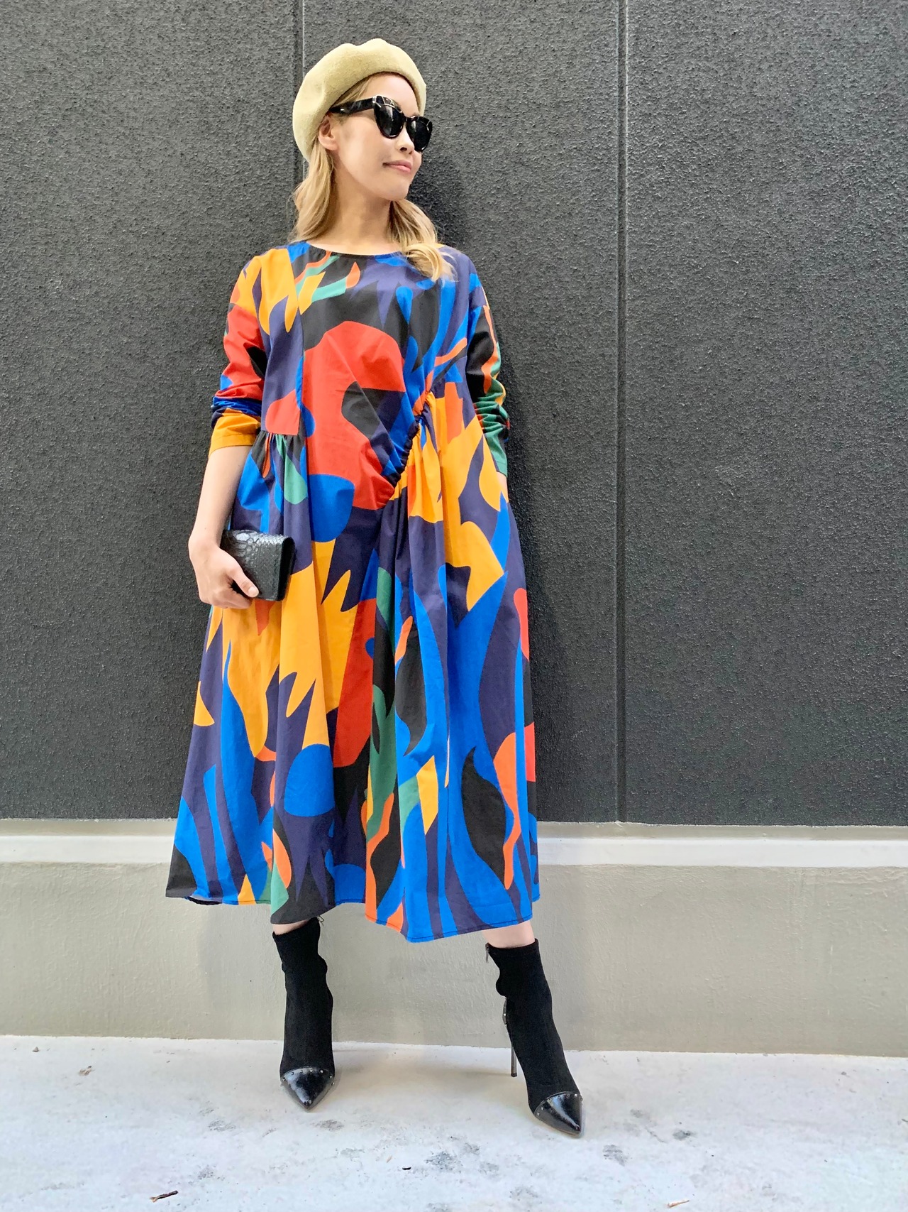 print gather change loose-fit one-piece ワンピース ワンピ 柄ワンピ カラフル ロングスリーブ 体型カバー