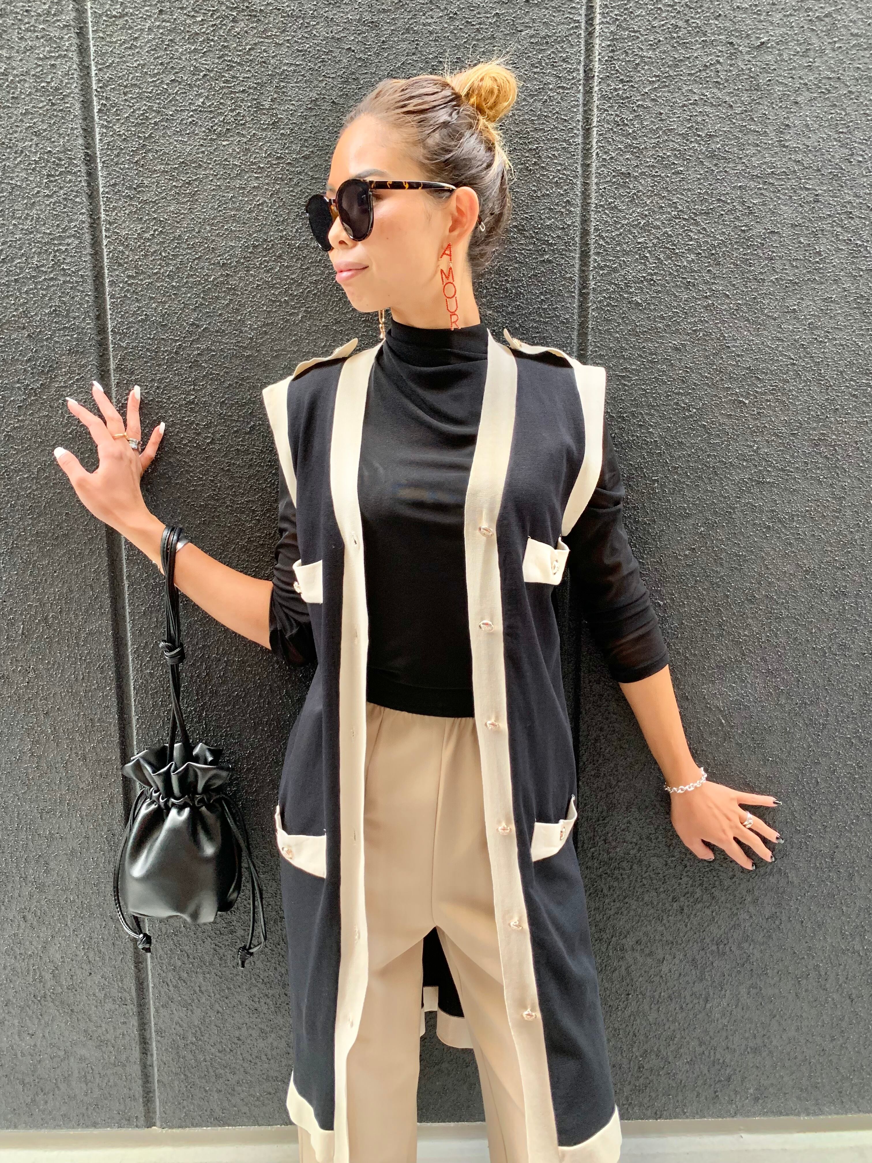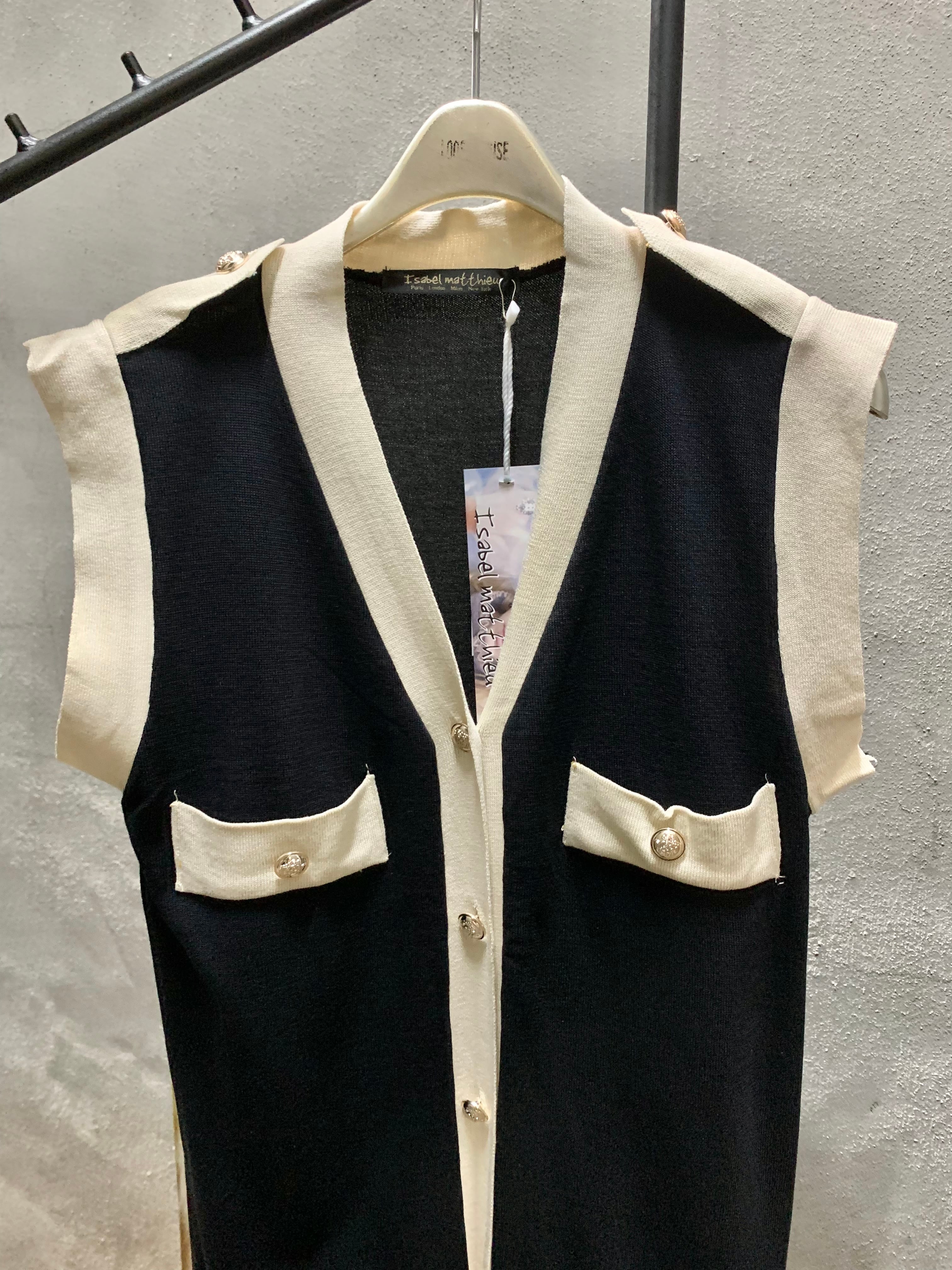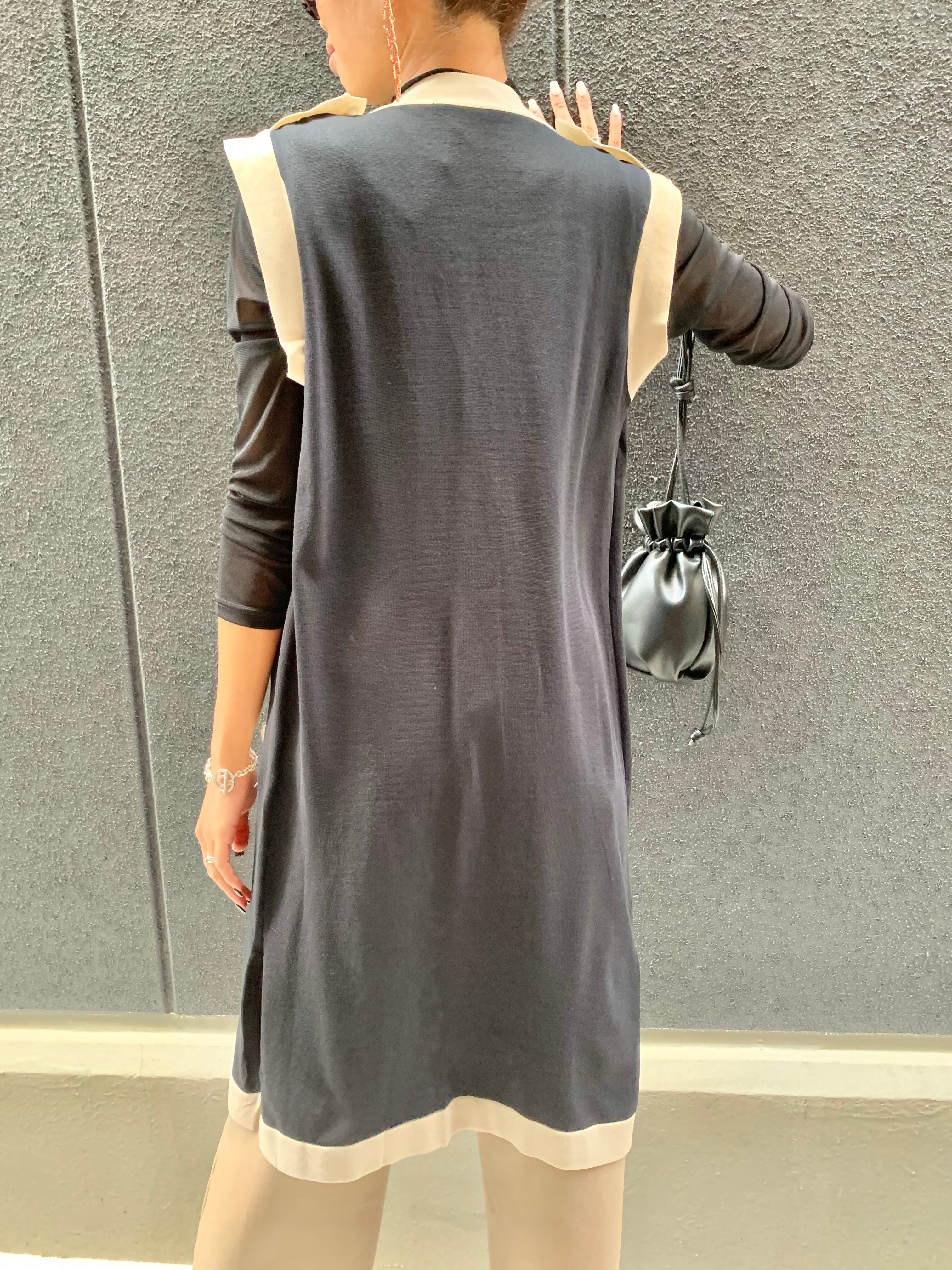 bi-color trimming knit long vest one-piece ニット ロングジレ ベスト ロングベスト ワンピース バイカラー 金ボタン