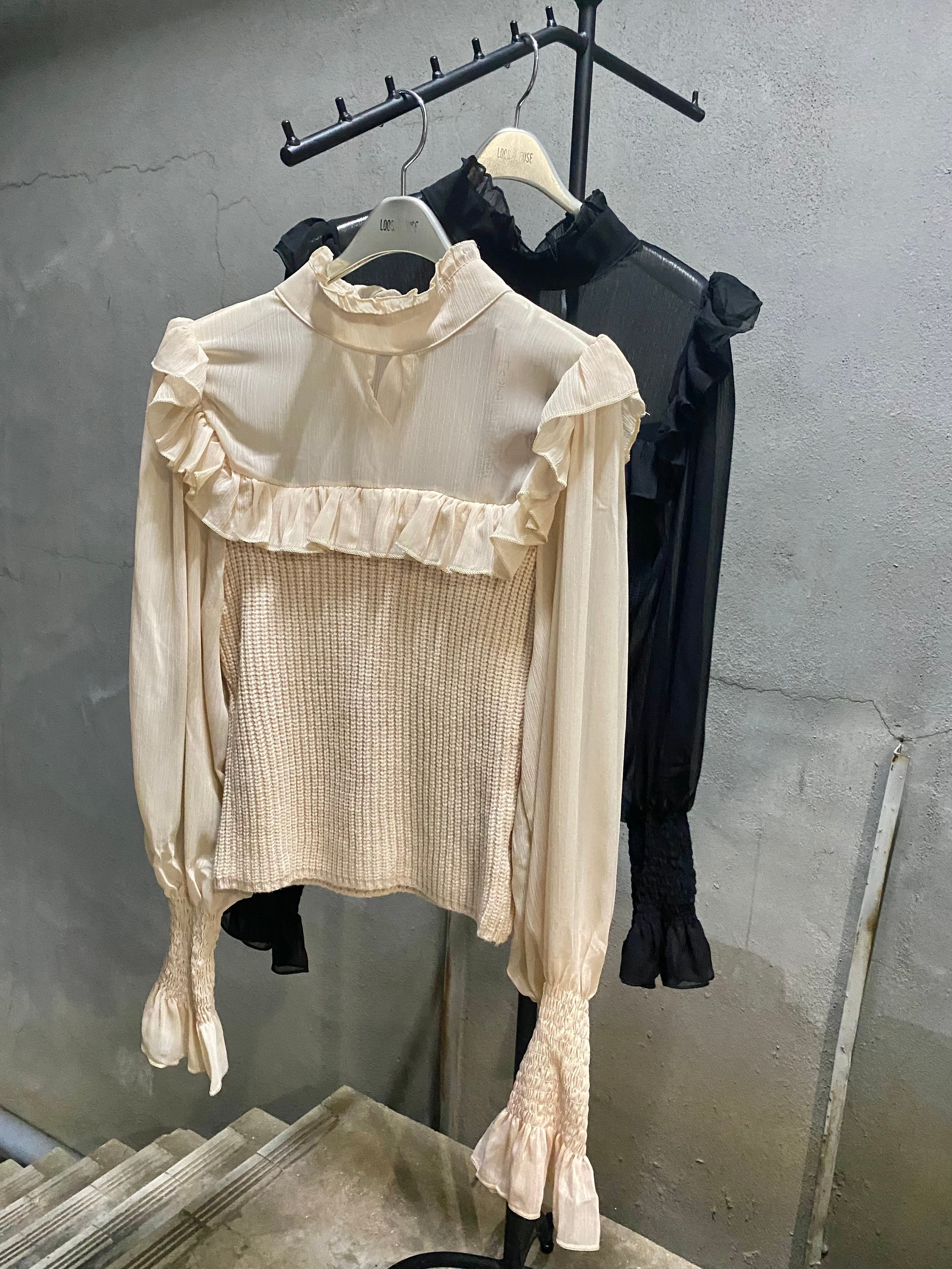 chiffon knit tops シフォン切替ニットトップス シフォンデコルテデザイン リブニット シースルー リボン トップス