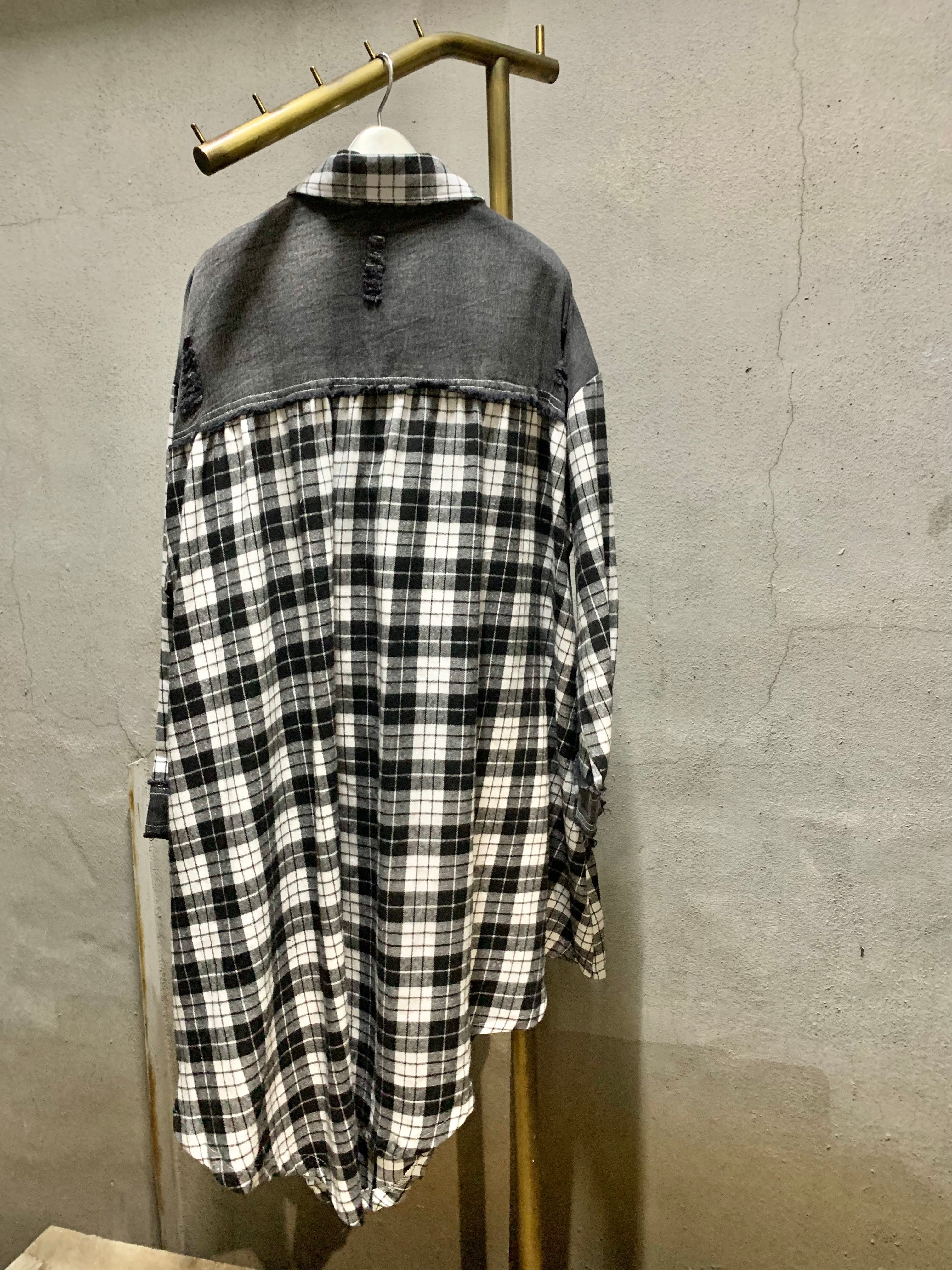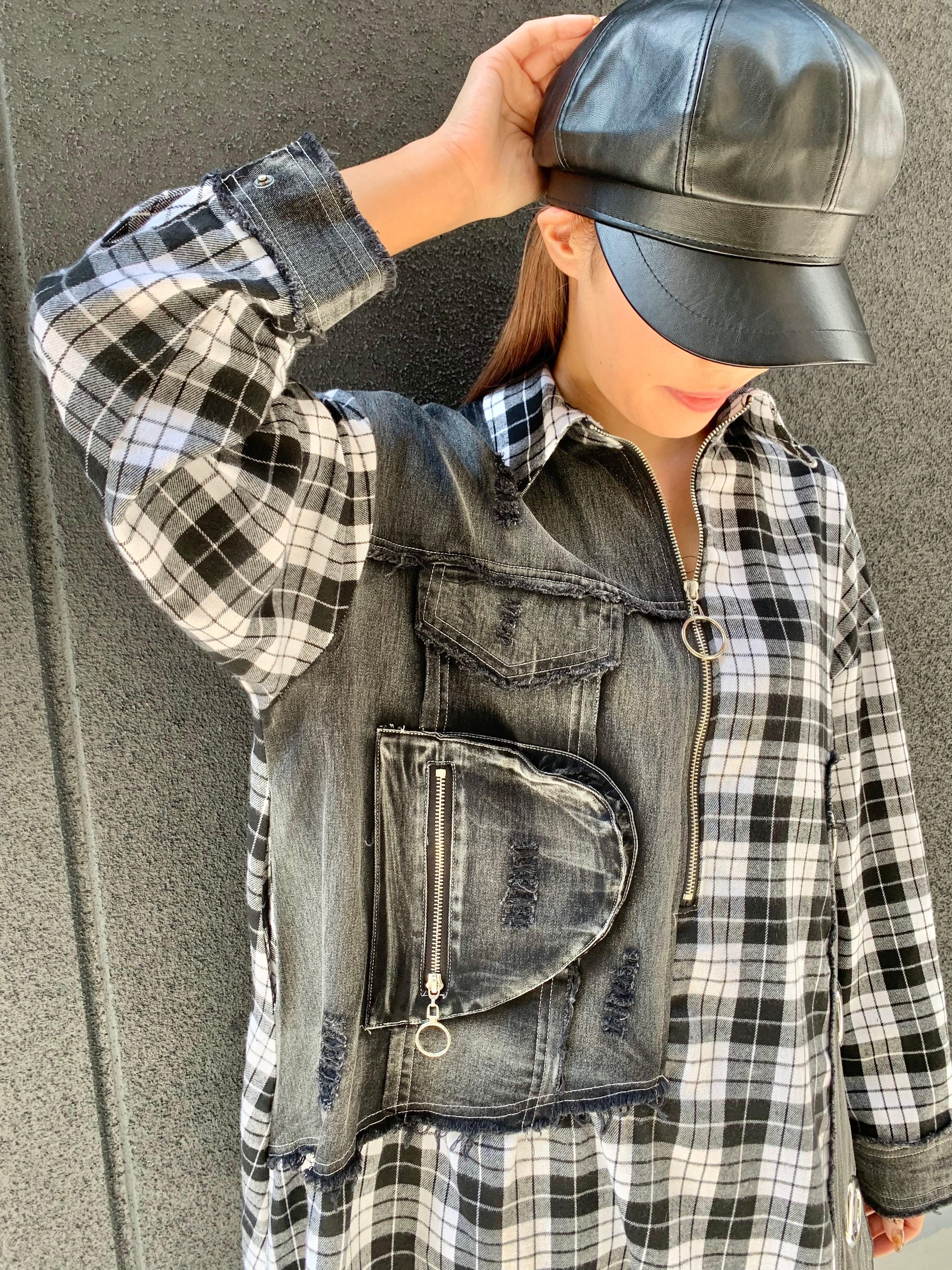 ブラックデニムとチェックの切替が
