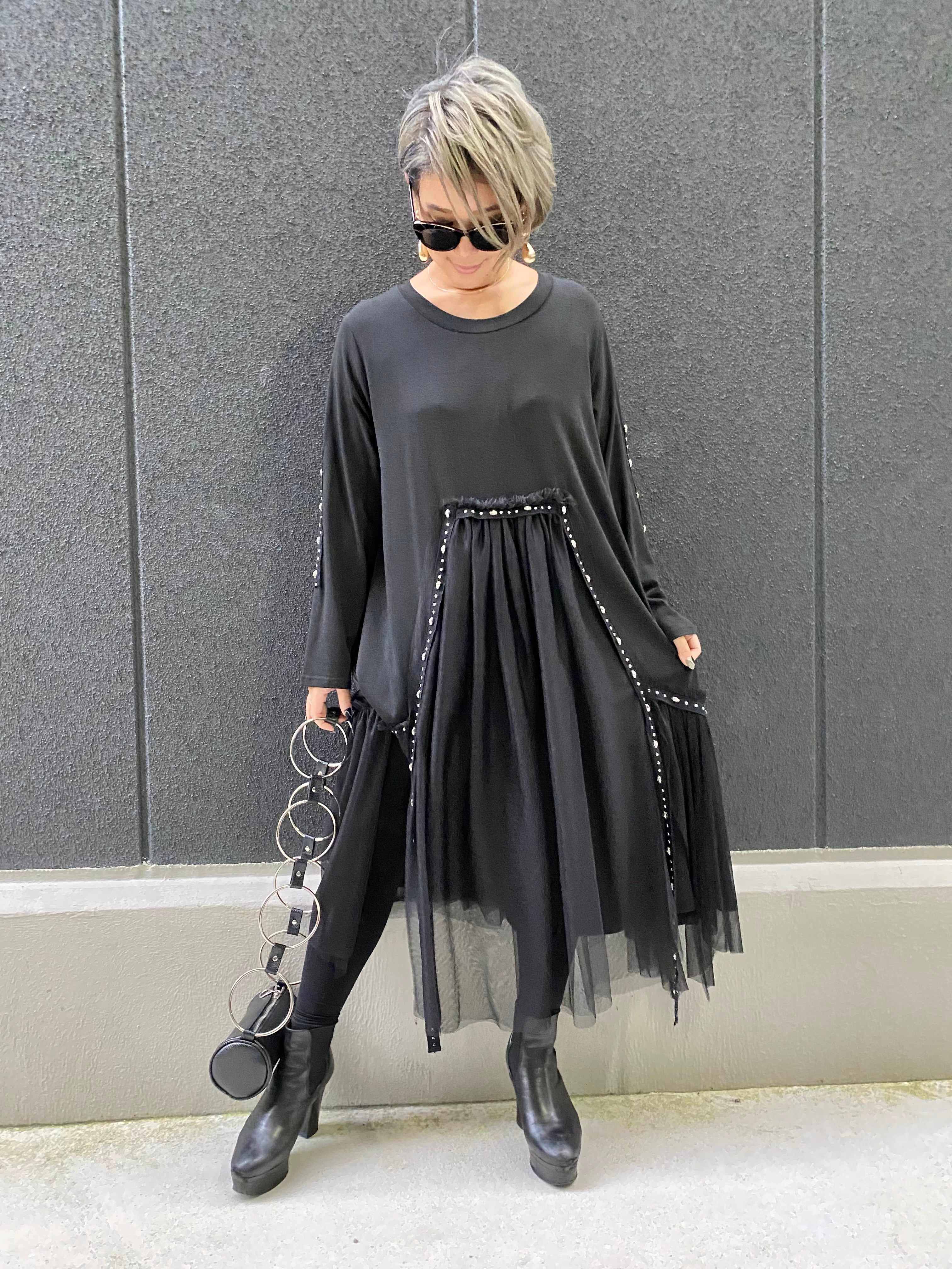 different fabrics mix scull studs one-piece ワンピース ワンピ 異素材 スカル スタッズ チュール