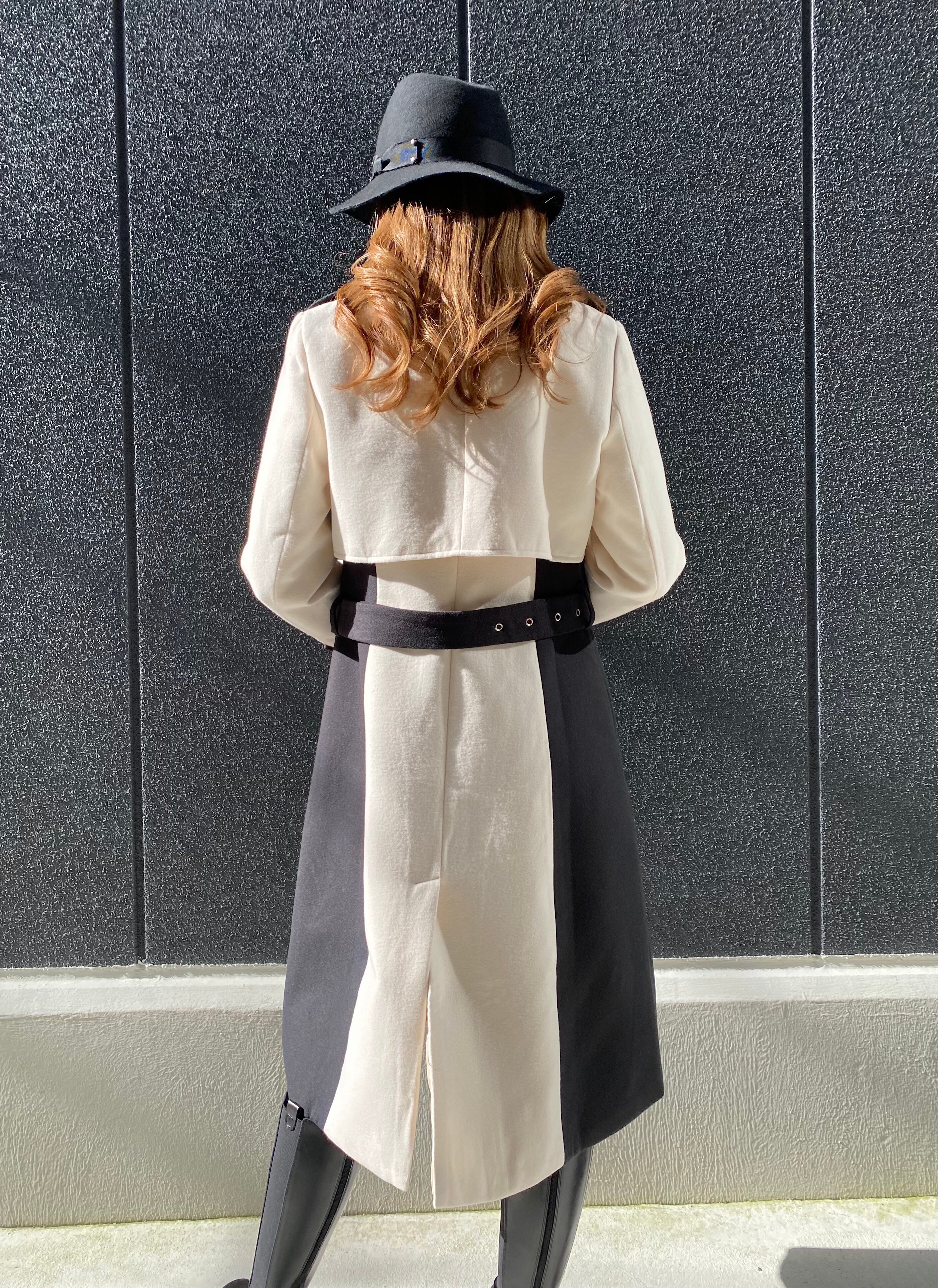 bi-color change belted long coat バイカラー 配色 切替 ベルト付 ロング コート モノトーン COOL