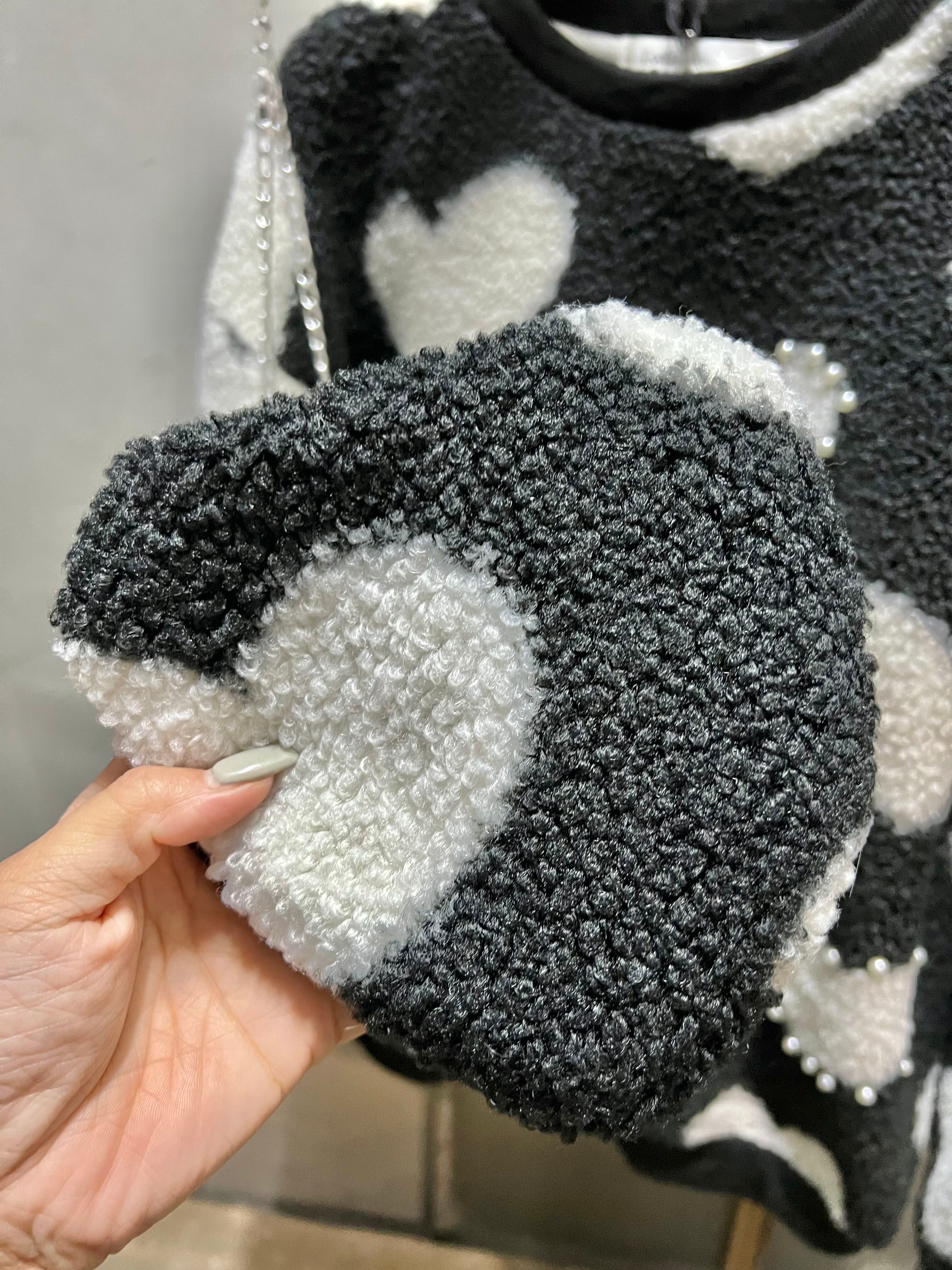 heart boa pearl trimming pullover トップス プルオーバー ハート ボア もこもこ パール ポシェット付き 2点セット