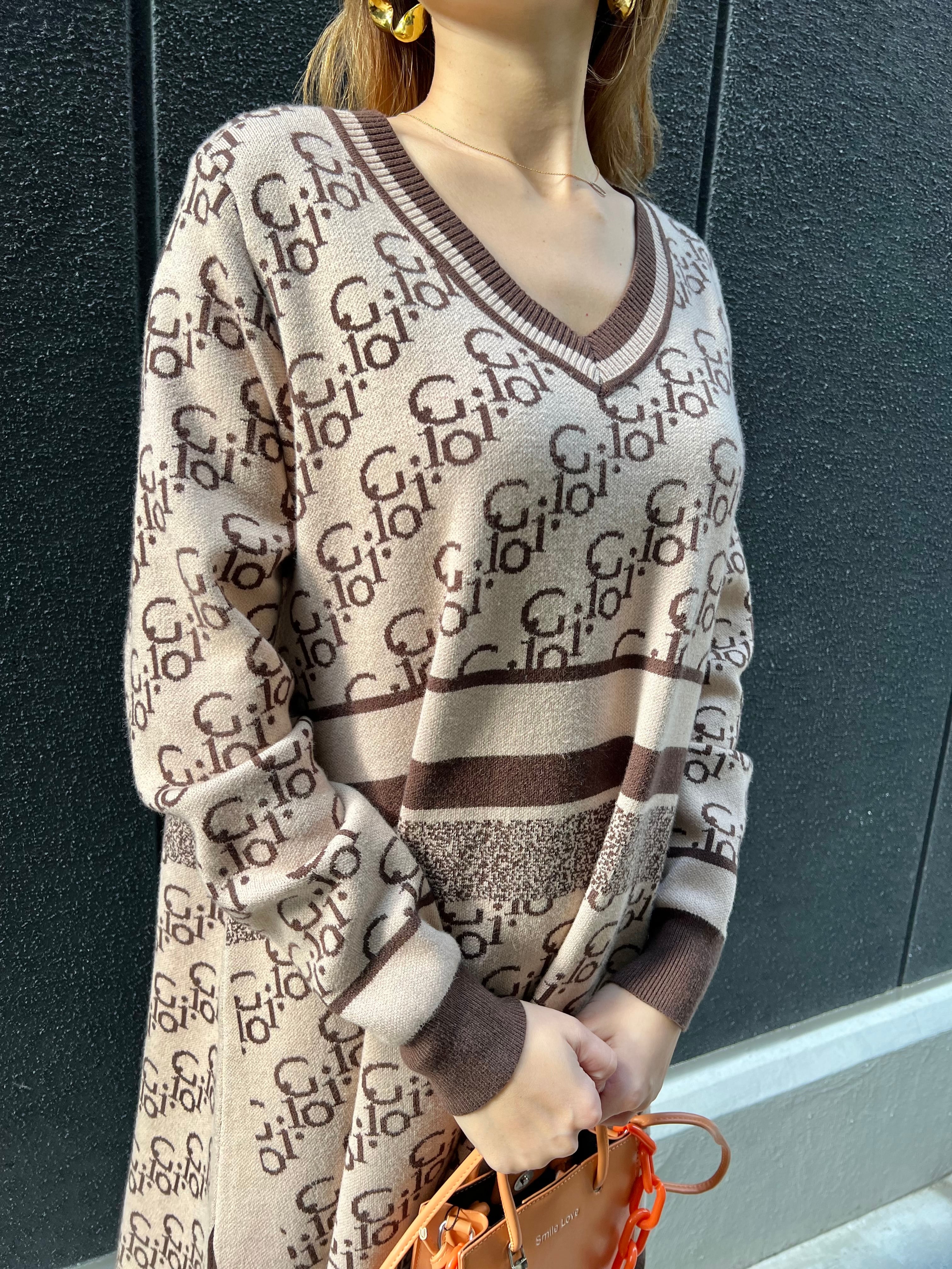 monogram print jacquard knit V-neck one-piece ニット ワンピース モノグラム プリント Vネック スリット