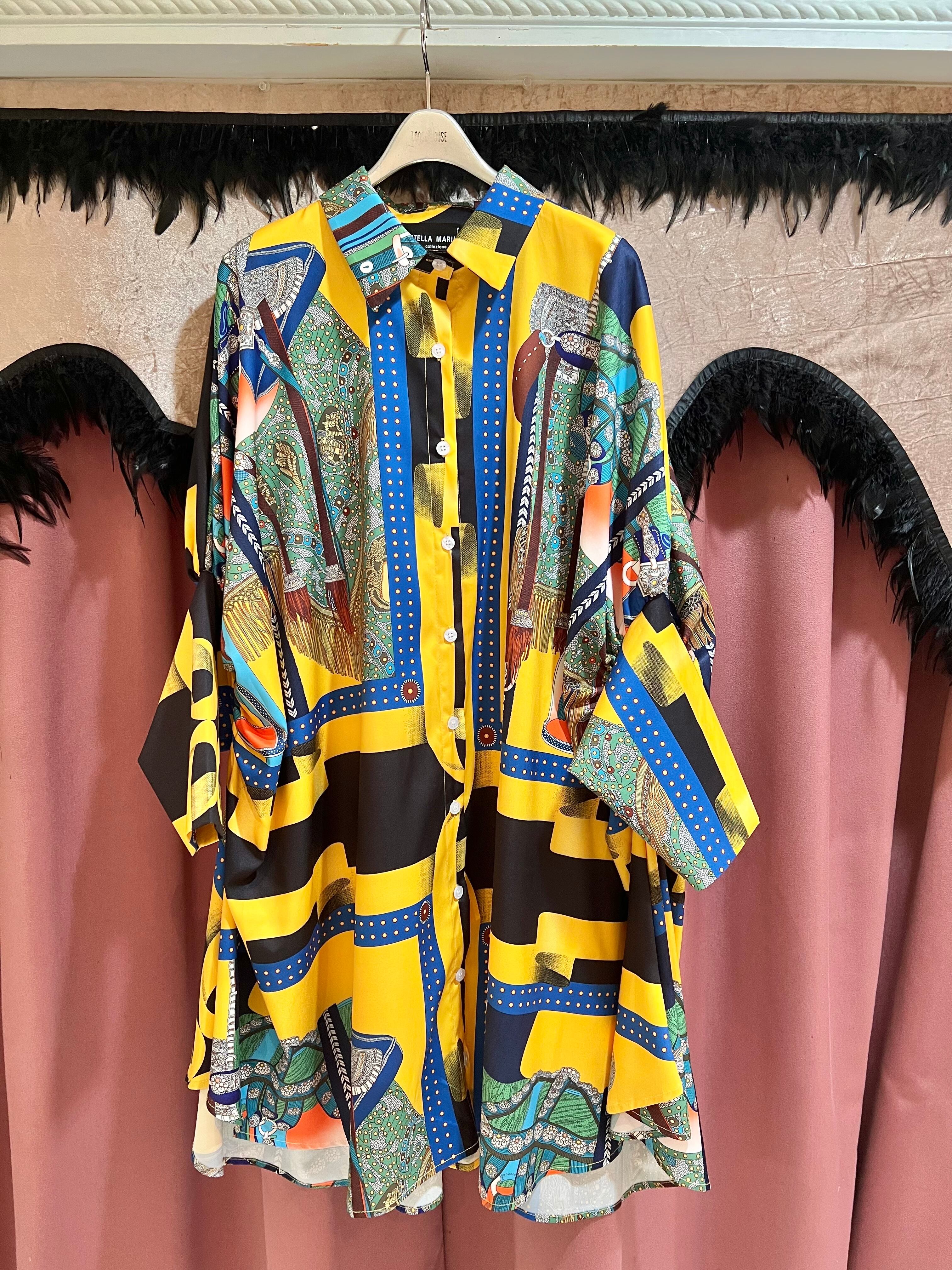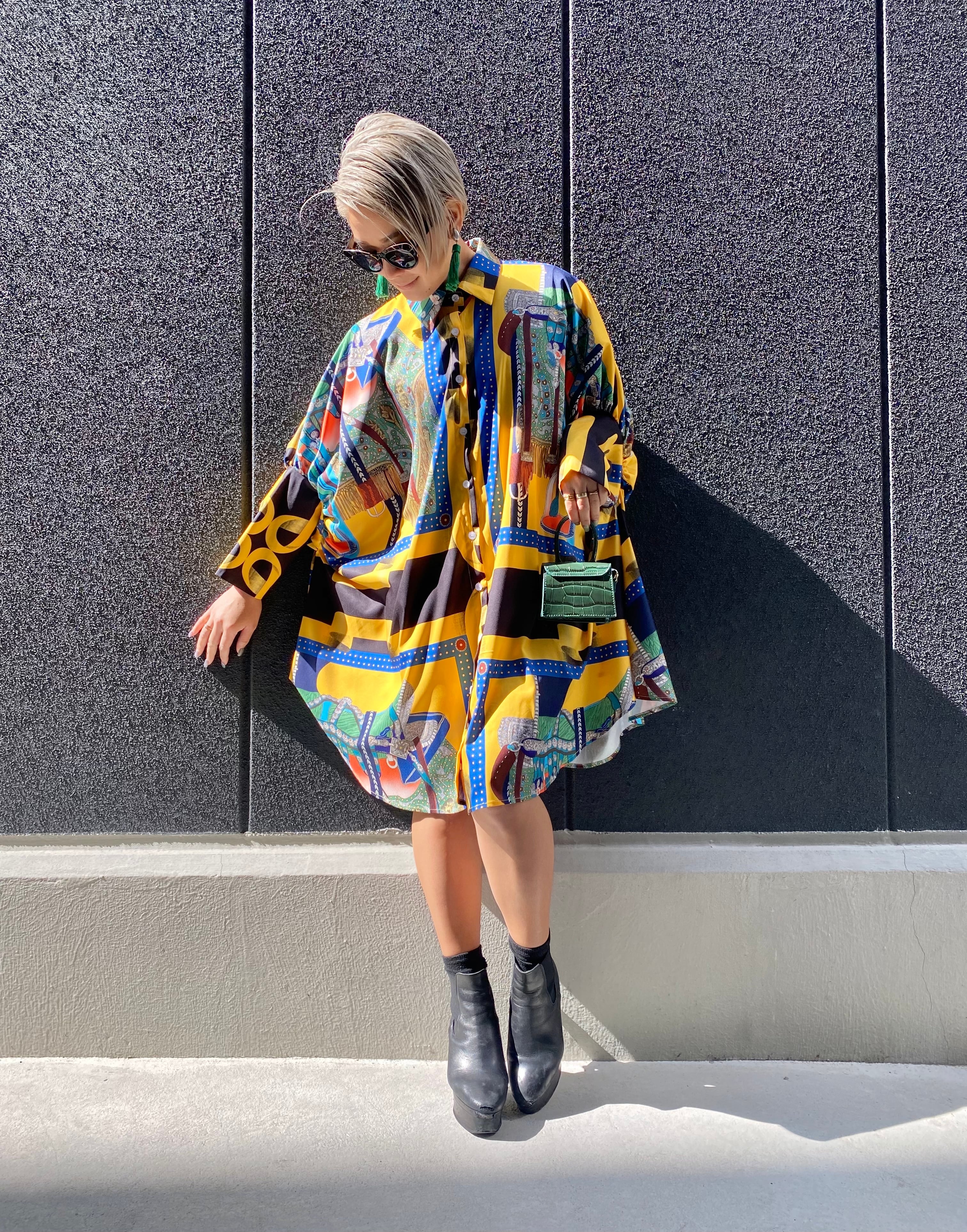 【再入荷】scarf print flare shirt one-piece ワンピース ワンピ 柄ワンピ スカーフ カラフル シャツワンピ