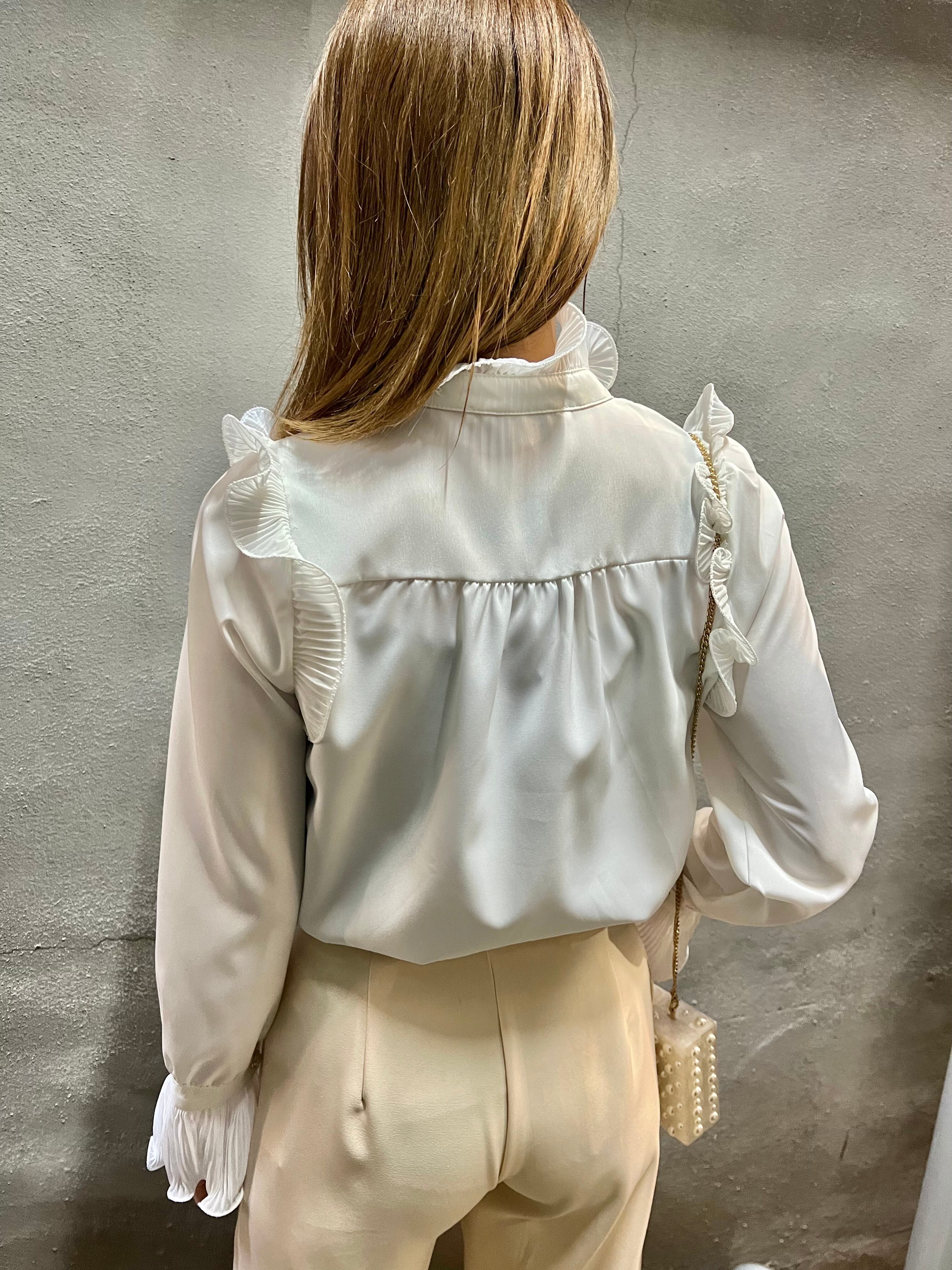 pleats ruffle pearl button frill shirt blouse シャツ トップス ブラウス フリル パールボタン きれいめ