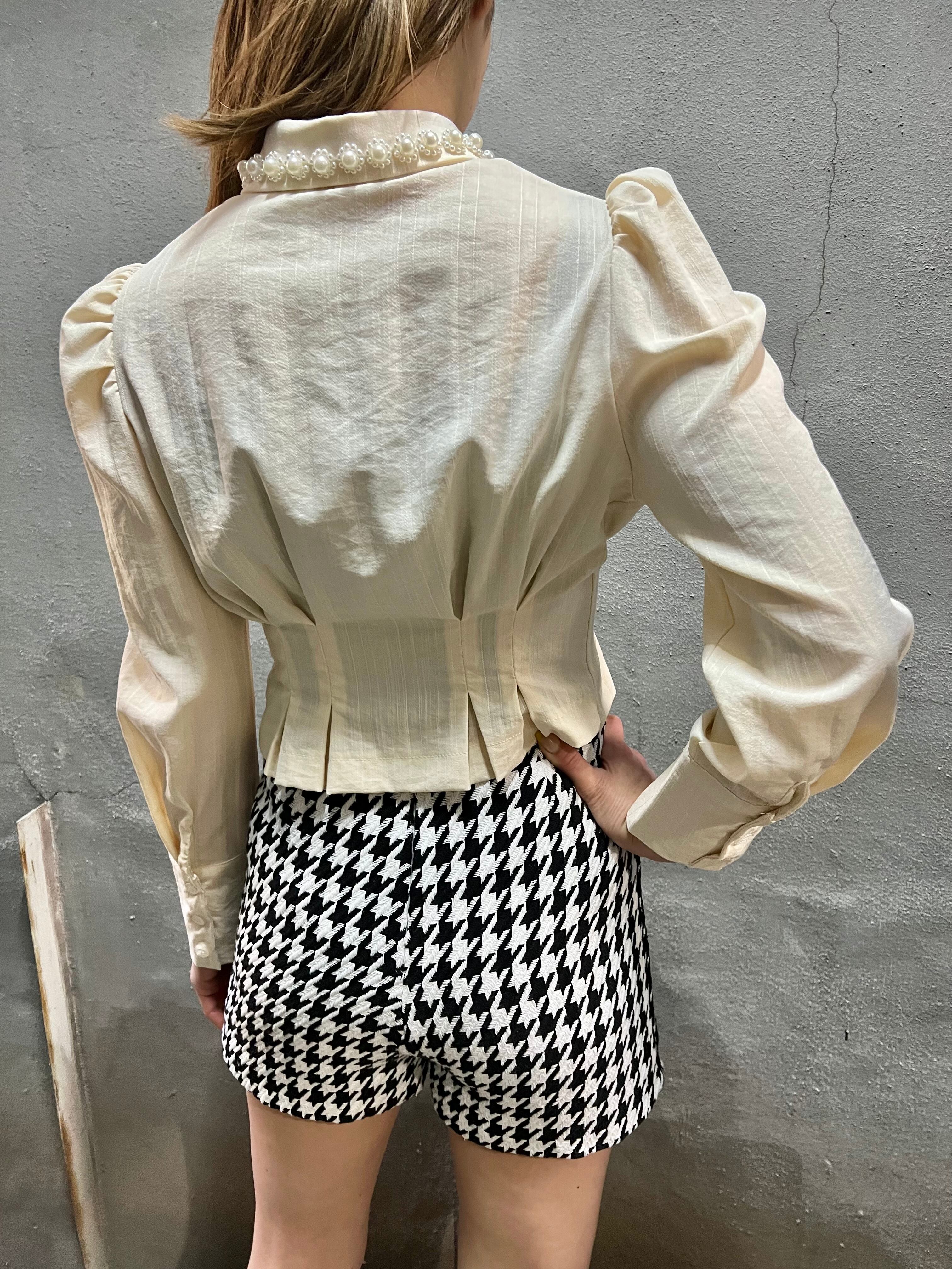 pearl bijou collar tuck waist shirt blouse シャツ ブラウス パール ビジュー タック ショート丈